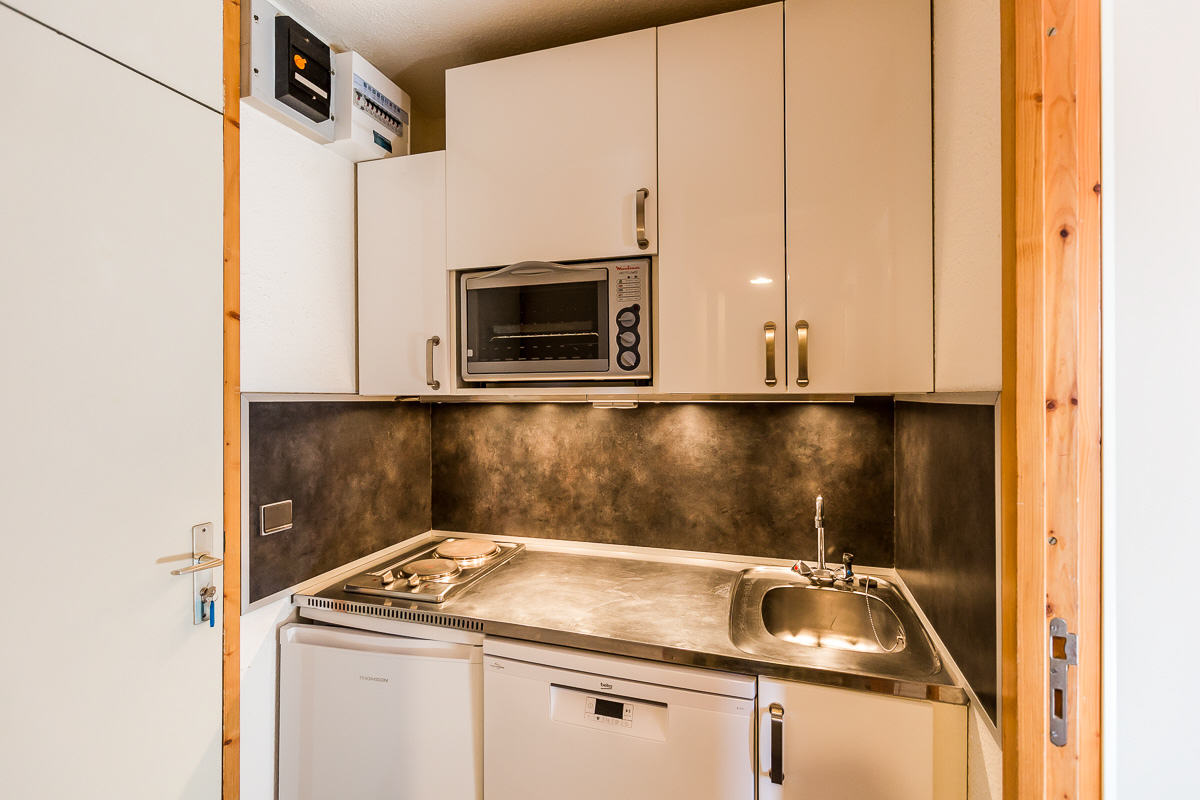 Studio divisible d'une surface d'environ 24m², en bon état, équipé pour 3 personnes, exposé ouest avec balcon au 5ème demi-niveau, vue forêt.