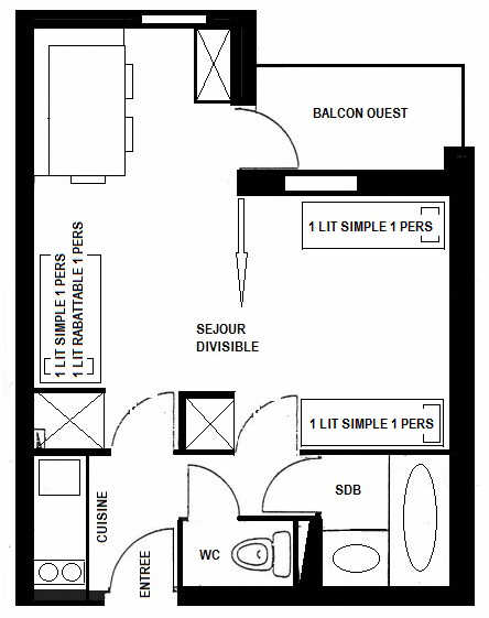 Séjour divisible avec d'un côté un lit simple et de l'autre 2 lits simple (80). TV écran plat.