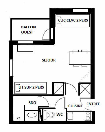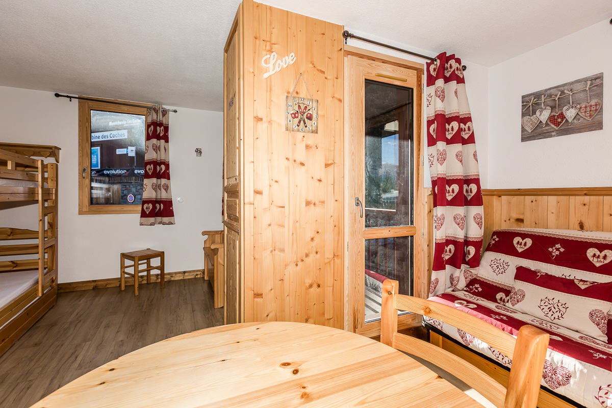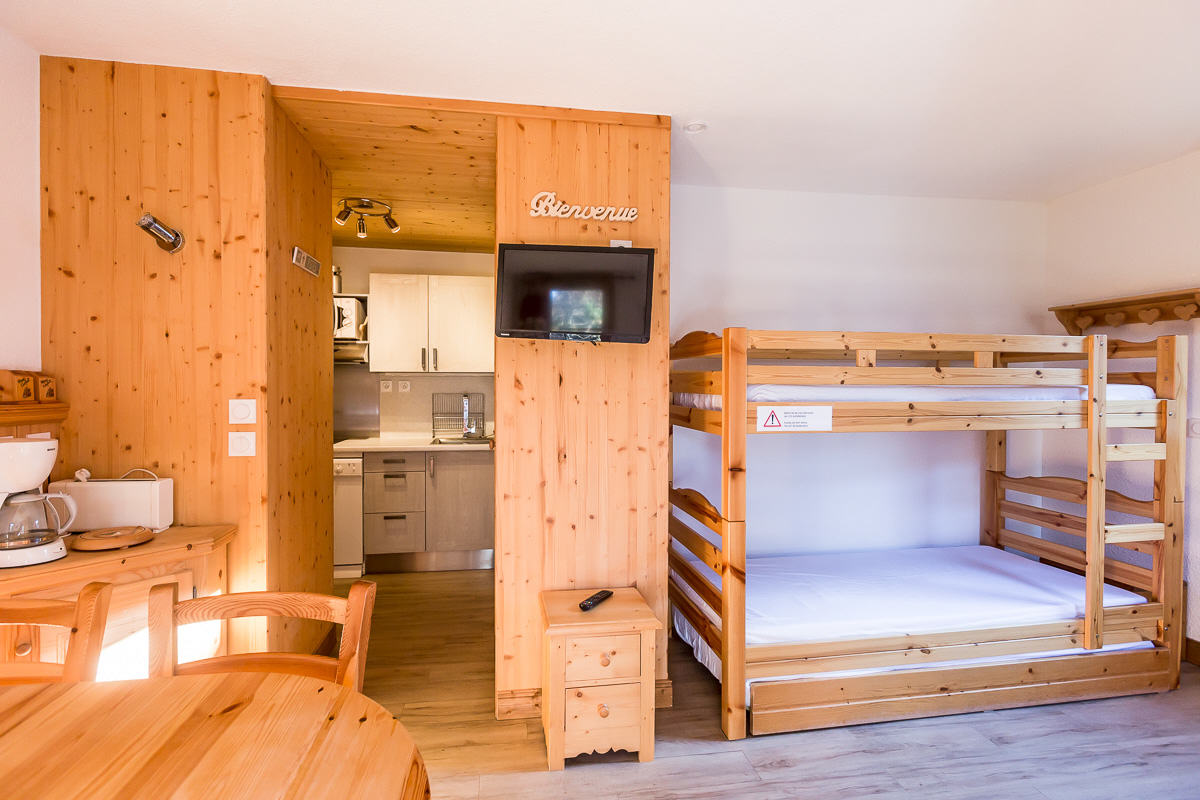 Studio d'une surface d'environ 24m², équipé pour 4 personnes, entièrement rénové, exposé ouest avec balcon au 2ème demi-niveau.
