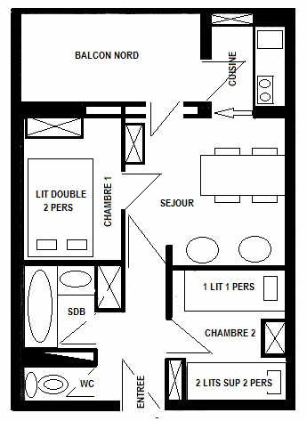 Appartement 2/3 pièces équipé pour 4/5 personnes d'environ 32 m² entièrement rénové, exposé nord avec balcon, vue montagne, au niveau 1.