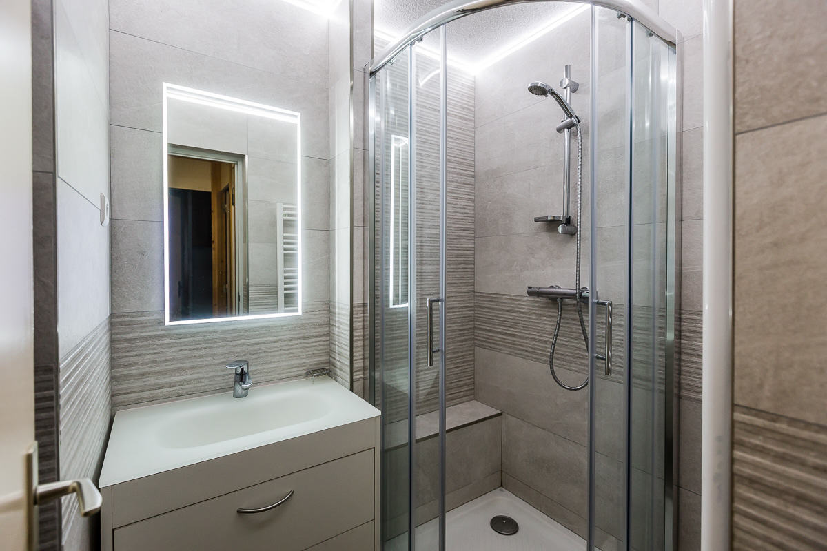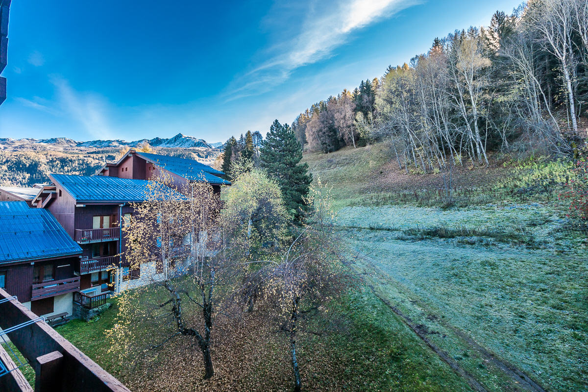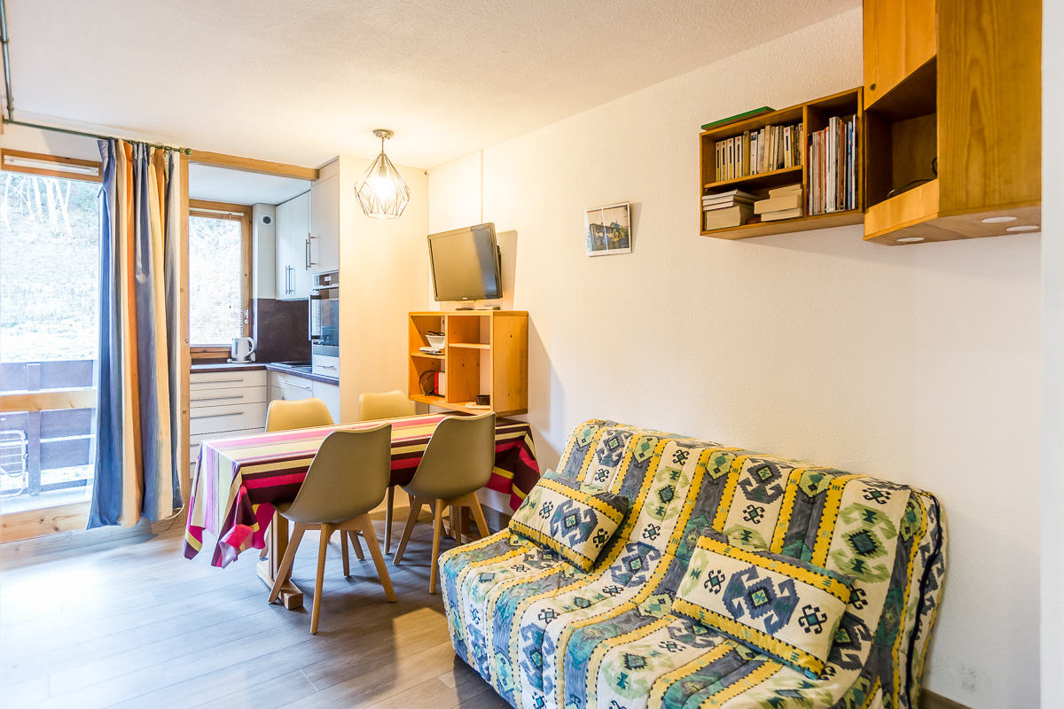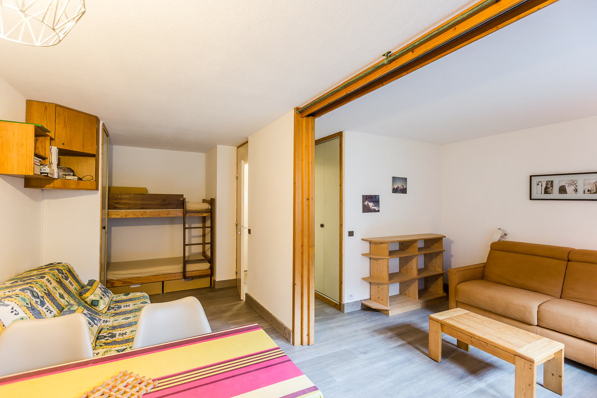 Studio divisible équipé pour 4/5 personnes d'environ 32 m², entièrement rénové, exposé sud avec balcon, vue montagnes, au niveau 3.