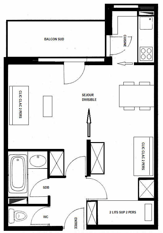 Séjour divisible : télévision, lecteur DVD, canapé convertible type rapido pour 2 personnes (140) d'un côté et Lits superposés + canapé convertible type BZ pour 2 personnes (140) de l'autre.