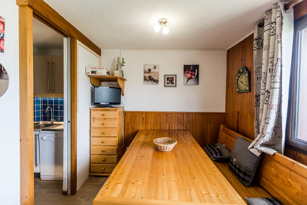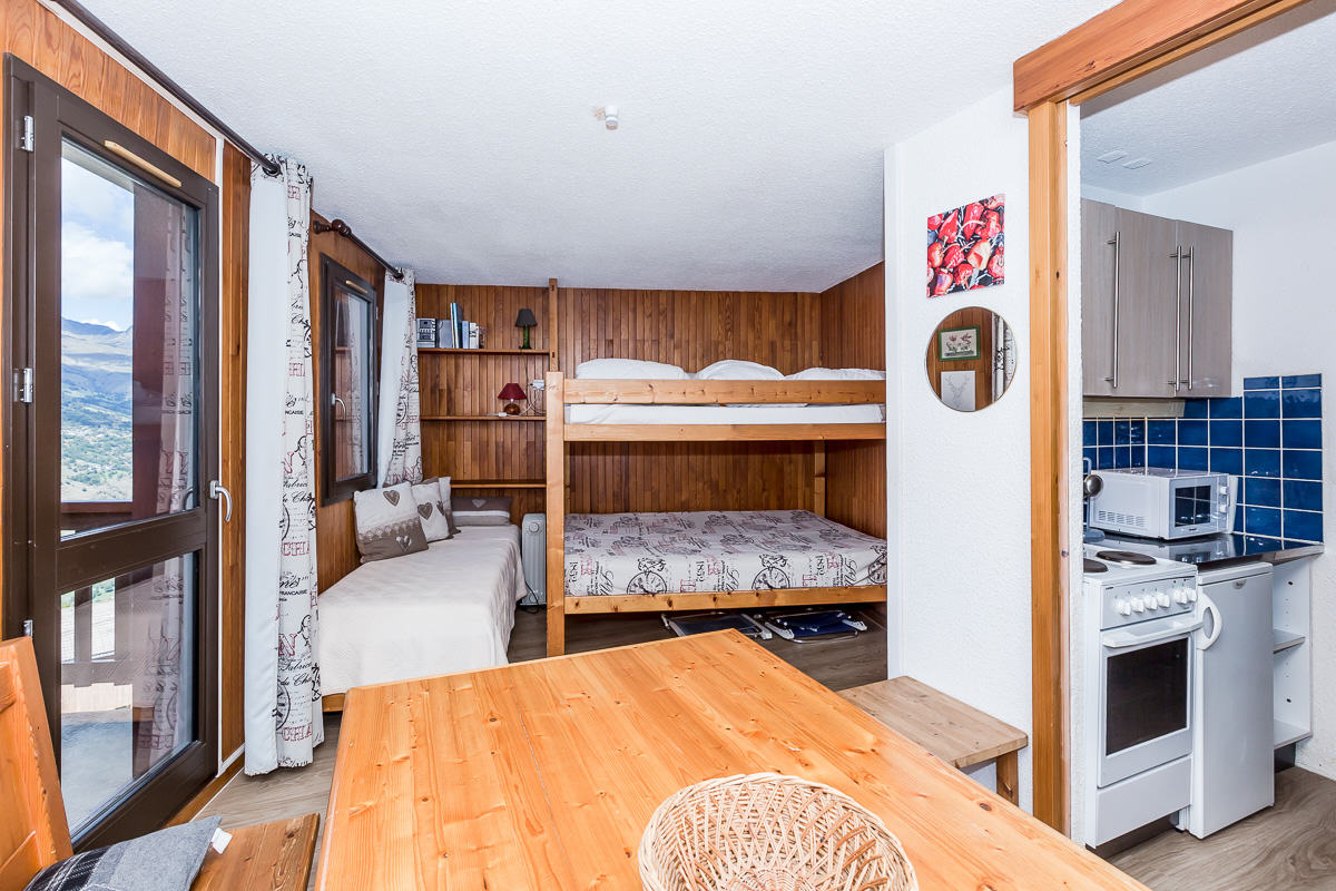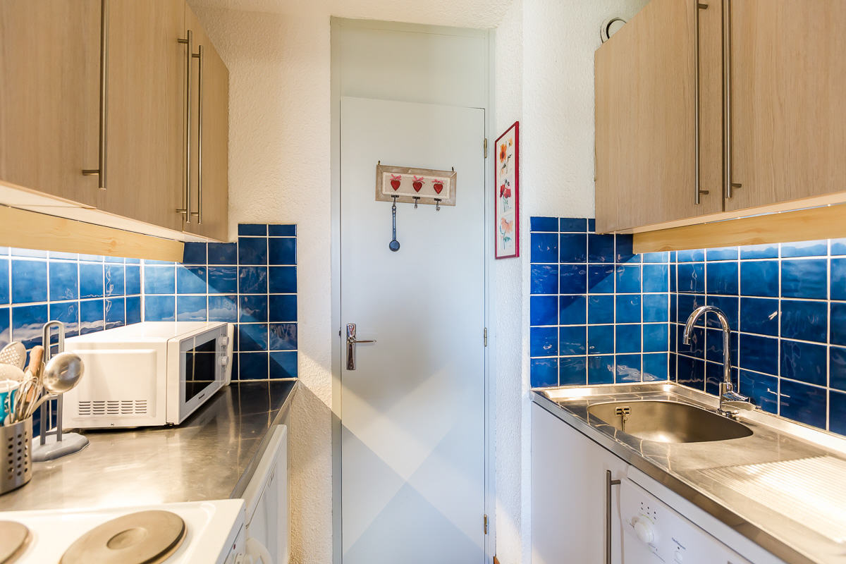 Studio équipé pour 3 personnes d'environ 22 m², entièrement rénové, exposé sud/ouest avec balcon/terrasse, côté vallée et pistes au niveau -1. Coin cuisine : gazinière électrique, réfrigérateur, lave-vaisselle, micro-ondes, bouilloire, grille pain, appareil à raclette.