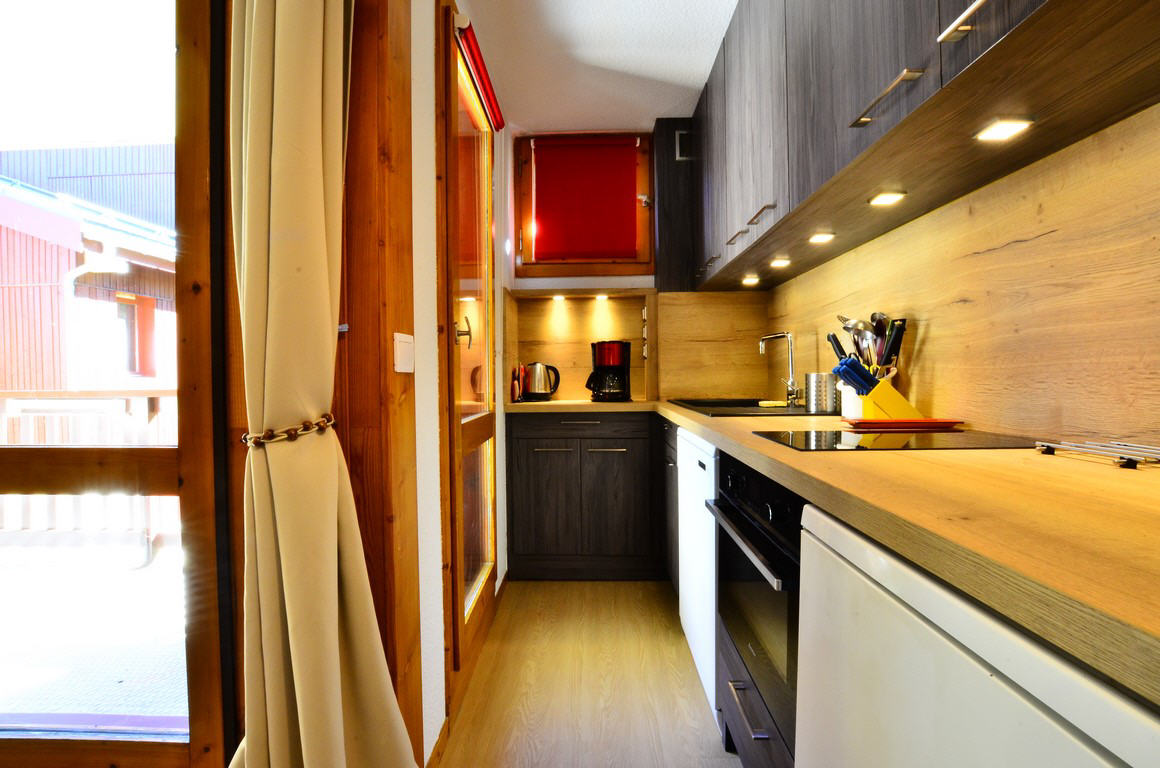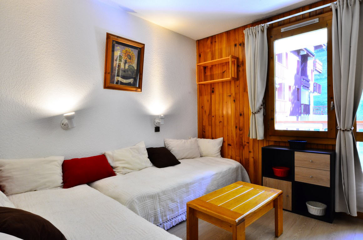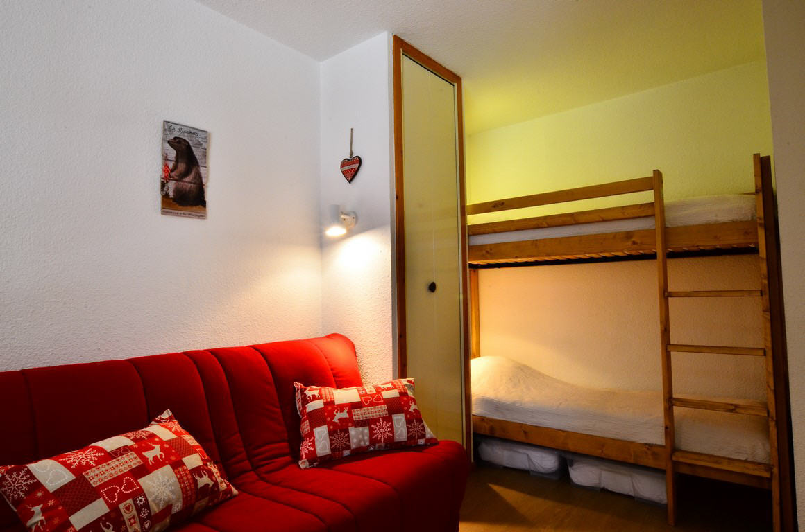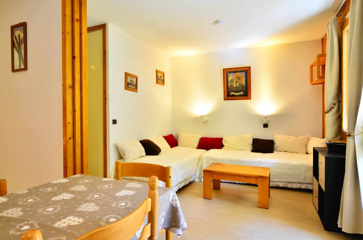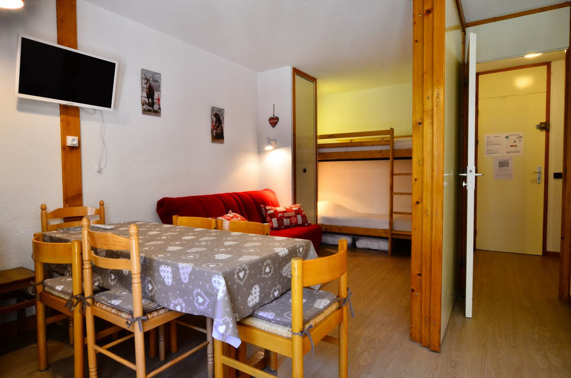 Studio divisible équipé pour 4/5 personnes d'environ 32 m², entièrement rénové, exposé sud avec balcon, vue montagne, au niveau 1.
