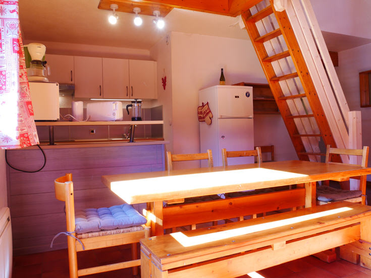 2 pièces + mezzanine (hauteur inférieur à 1m80), situé au niveau 1.5, équipé pour 7 personnes d'environ 43m² + 9m² inférieur à 1m80, en bon état, exposé sud, vue rue principale de Montchavin avec grande terrasse.