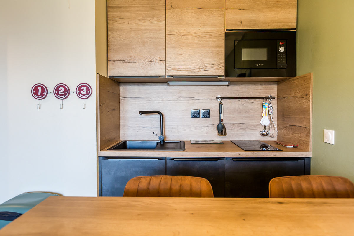 Cuisine: 2 plaques vitrocéramiques, petit réfrigérateur, lave-vaisselle, micro-ondes, bouilloire et grille-pain.