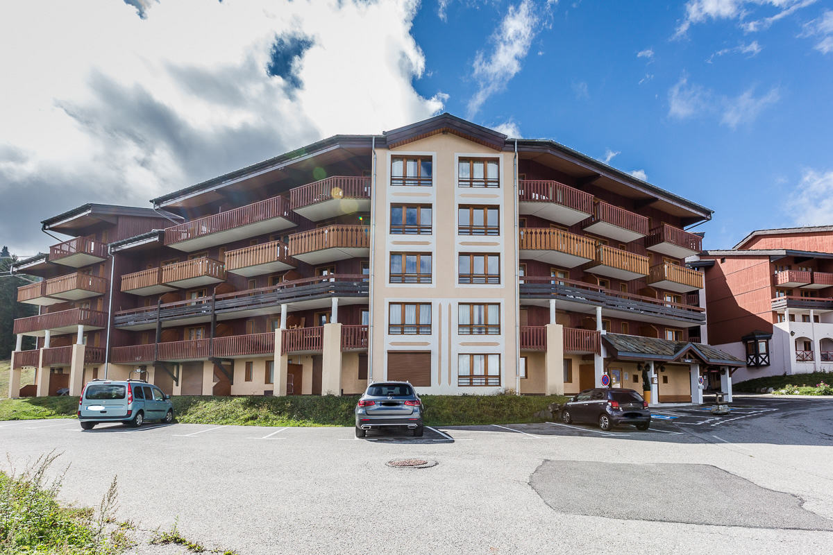 Résidence de 4 étages avec casiers à skis au rez-de-chaussée, située à 900m des commerces et au pied des pistes. Parking extérieur gratuit devant la résidence.