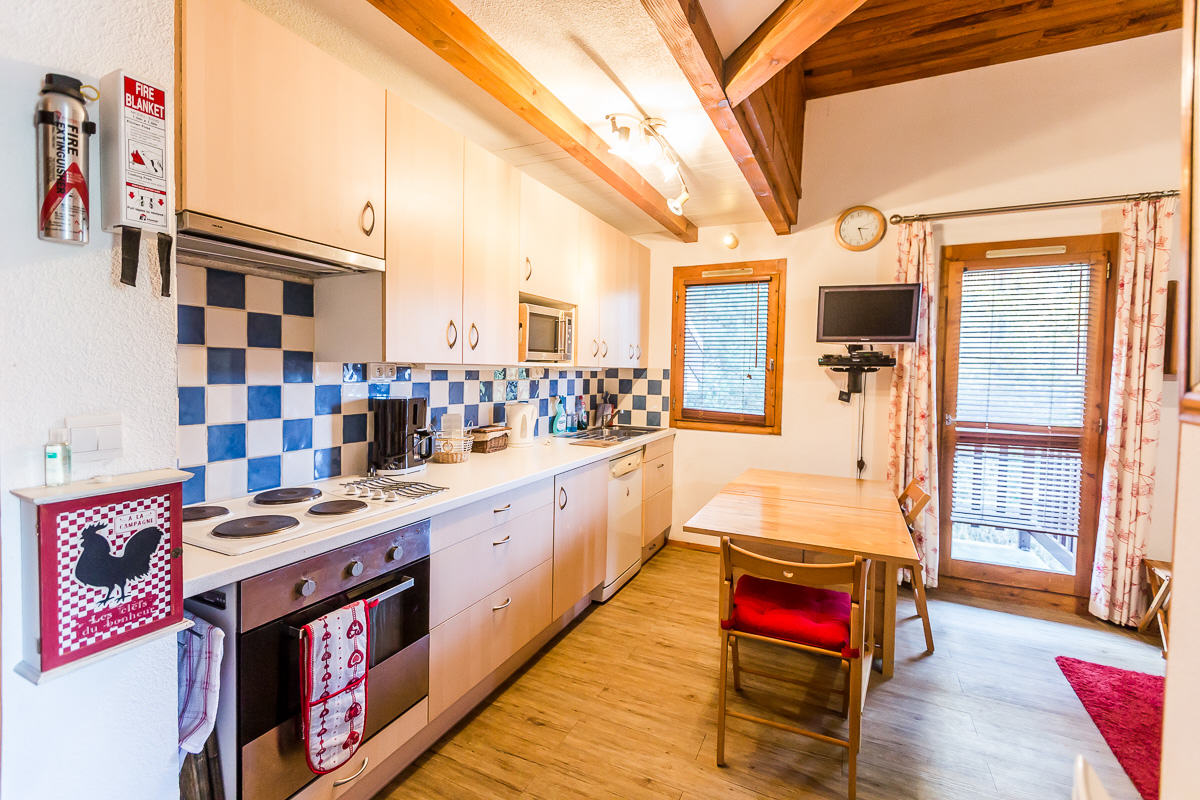 Cuisine ouverte sur séjour : 4 plaques à induction, petit réfrigérateur, lave-vaisselle, four électrique, micro-ondes, hotte, bouilloire électrique, grille-pain, service à fondue, lave-linge.