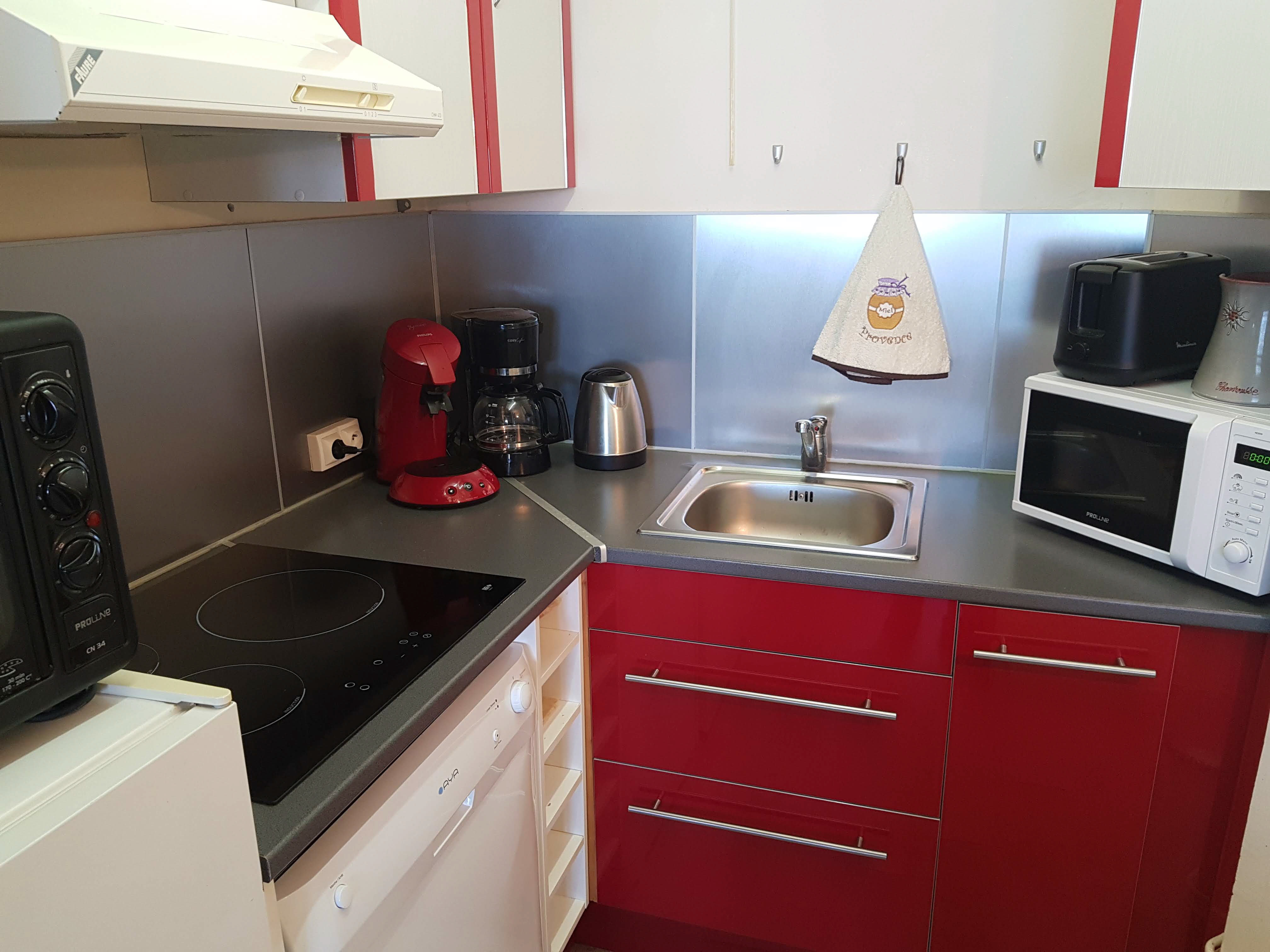 Une cuisine bien équipée: lave vaisselle, machine à laver, réfrigérateur, four, micro-ondes, plaque triple induction, cafetière Senseo, cafetière à filtre, bouilloire, grille-pain, appareil à crêpes party, appareil à fondue, appareil à raclette, mixeur.