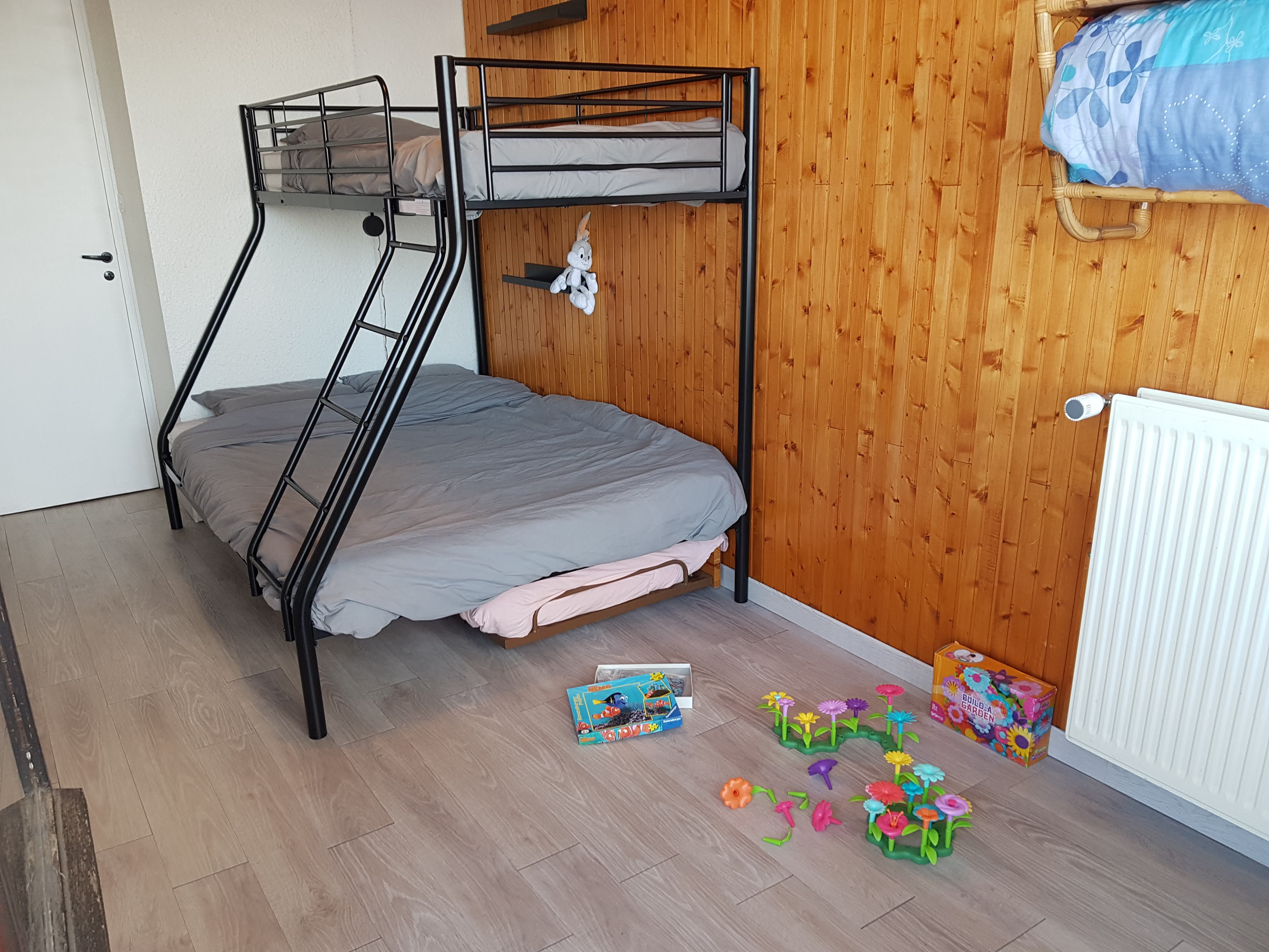 Dans la chambre un ensemble de lits superposés 3 couchages : lit 2 places en bas, lit simple en haut plus un lit tiroir simple qui se met à la même hauteur avec également un petit bureau, soit 4 couchages dans la chambre principale