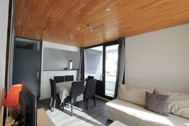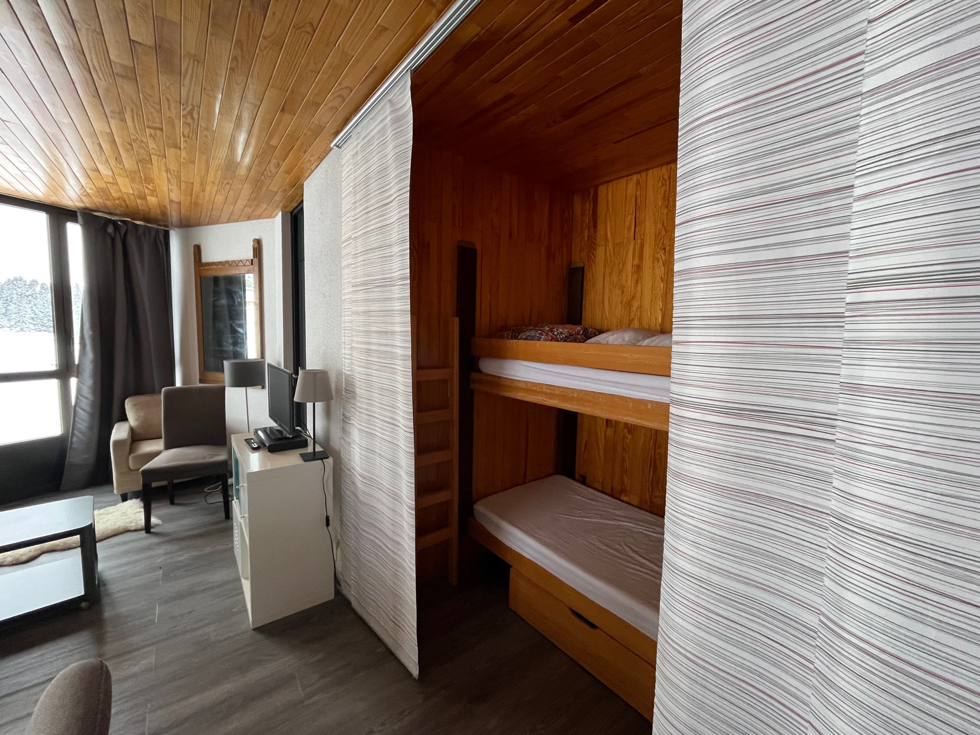 Appartement 3 pièces : une chambre séparée et dans un coin cabine séparé par un rideau de séparation : un ensemble de lits superposés , et un canapé 2 places dans le séjour: NEUF et un lit 2 places dans la chambre