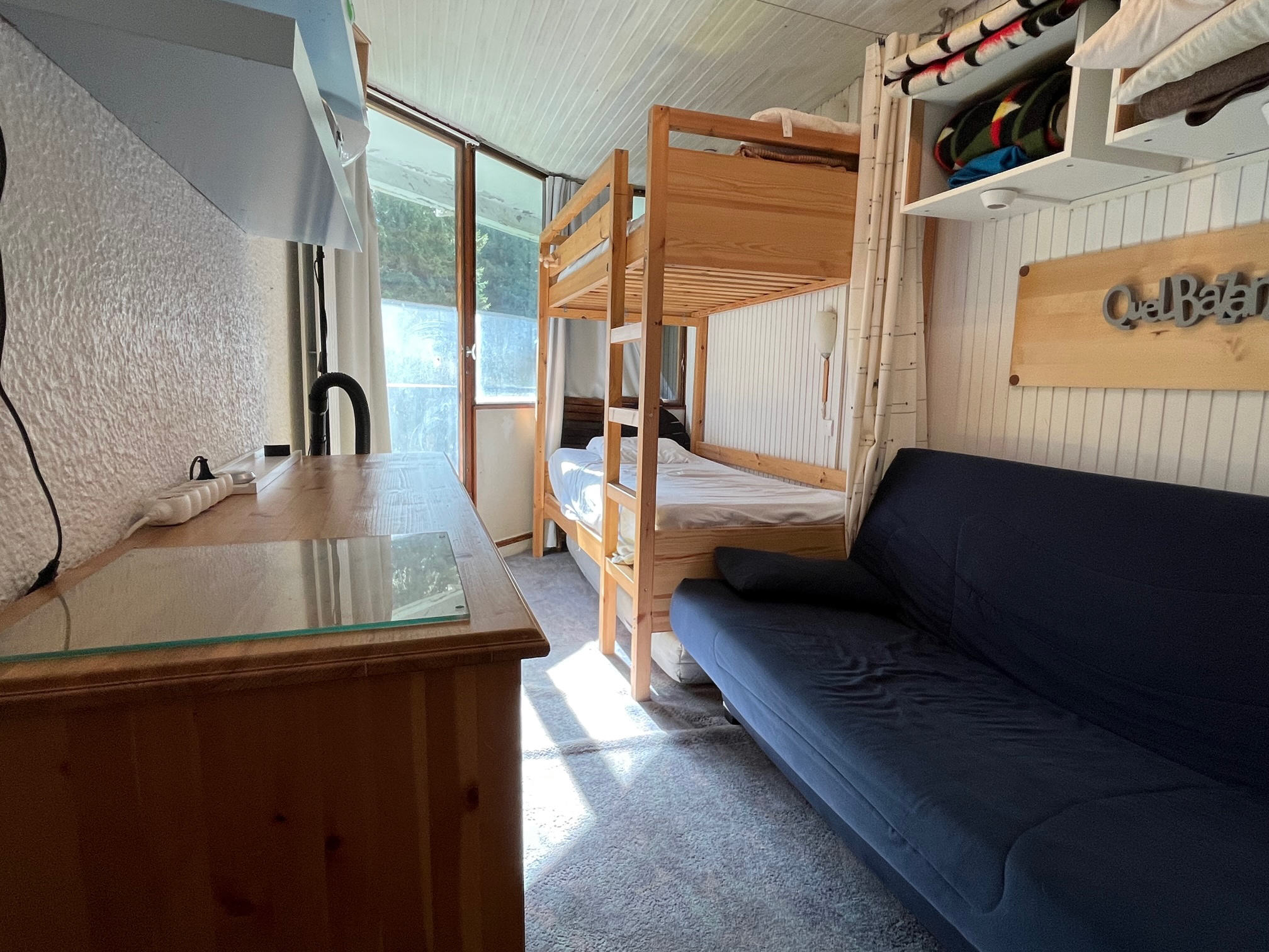 une chambre avec un canapé 2 places et un ens de lits superposés séparés par un rideau
