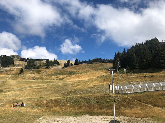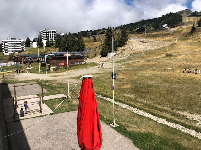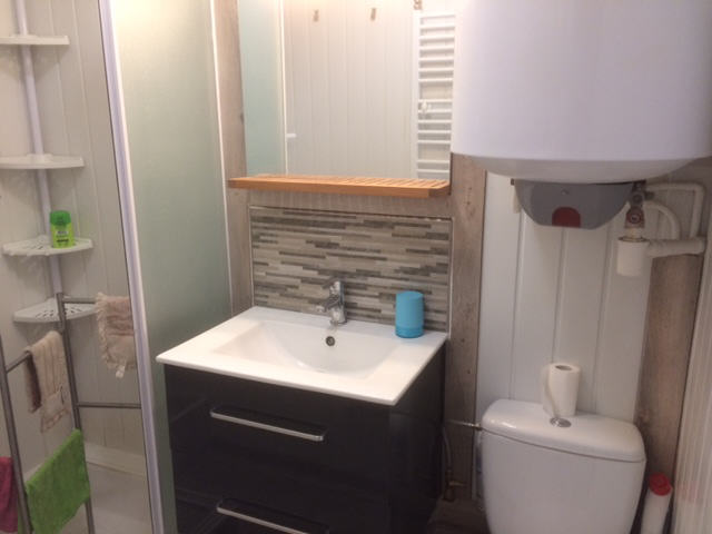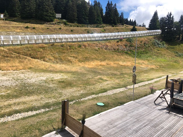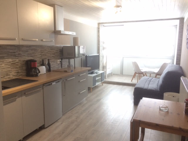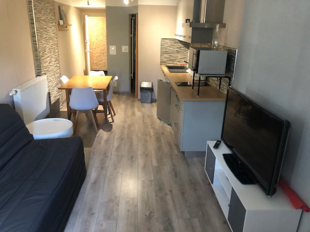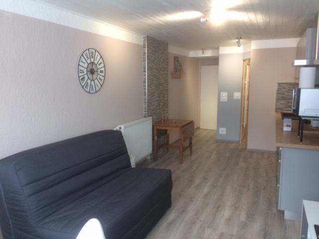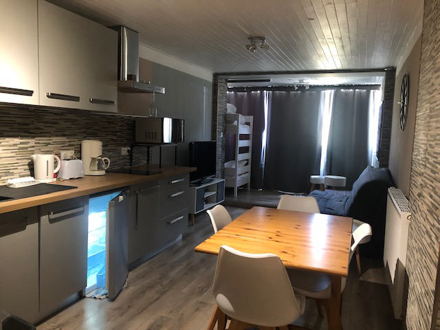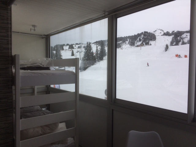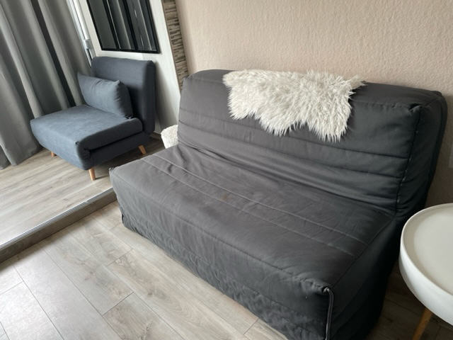 Studio cabine face aux pistes un canapé 2 places neuf et dans un coin cabine séparé par un rideau un ensemble de lits superposés et un petit canapé lit une place en face des lits supp