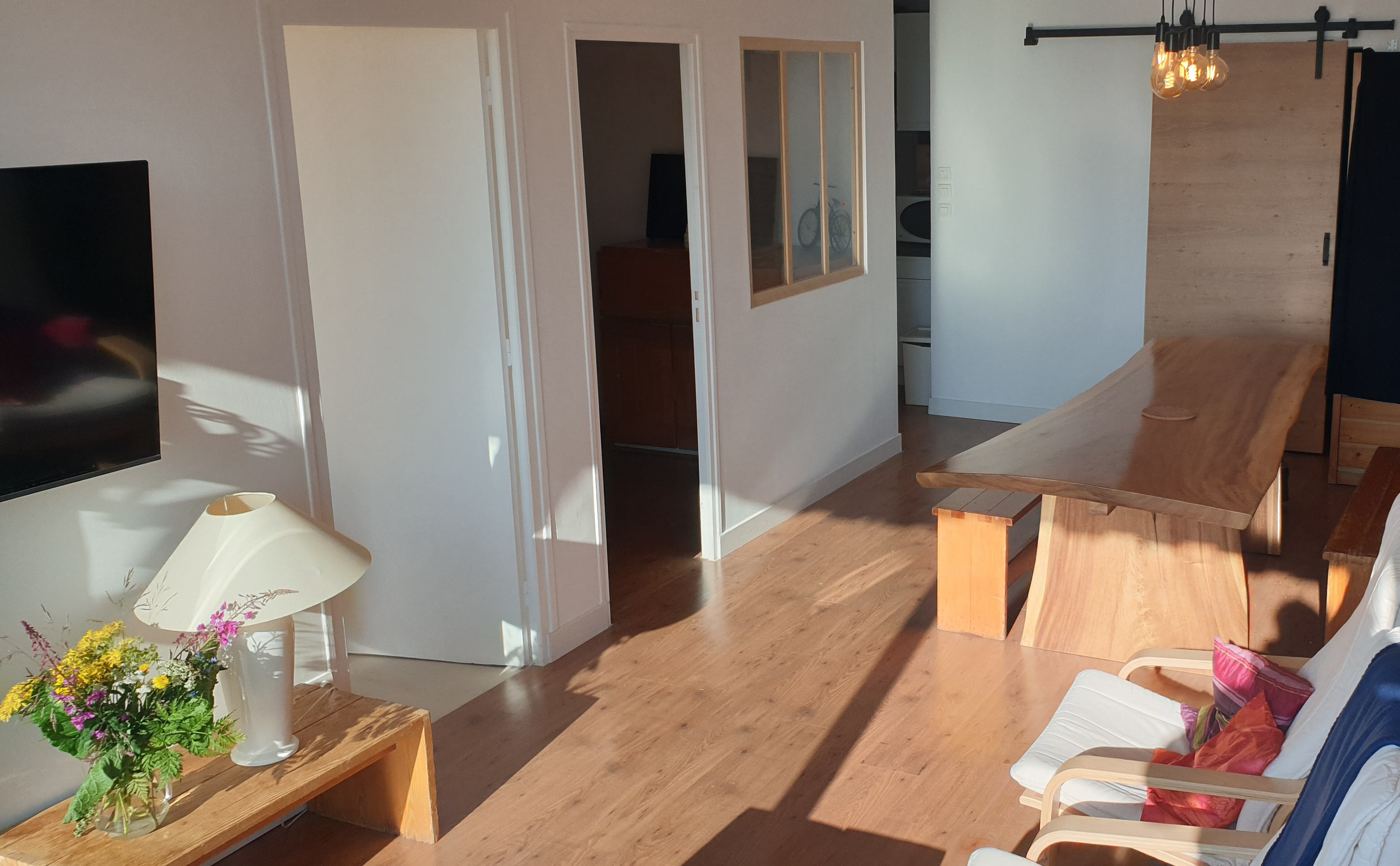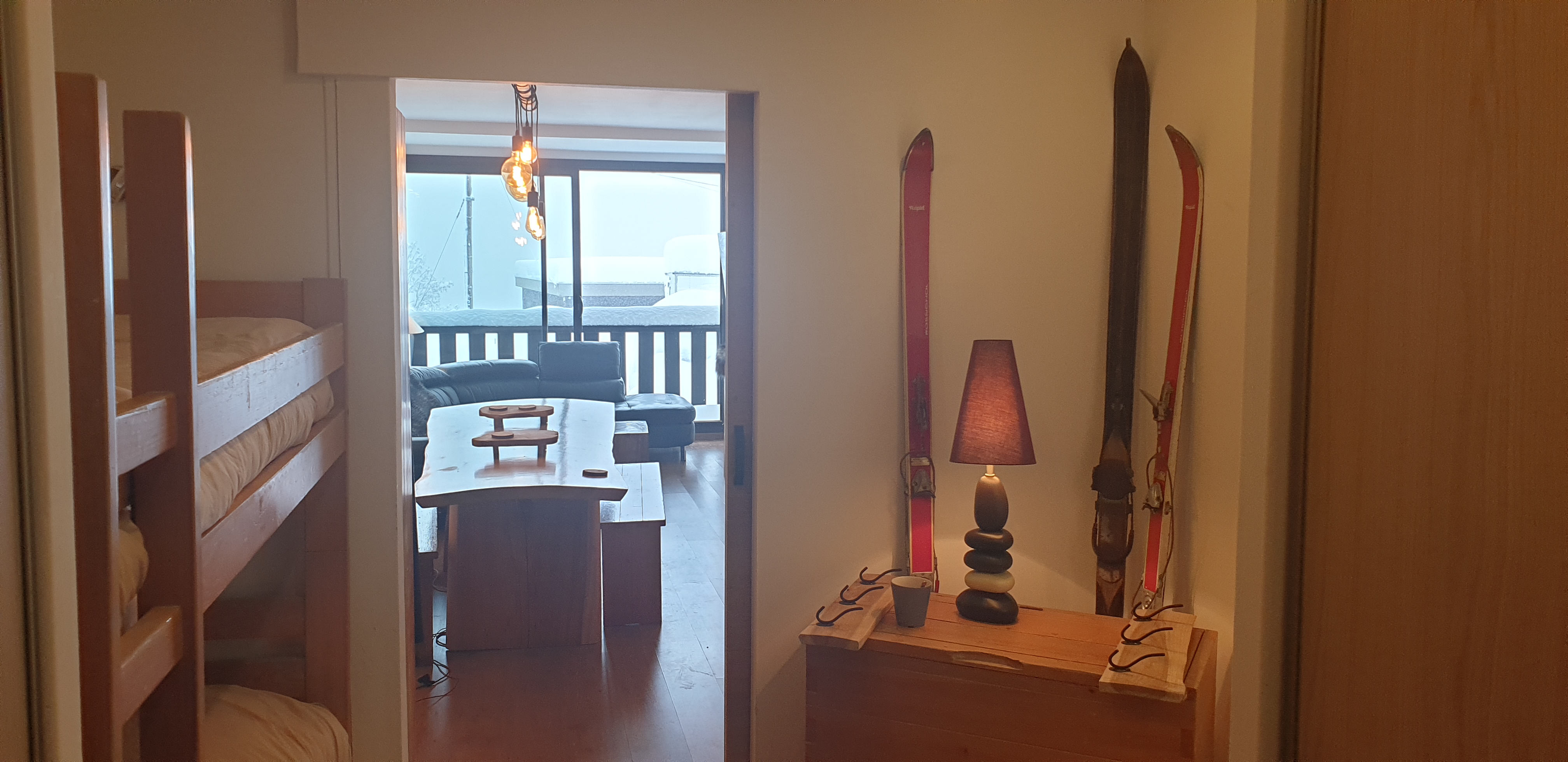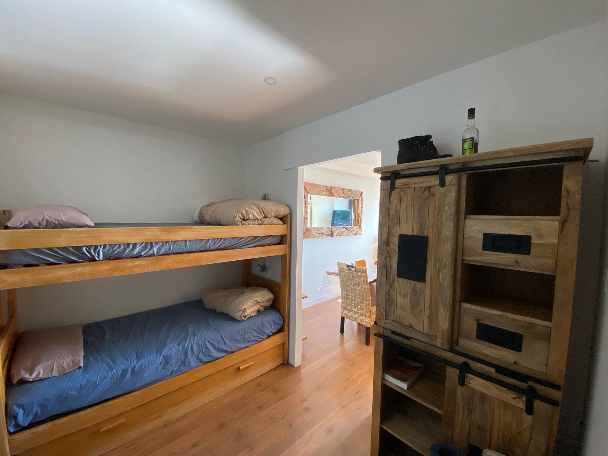 Dans l'entrée un coin nuit avec un ensemble de lits superposés et un lit tiroir une place avec porte qui se ferme, et dans le séjour, il y a un canapé d'angle qui ne fait pas couchage