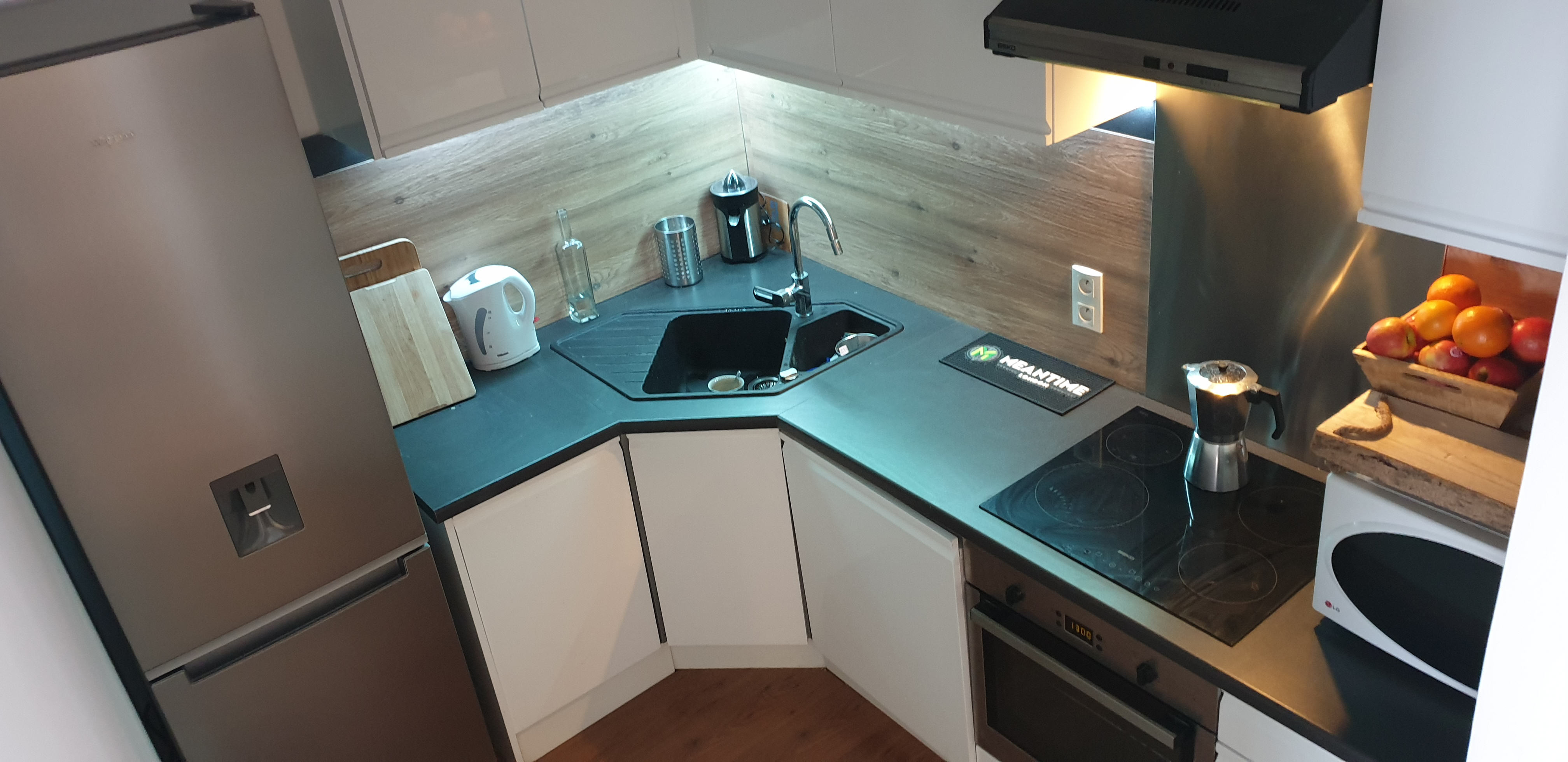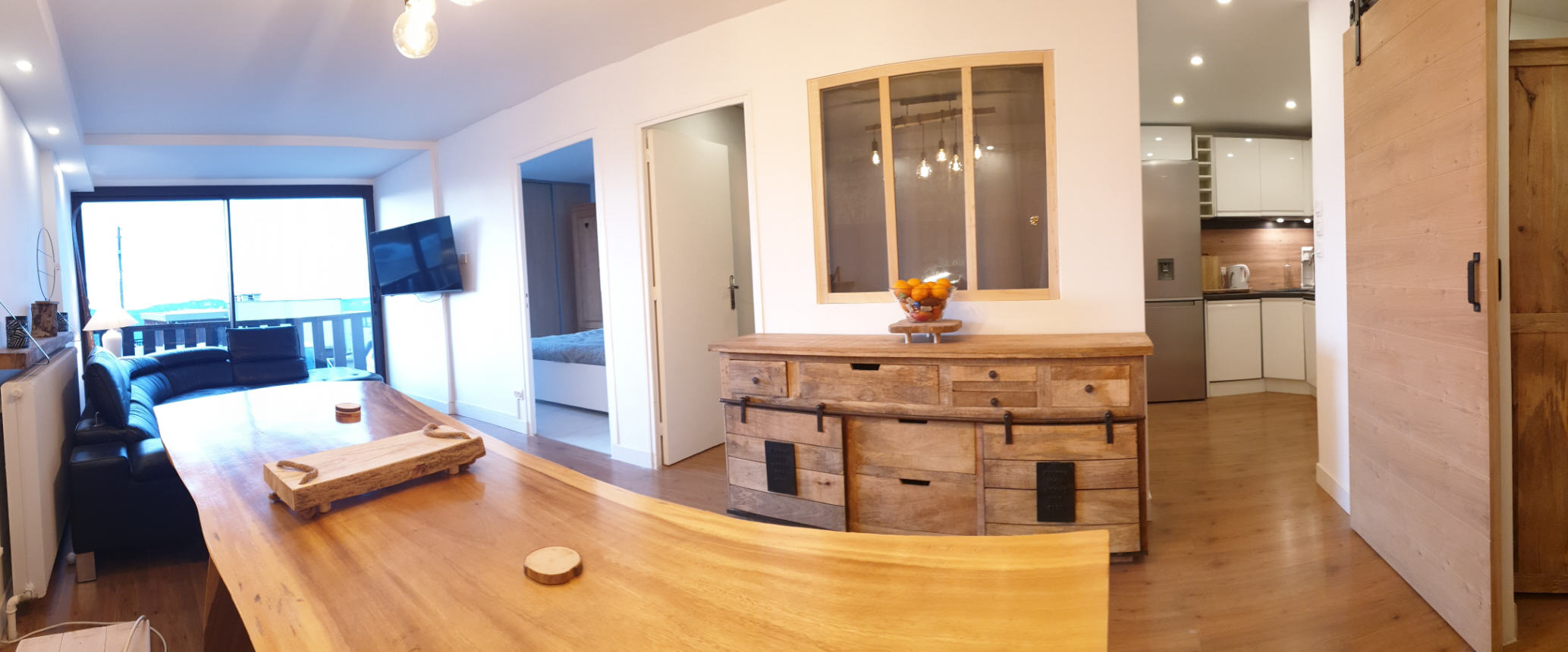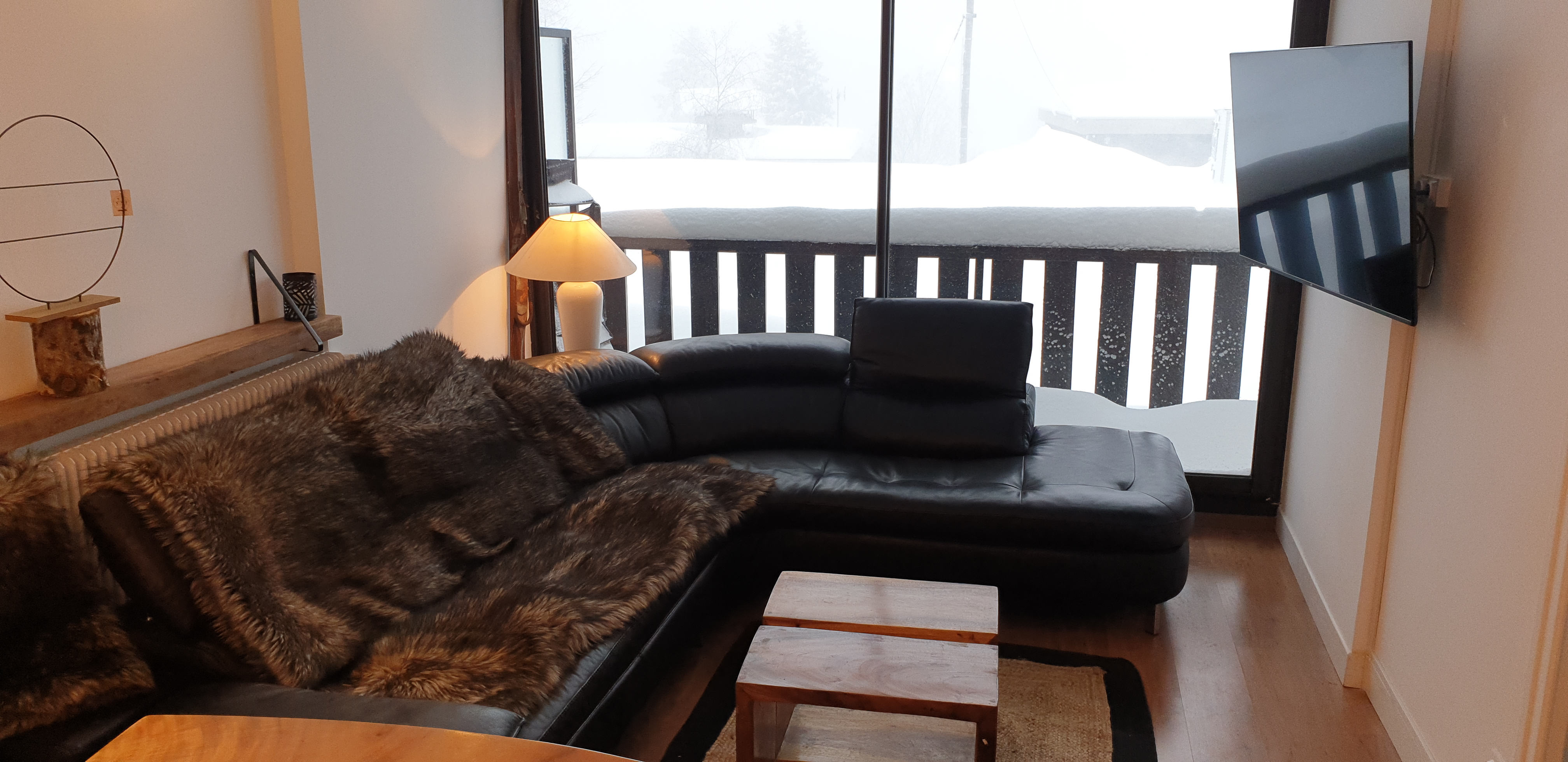 Dans l'entrée un coin nuit avec un ensemble de lits superposés et un lit tiroir une place avec porte qui se ferme, et dans le séjour, il y a un canapé d'angle qui ne fait pas couchage