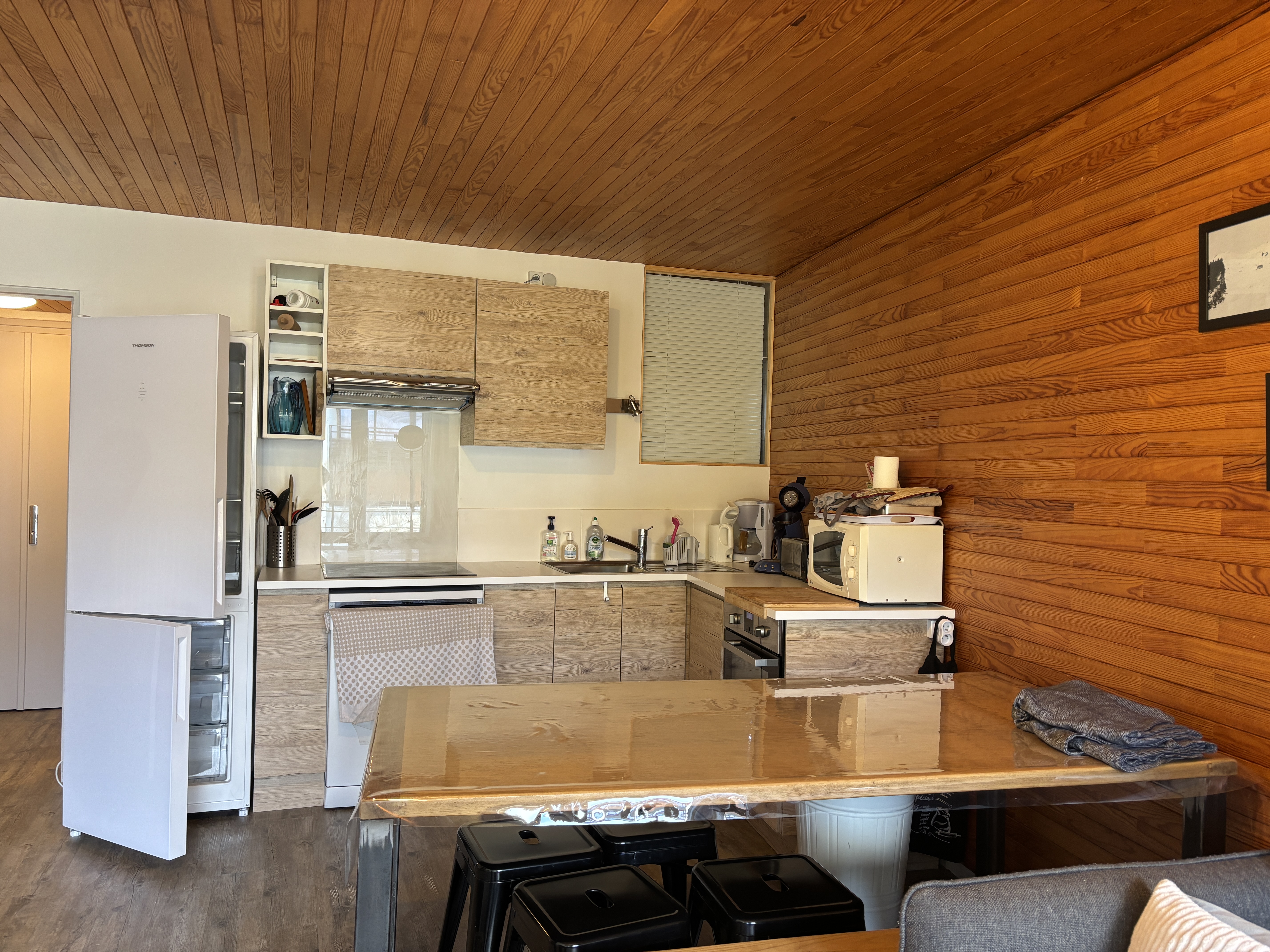 Cuisine équipée avec lave-vaisselle, micro-onde, four, cafetières à capsule et à filtre, grille-pain, bouilloire, grand frigo avec freezer