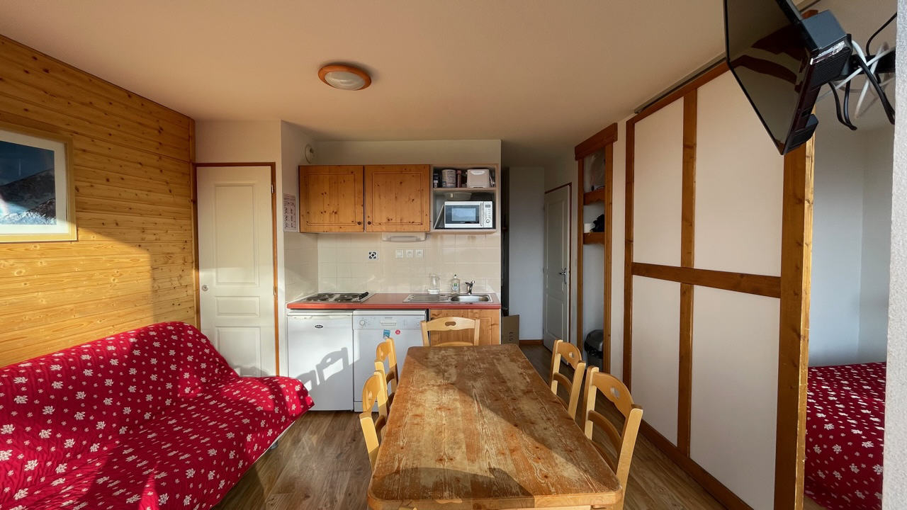 Pièce à vivre avec canapé-lit 2 pers, table et TV.