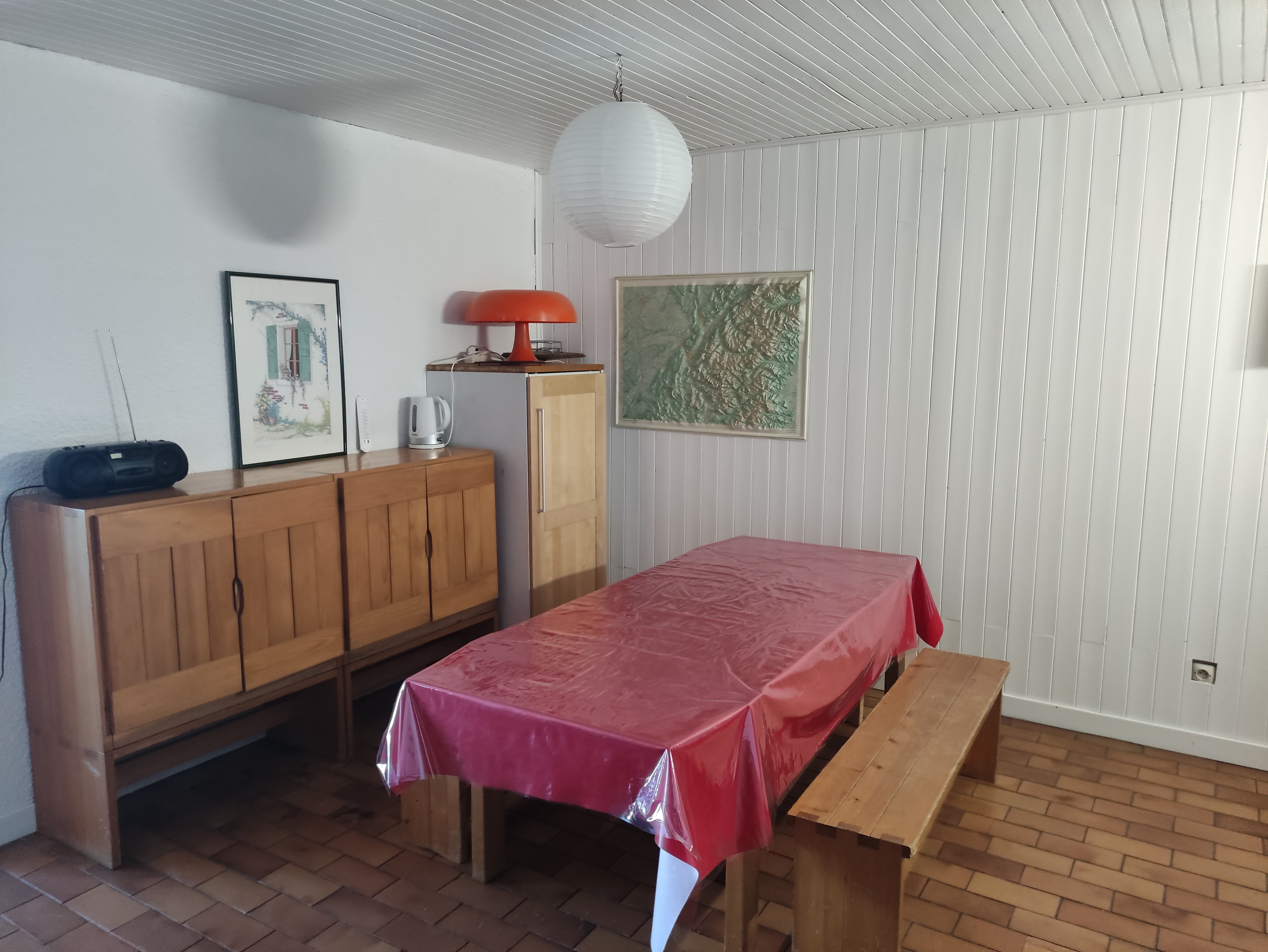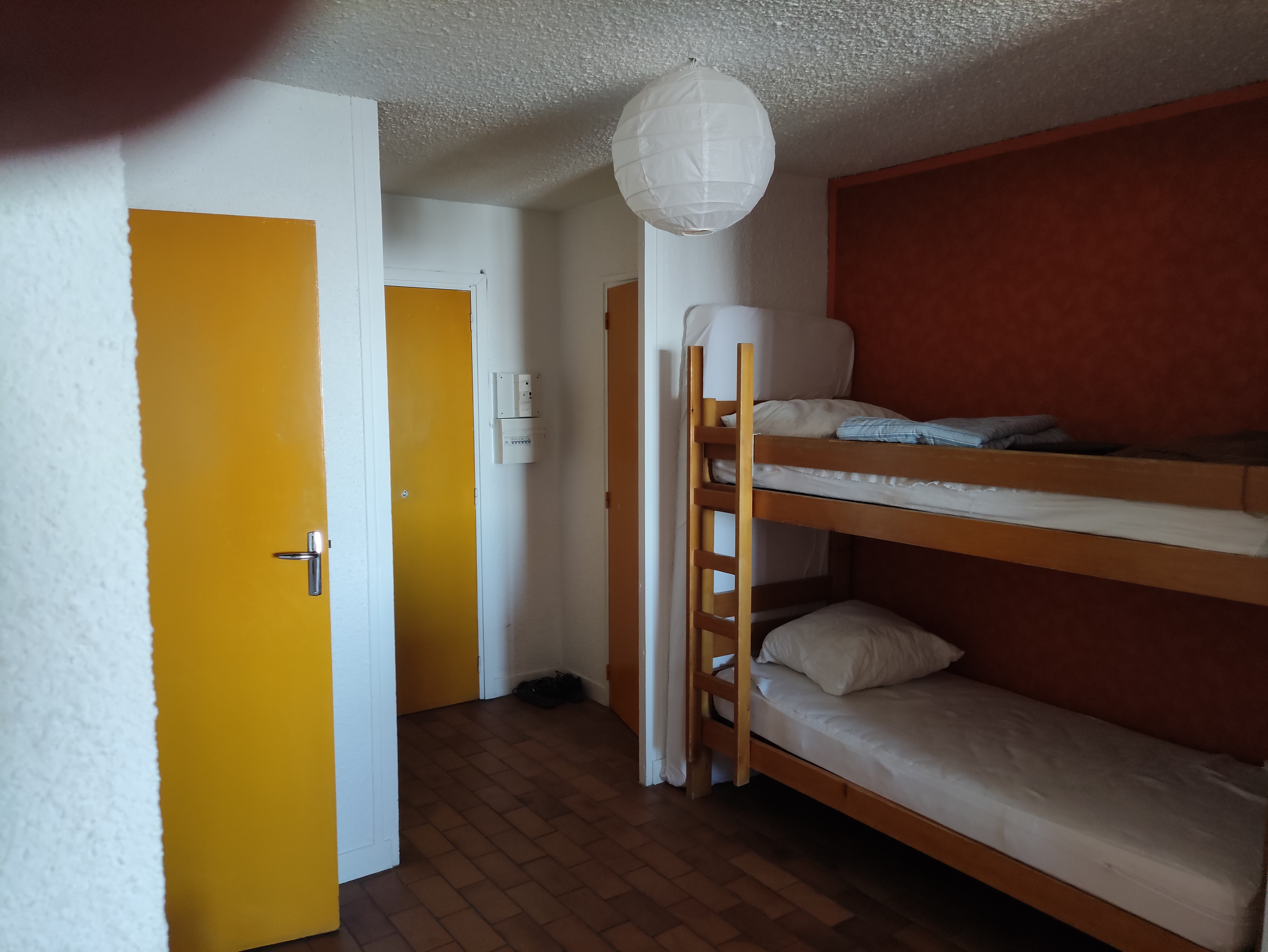 L'équipement : 1 chambre fermée avec 1 lit double 160 - 1 coin cabine fermé avec 2 lits superposés et un canapé lit-gigogne dans le séjour (=2 couchages 1 place en 80 cm )