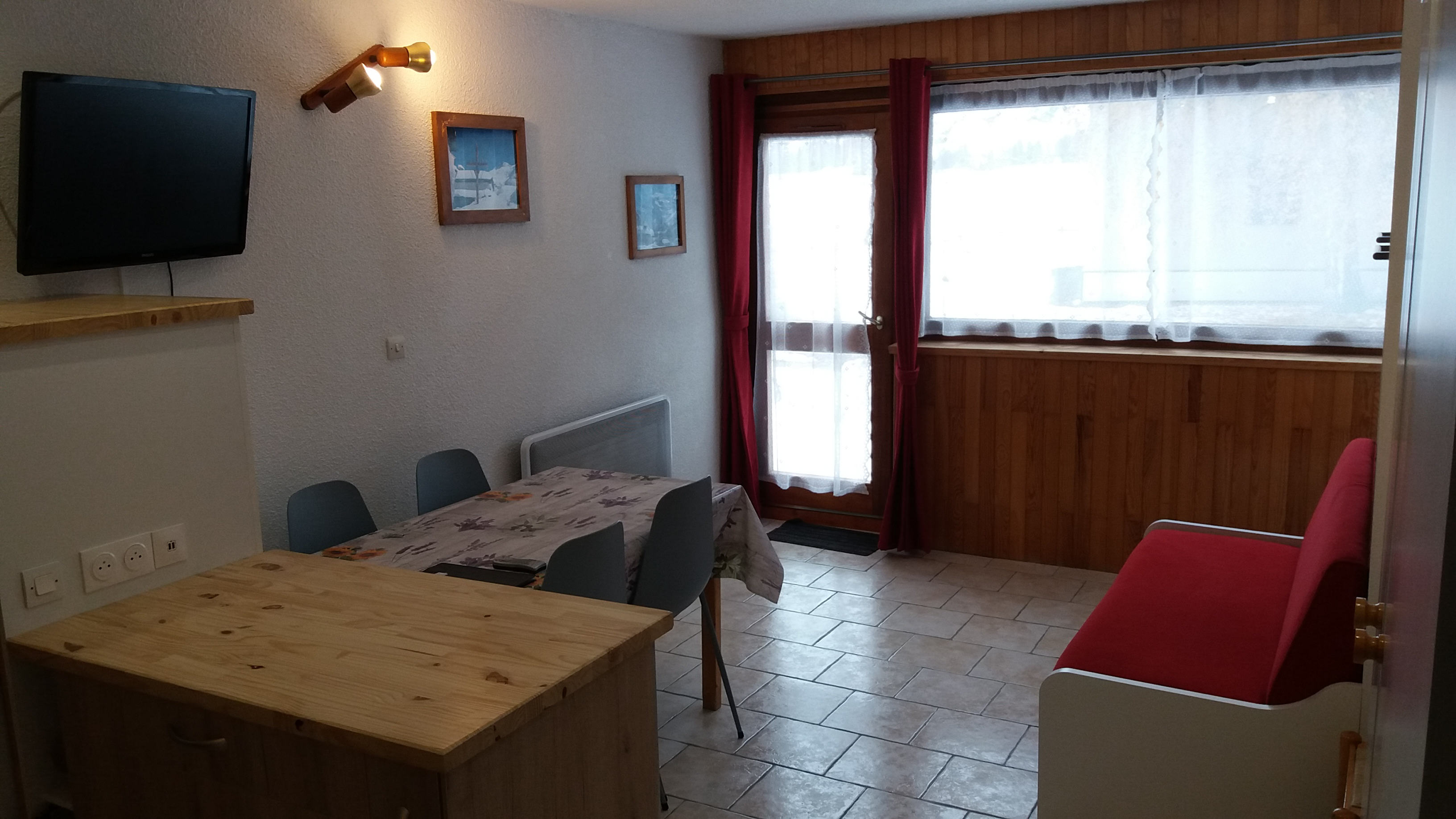 Séjour avec une banquette-lit de deux places, matelas d'une bonne épaisseur et confortable . TV couleur écran plat.