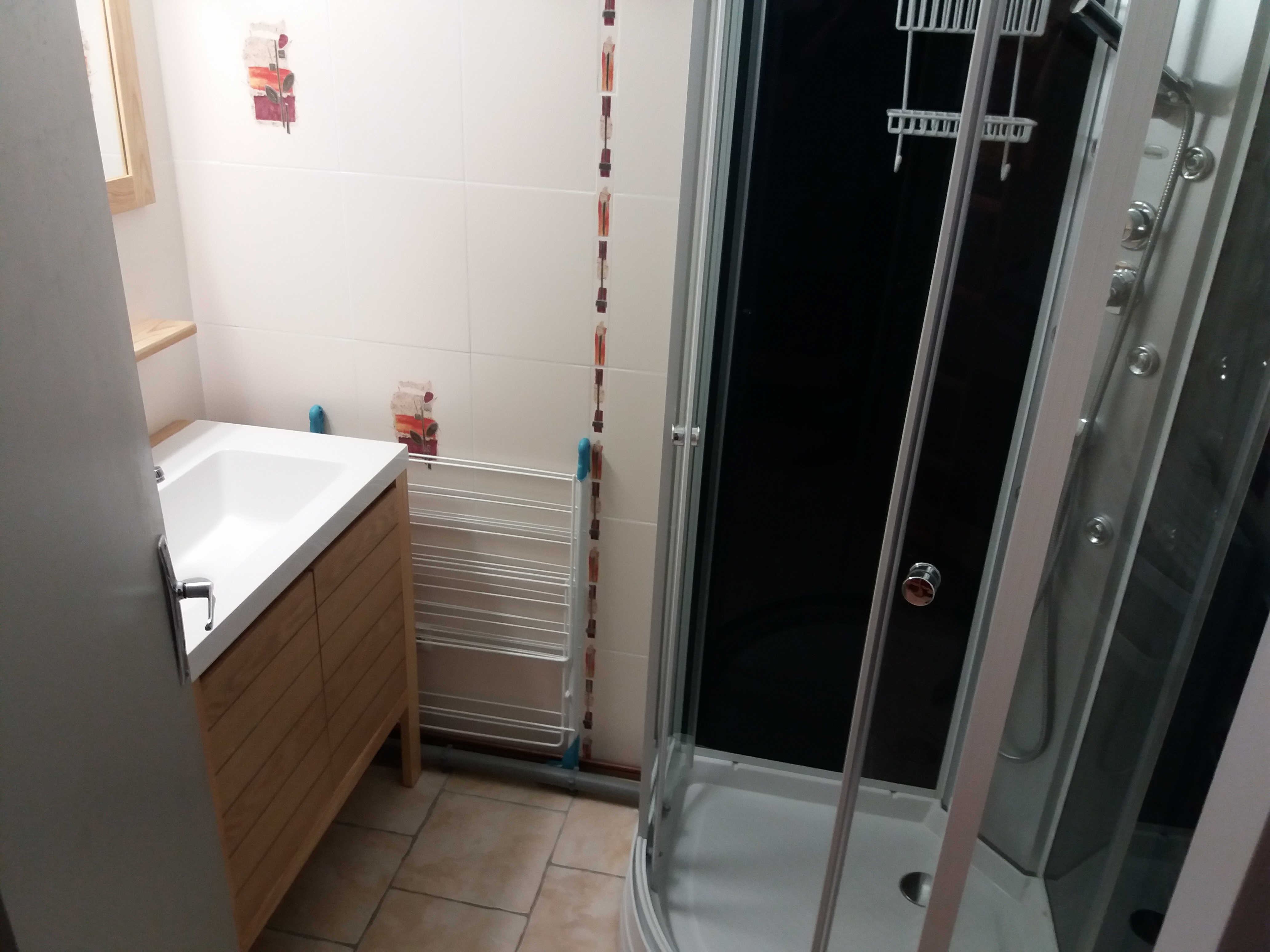 Salle d'eau (refaite à neuf) avec douche multi-jets, vasque, lave-linge, radiateur sèche-serviettes et WC indépendants.