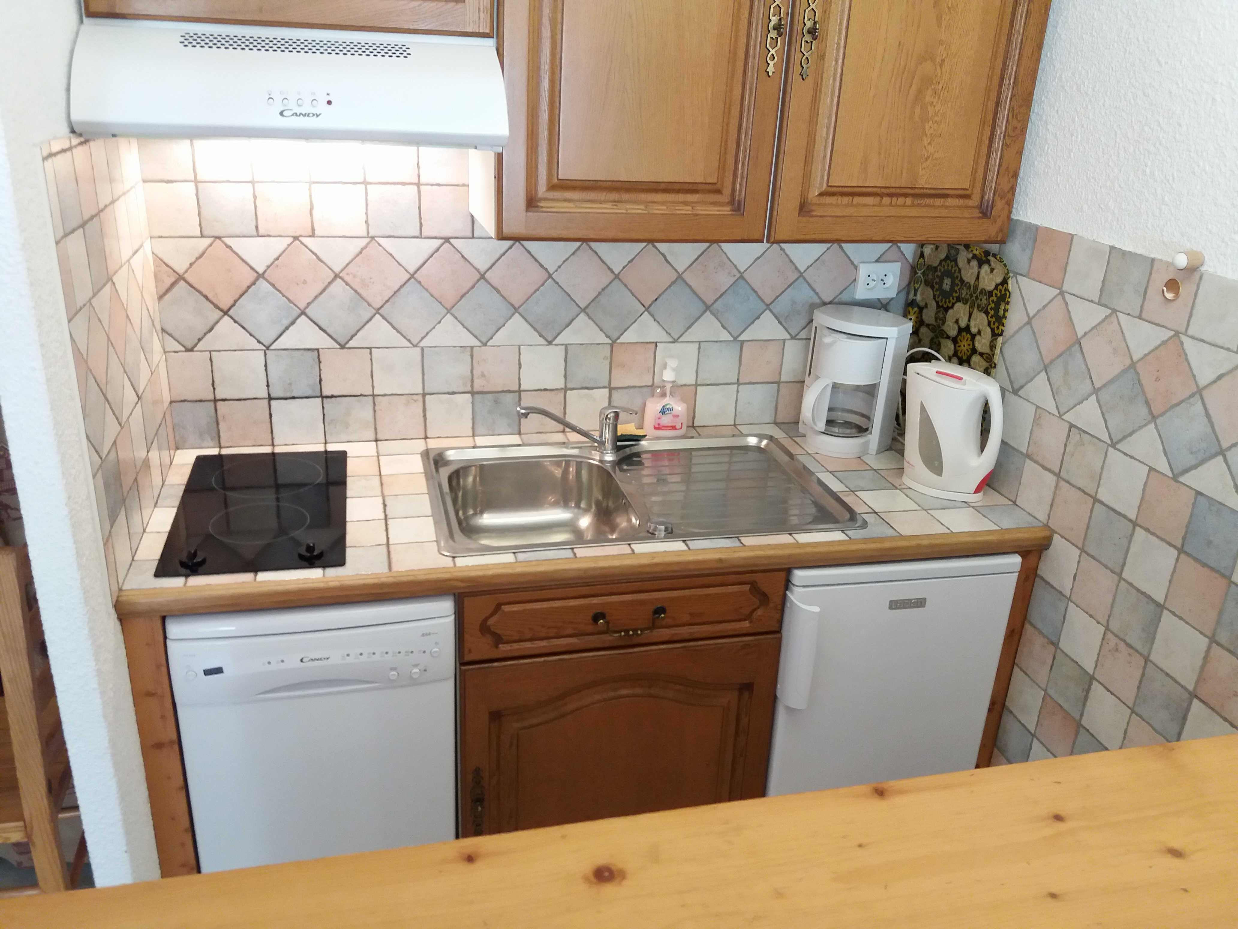Cuisinette (refaite à neuf) équipé d'un four combiné (micro-ondes), réfrigérateur, plaques vitrocéramiques, lave-vaisselle.