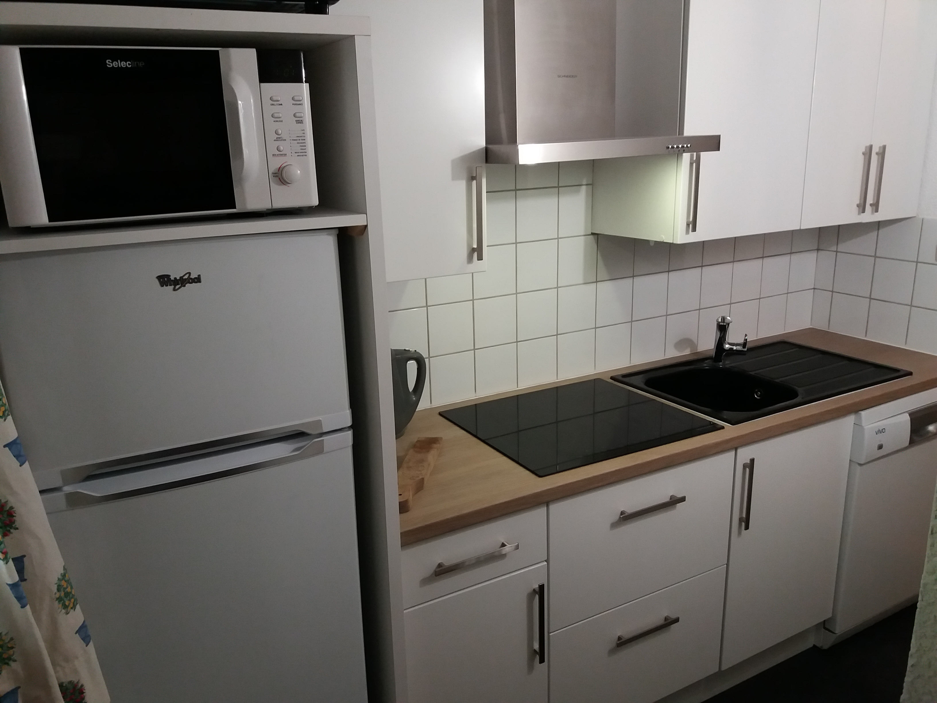 Cuisinette équipée d'un four, réfrigérateur, plaques électriques, lave-vaisselle.