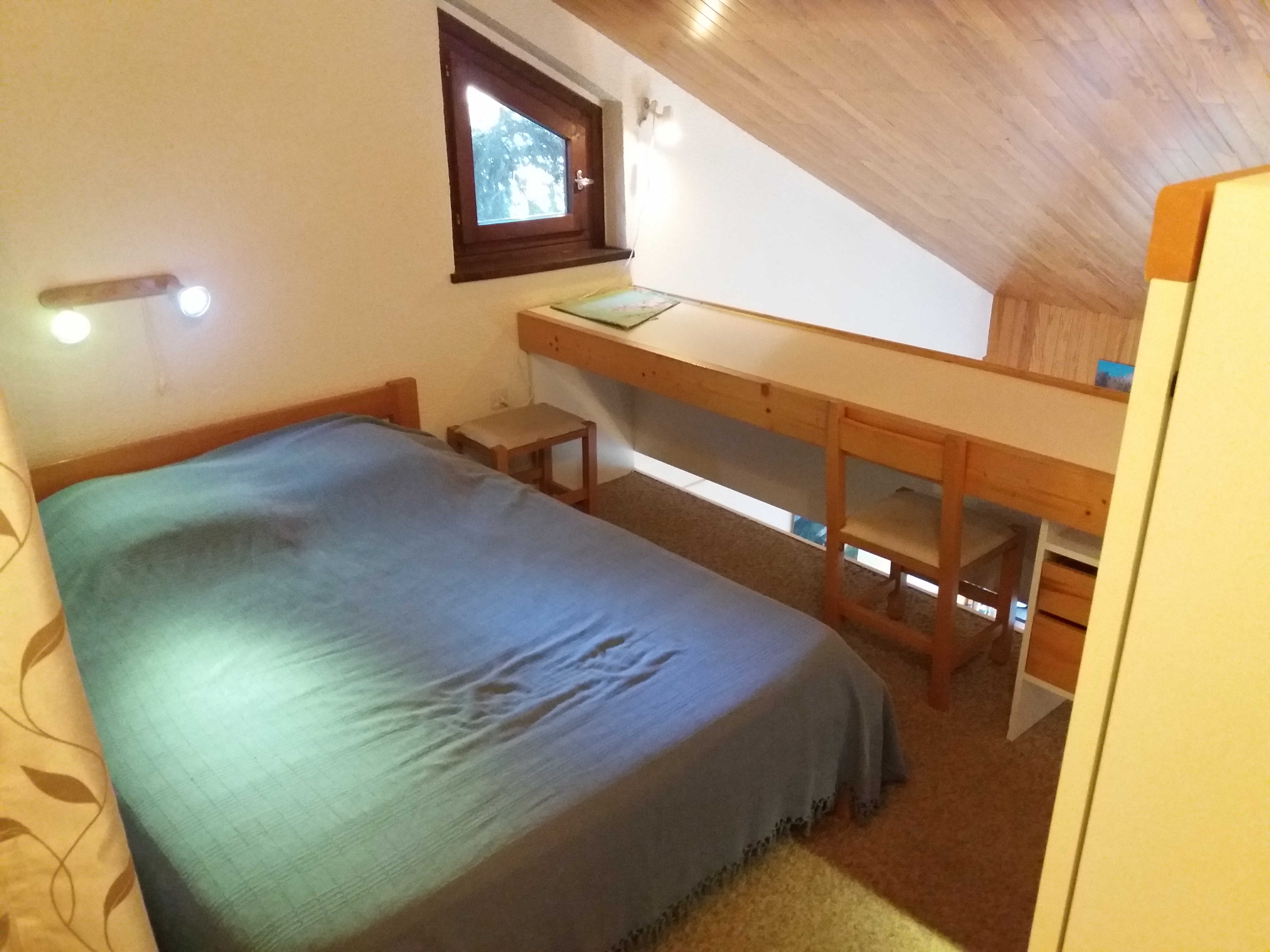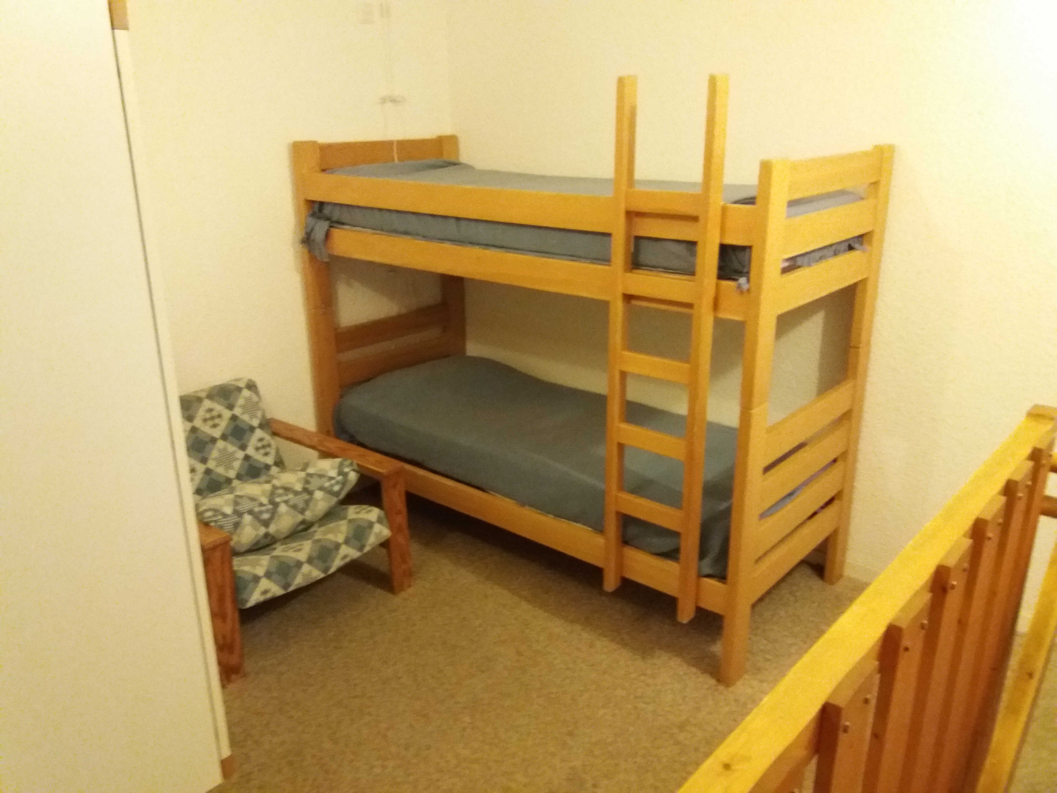 Mezzanine avec deux lits superposés et un lit deux places. Une chambre avec un lit deux places (130 cm).