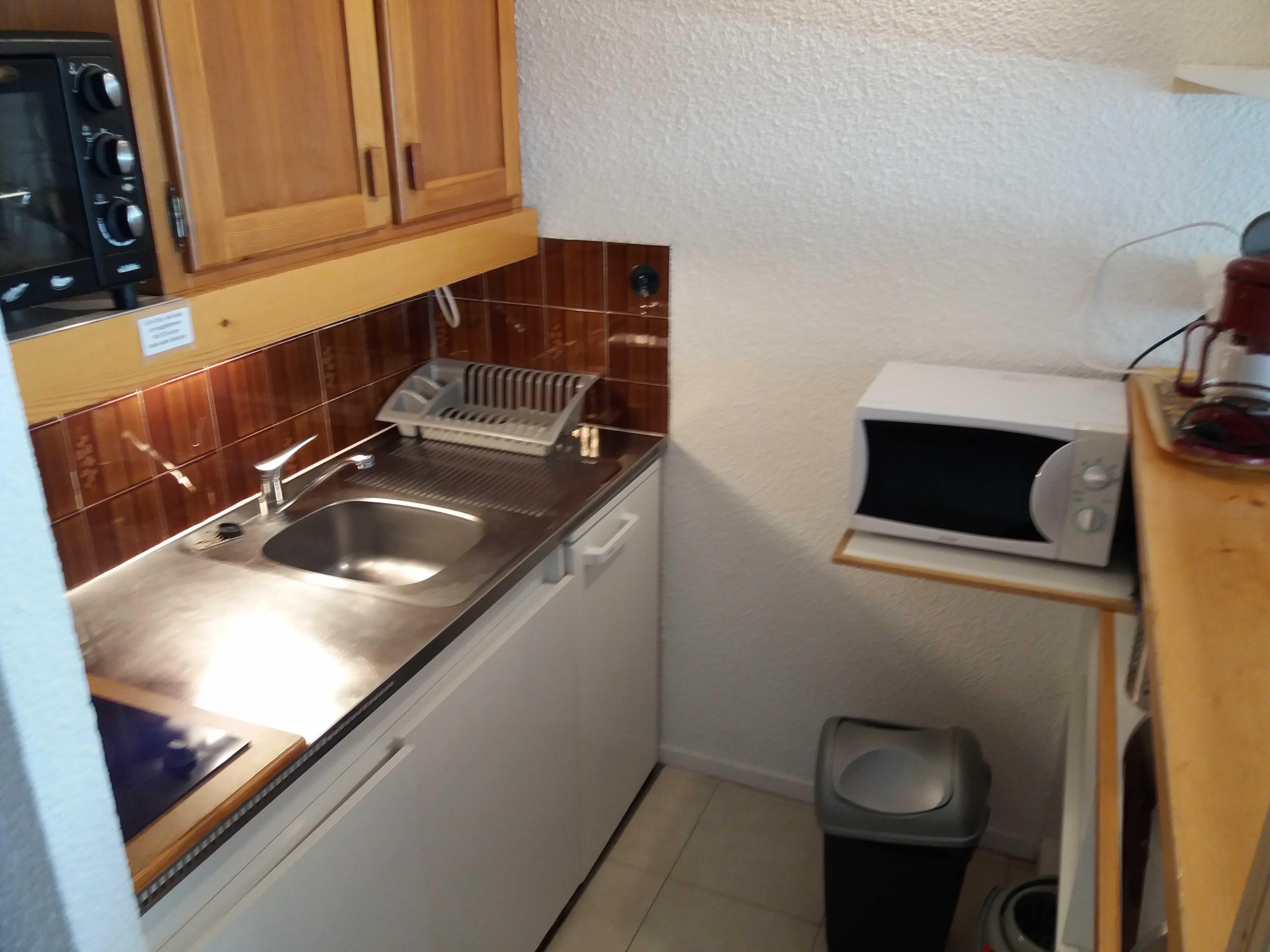 Cuisinette équipée d'un four, réfrigérateur, micro-ondes, plaques électriques.