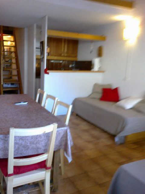 Cuisinette refaite à neuf équipée d'un four, réfrigérateur, micro-ondes, plaques vitrocéramiques lave-vaisselle. Séjour avec deux lits une place. Mezzanine avec deux lits superposés, une chambre avec un lit deux places.