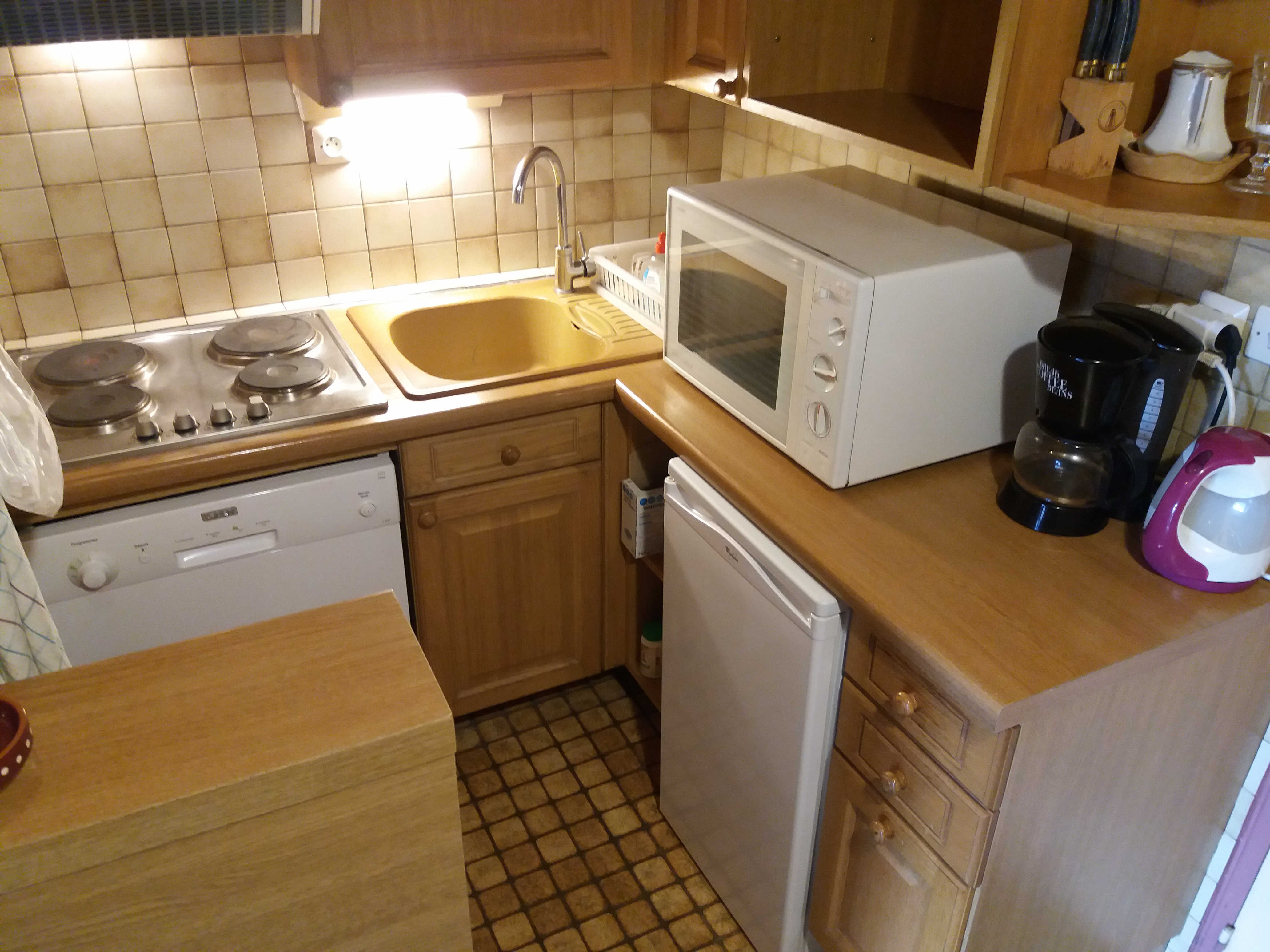 Séjour cuisinette équipée d'un four, réfrigérateur, plaques électriques, four, micro-ondes, lave-vaisselle.