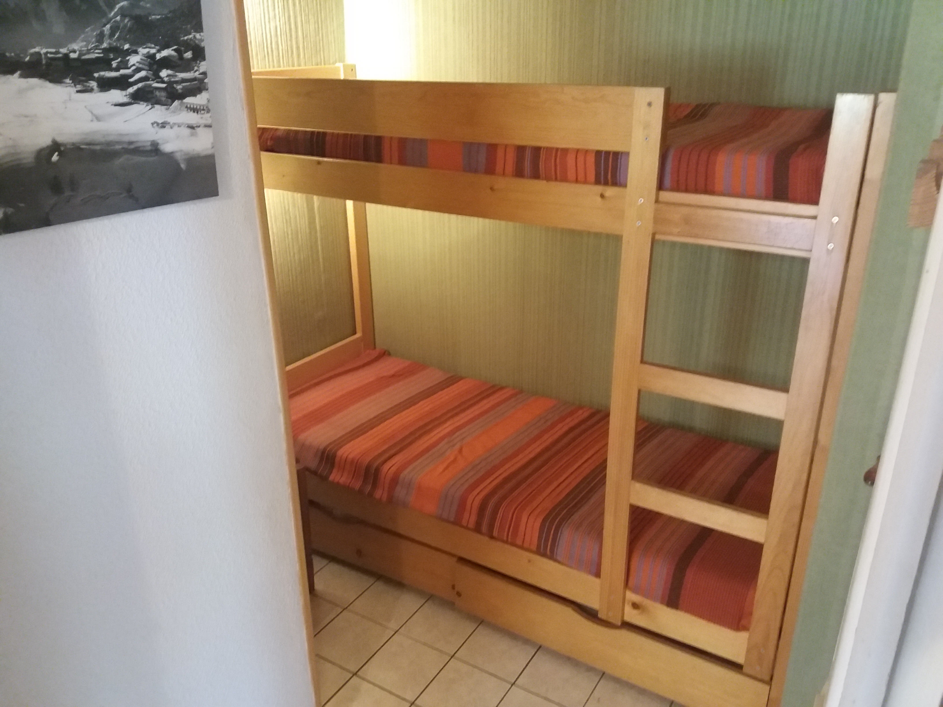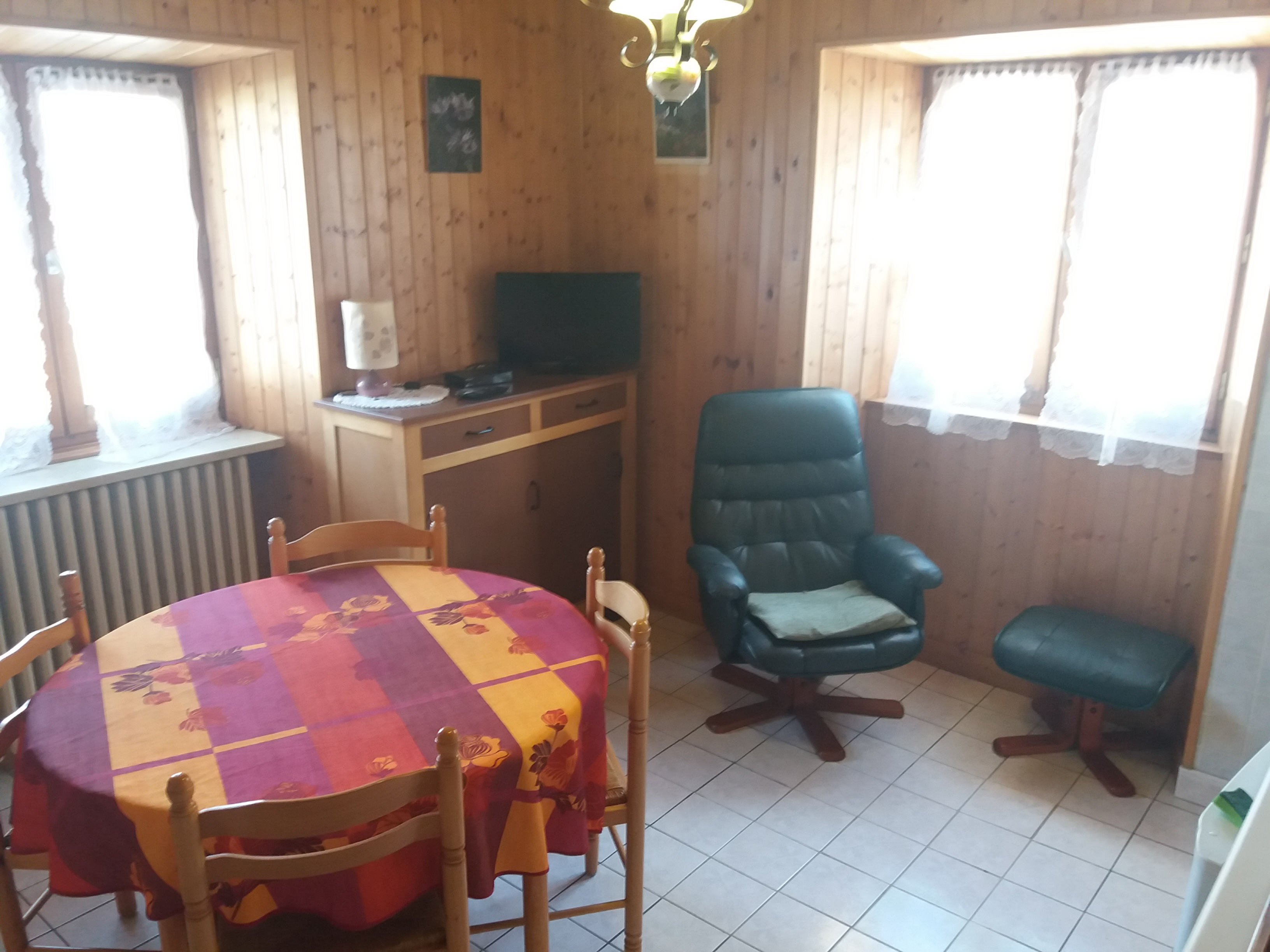 Séjour cuisinette équipée de plaques électriques, four, réfrigérateur, micro-ondes. Une chambre avec un lit deux places, un coin montagne avec deux lits superposés. WC, salle d'eau indépendants. Télévision. Casier à skis.