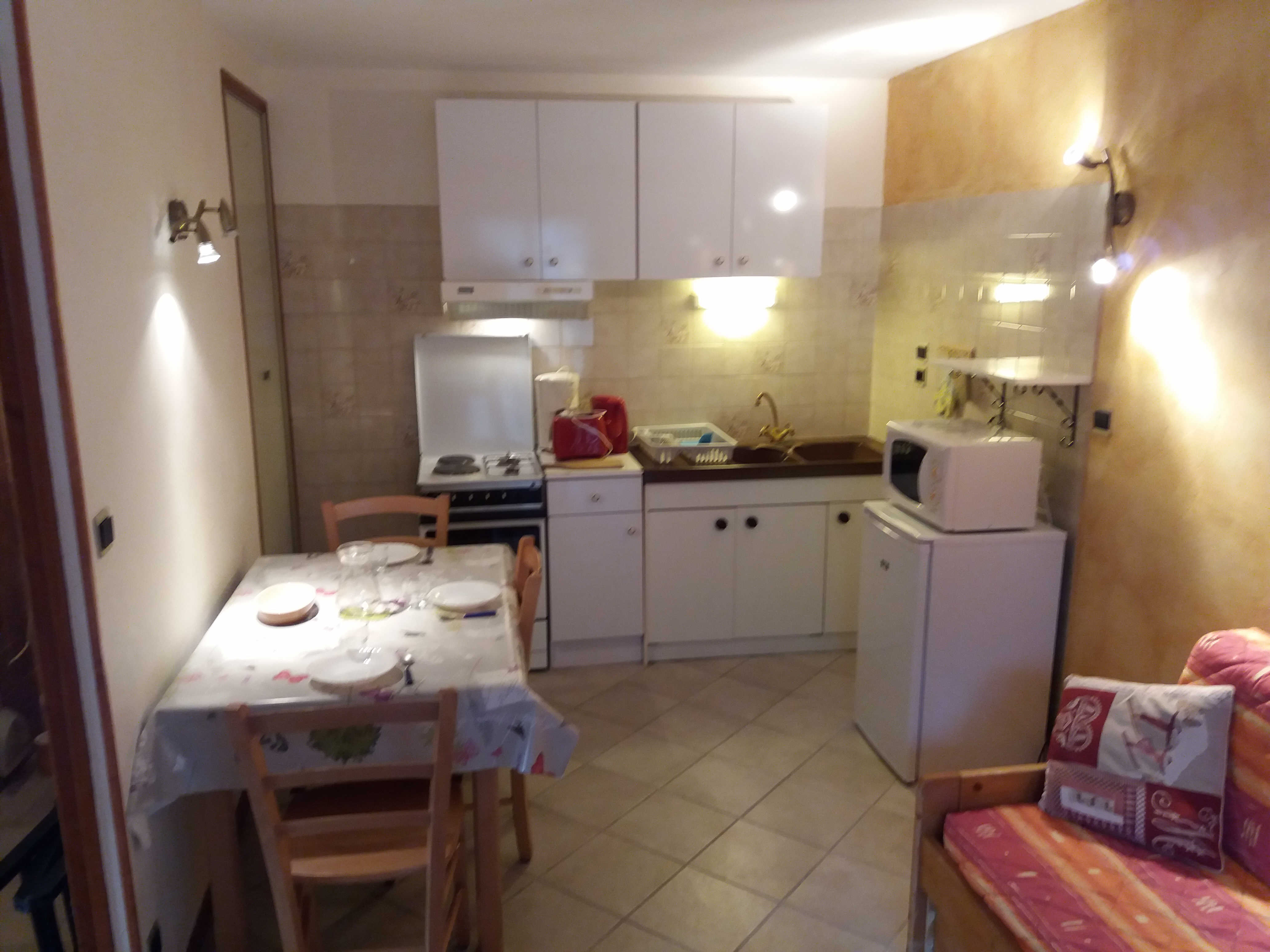 Séjour cuisinette équipée d'une gazinière, four, micro-ondes, réfrigérateur, deux lits gigognes. Une chambre avec un lit deux places.