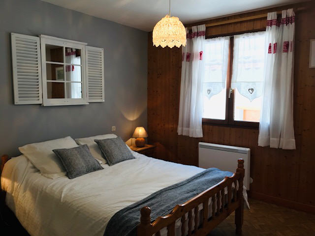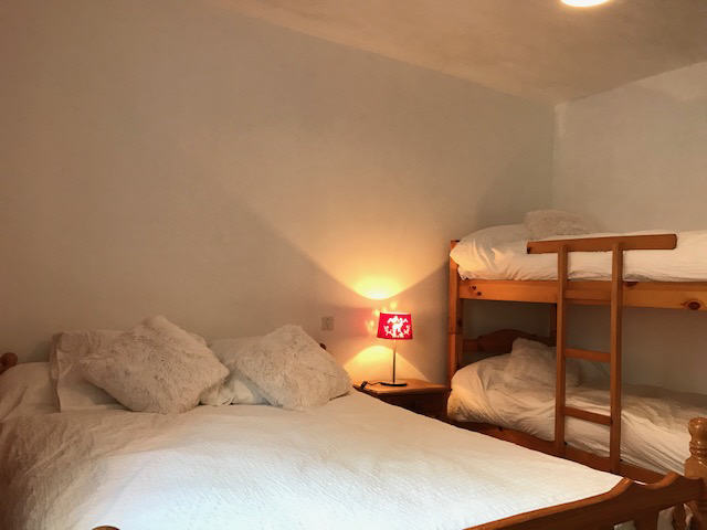 Une chambre avec un lit deux places. Une chambre avec un lit deux places et deux lits superposés.