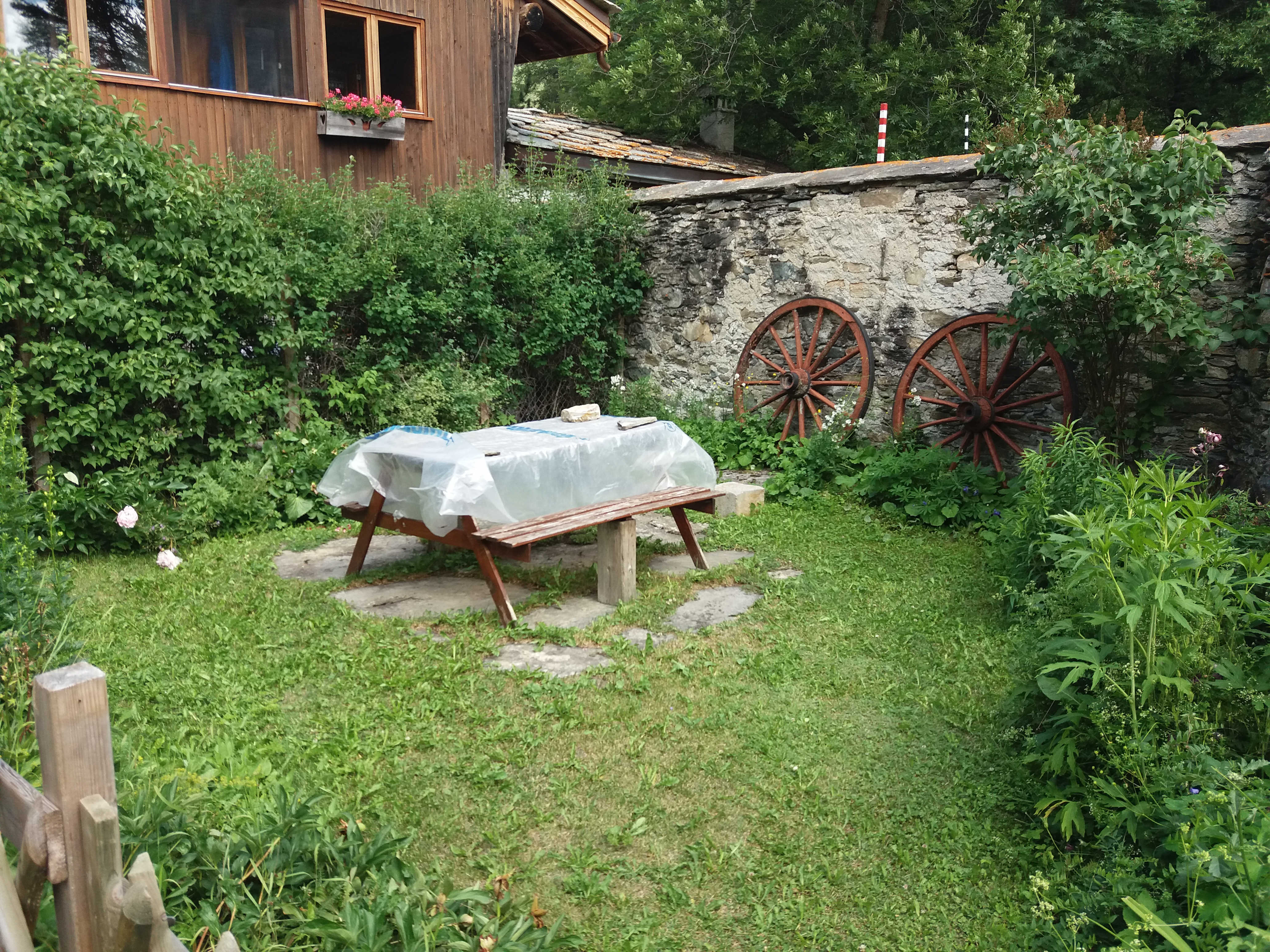 Accès sur un terrain l'été équipé d'une table.