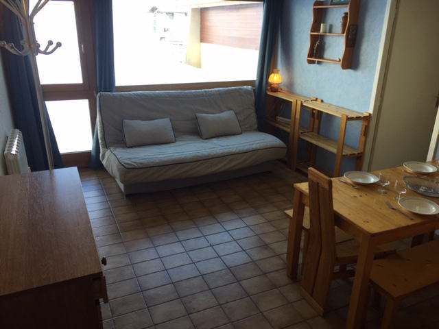 Entrée coin montagne : deux lits superposés, séjour avec un canapé lit deux places.