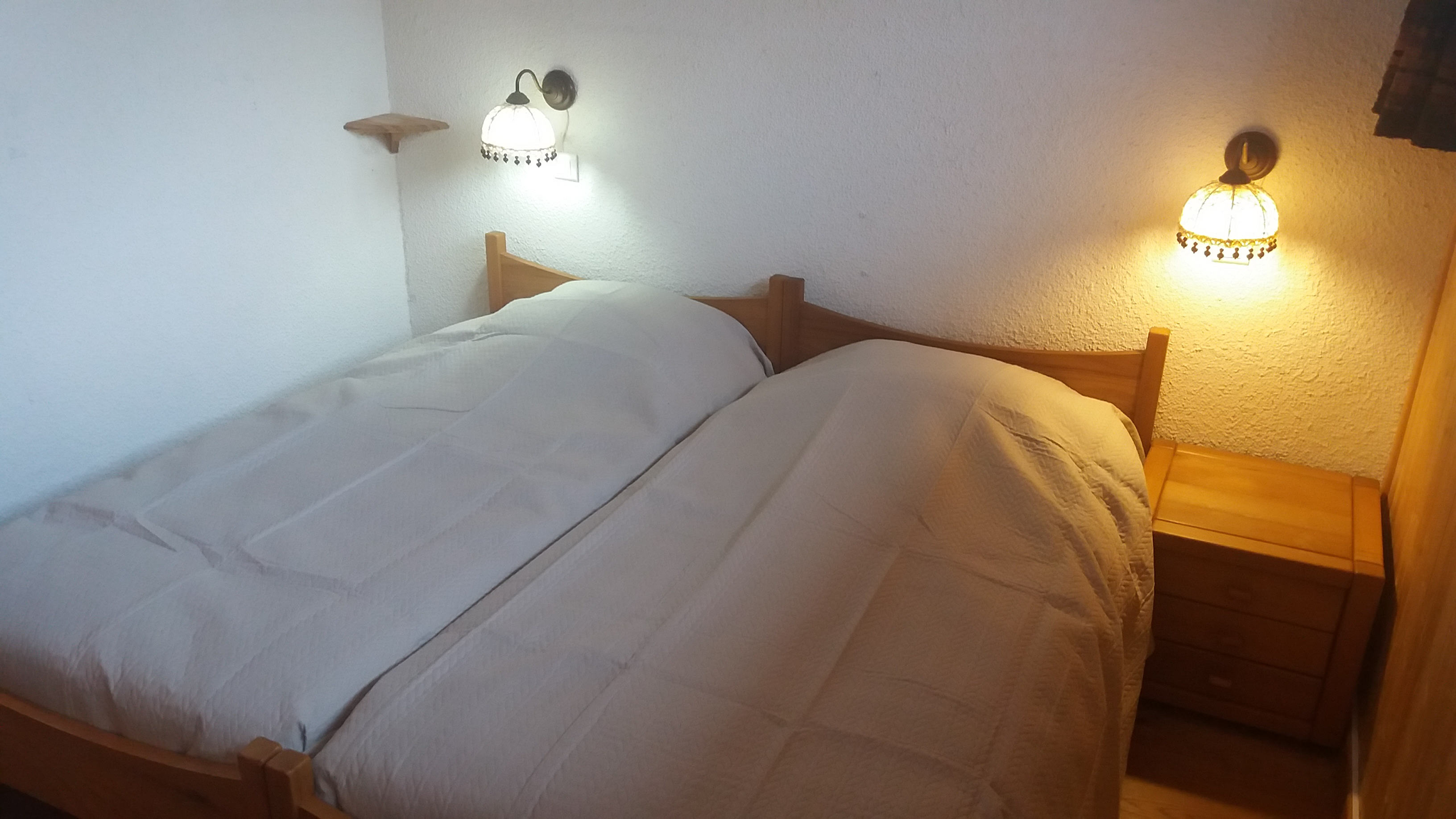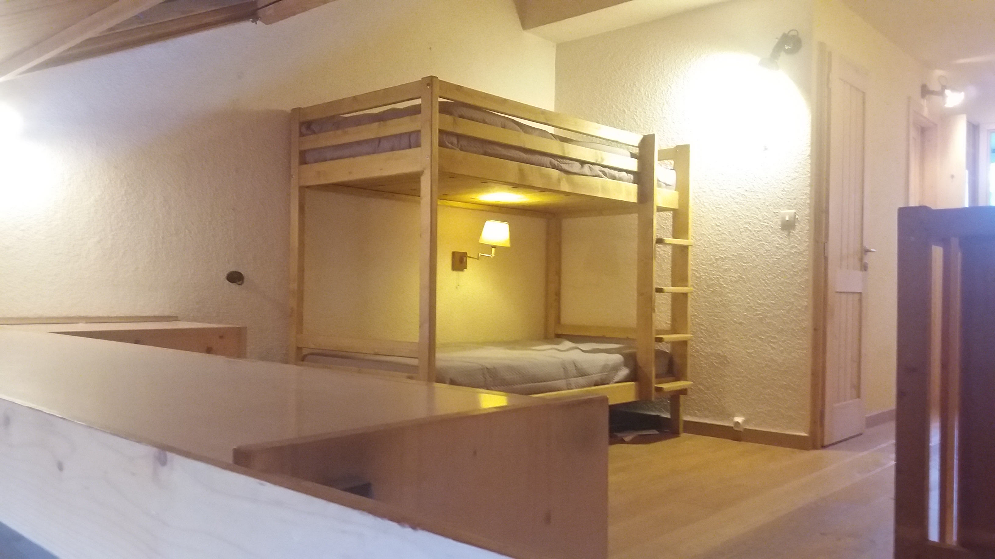 Chambre avec deux lits une place (90 cm). Coin mezzanine avec lits superposés et un lit une place. Prévoir housses de couettes pour lits.