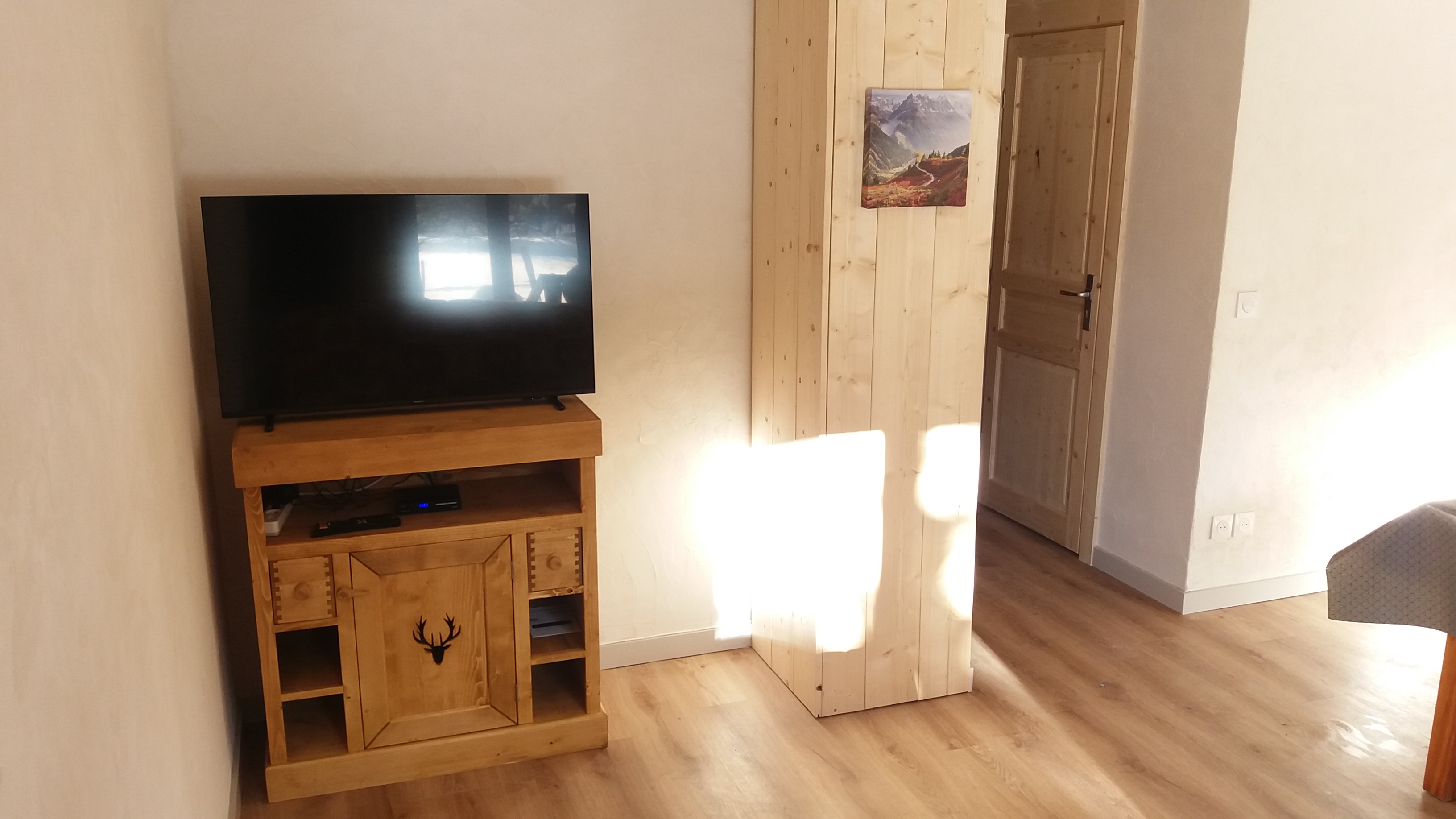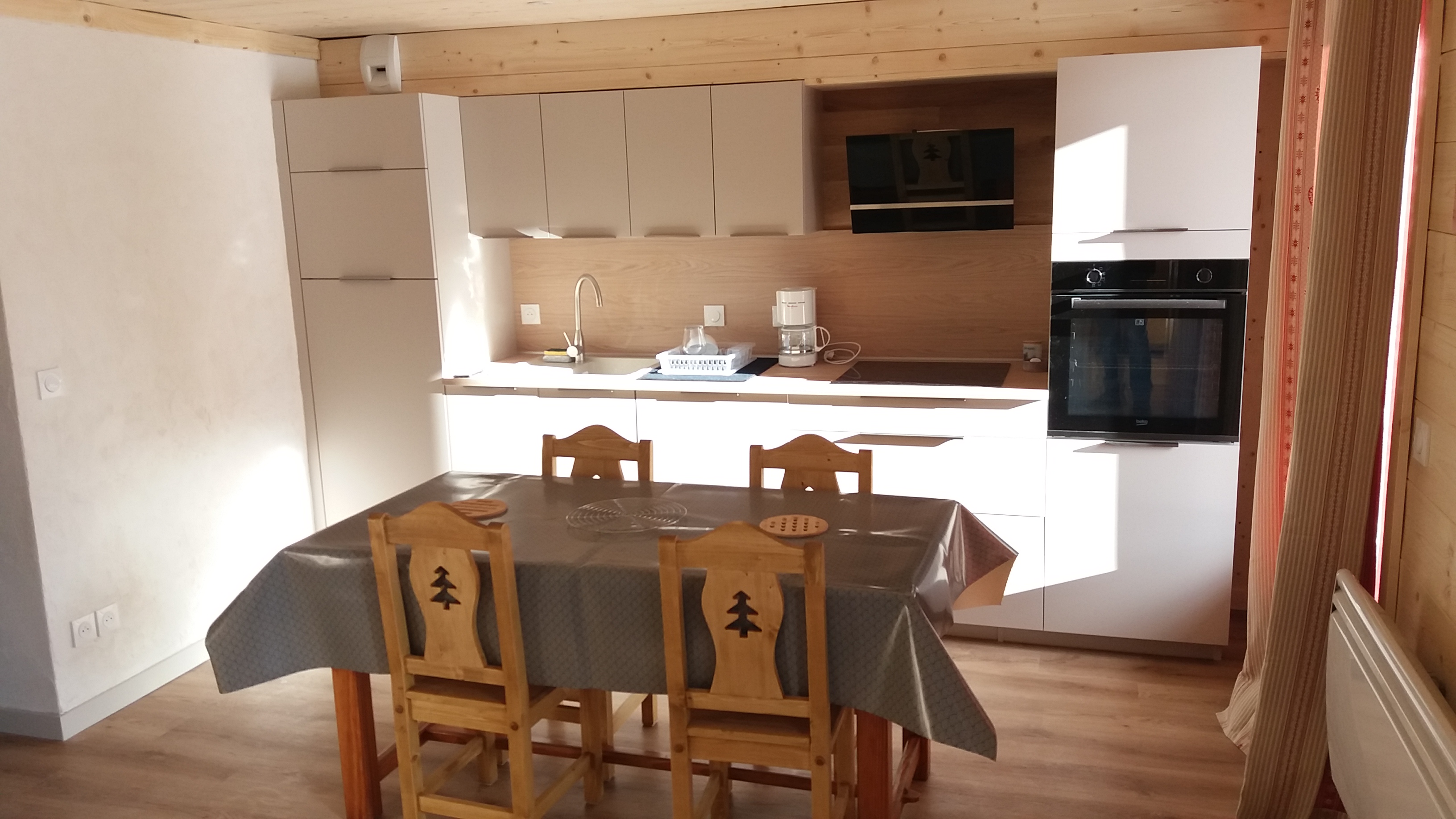 Composé d'un séjour coin cuisine entièrement équipée : plaques induction, réfrigérateur, four, micro-onde, lave-vaisselle. Ustensiles de cuisine en quantité suffisante.