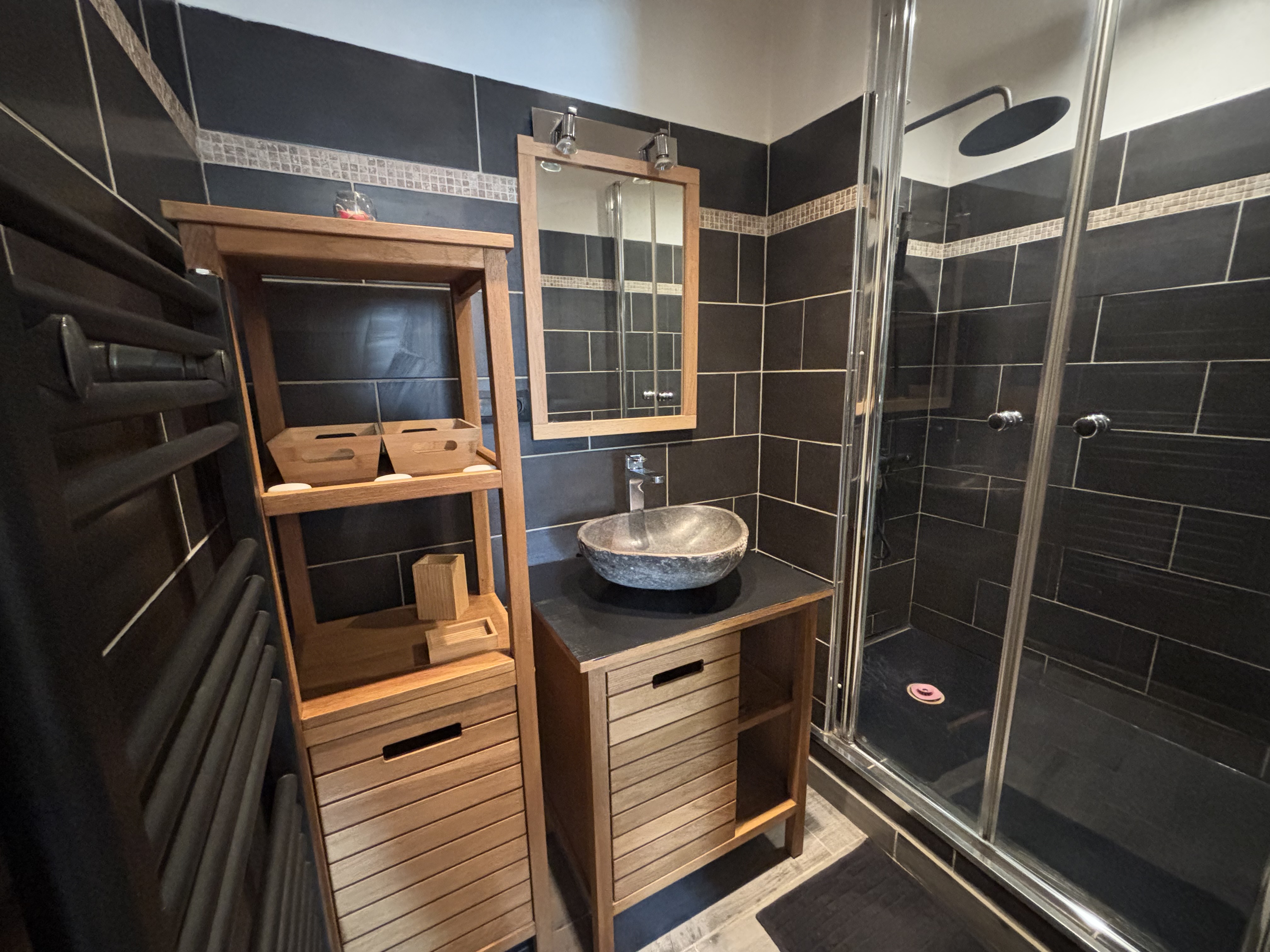 Cuisine entièrement équipée : Plaque de cuisson (3 feux électriques), hotte aspirante, four, micro-ondes, réfrigérateur avec compartiment congélation, cafetière Nespresso, bouilloire