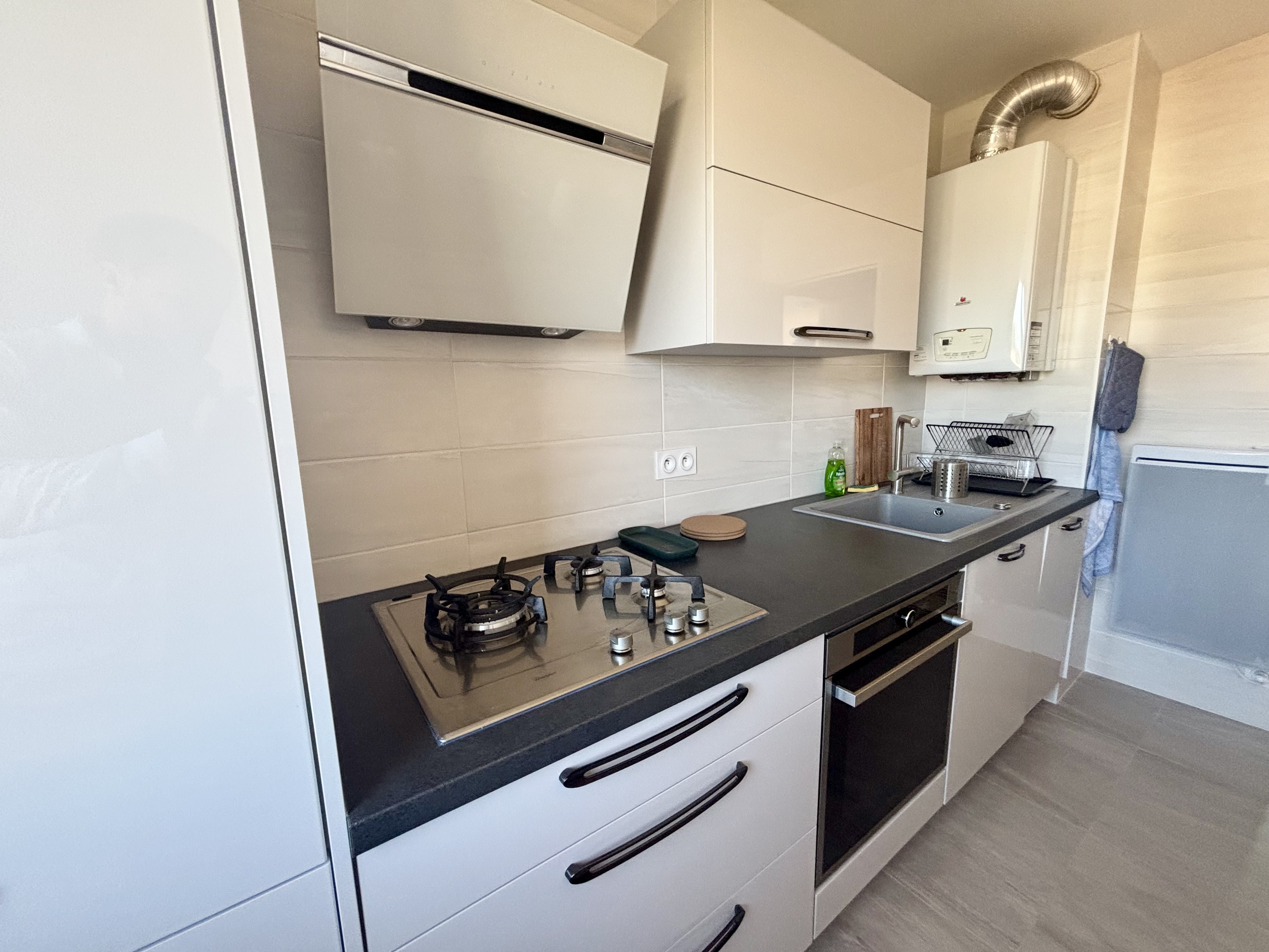 -Plaques de cuisson (3 foyers), hotte aspirante, four, micro-ondes, réfrigérateur avec compartiment congélation, cafetière, bouilloire, grille-pain,