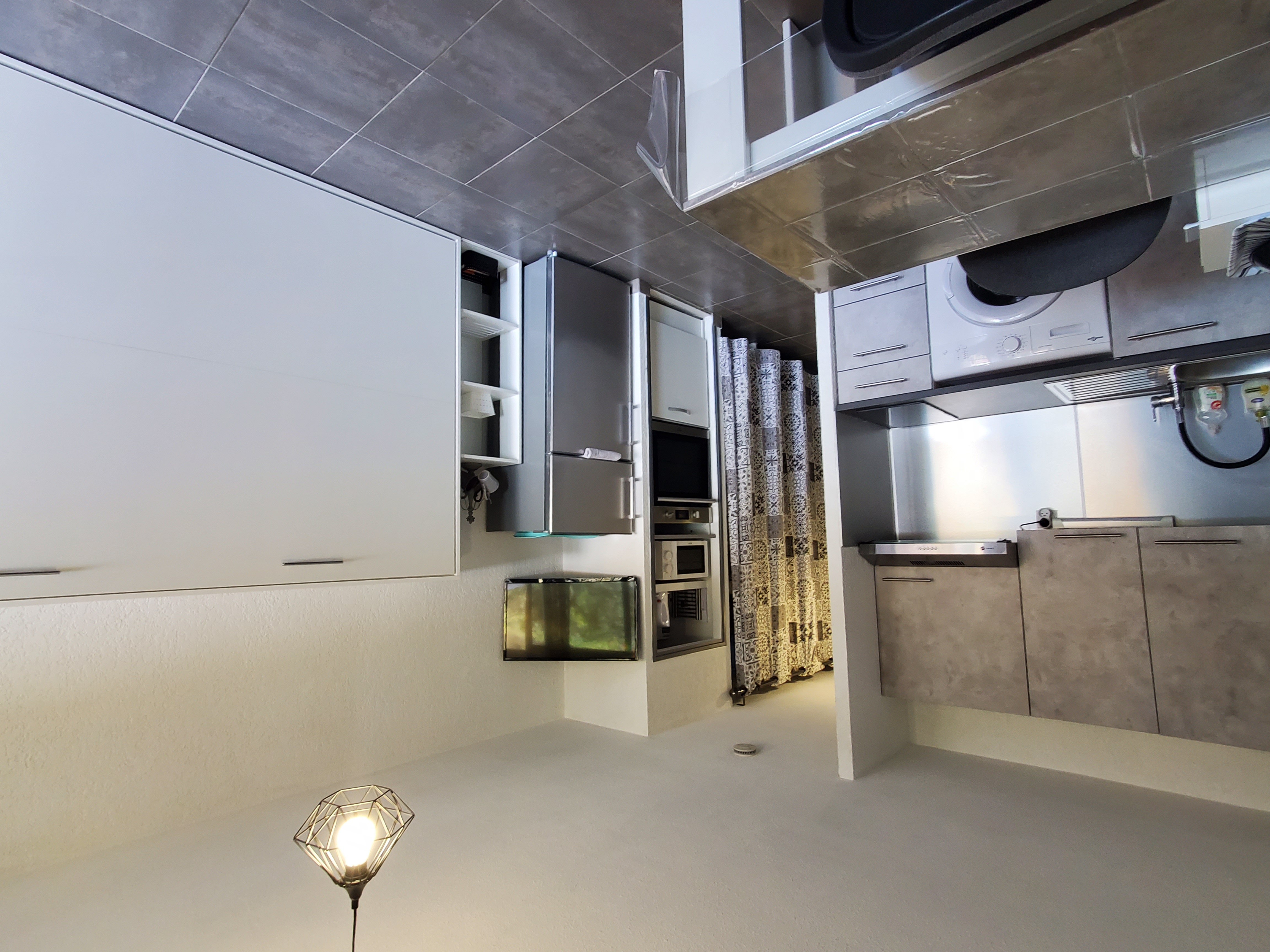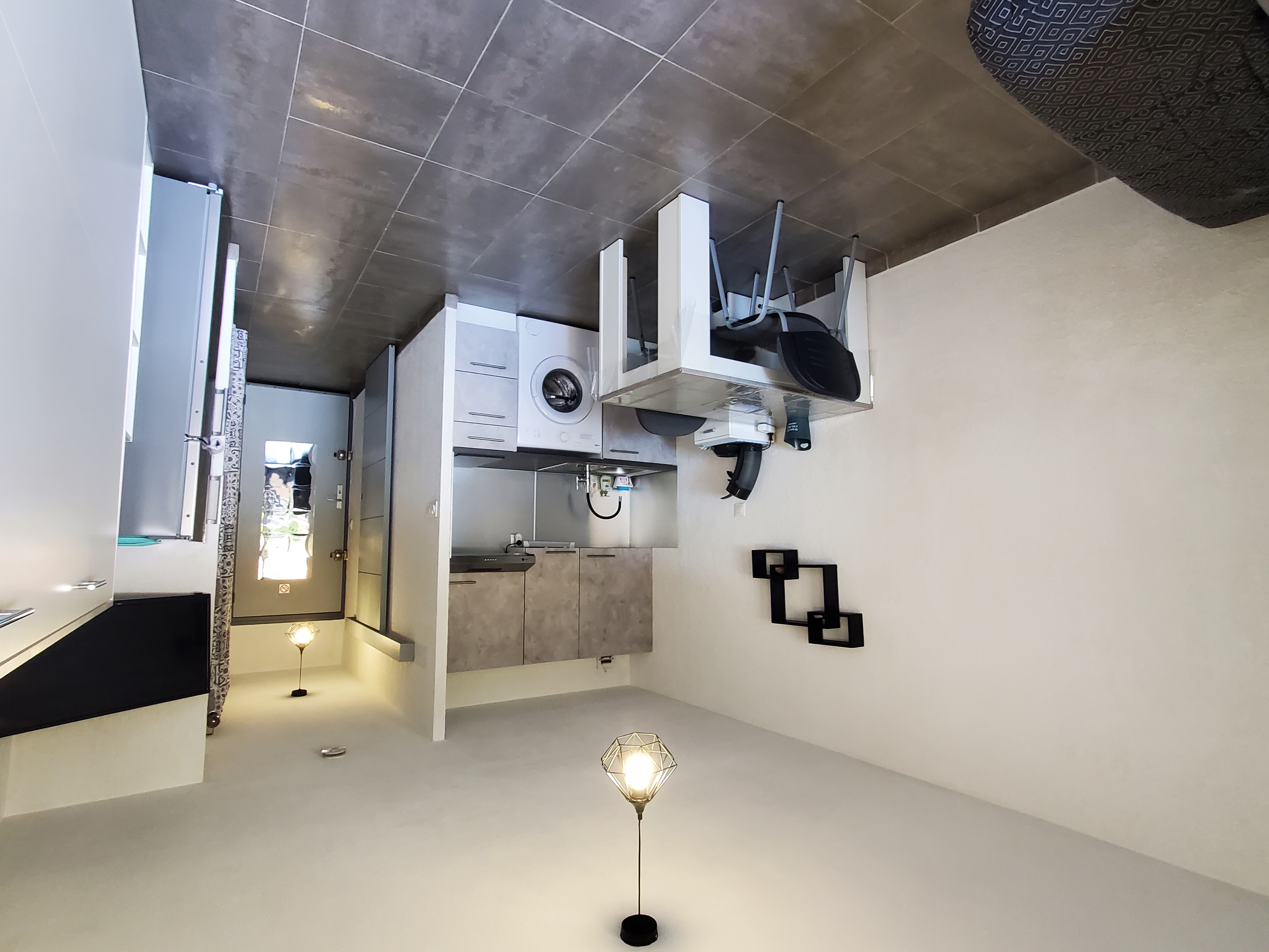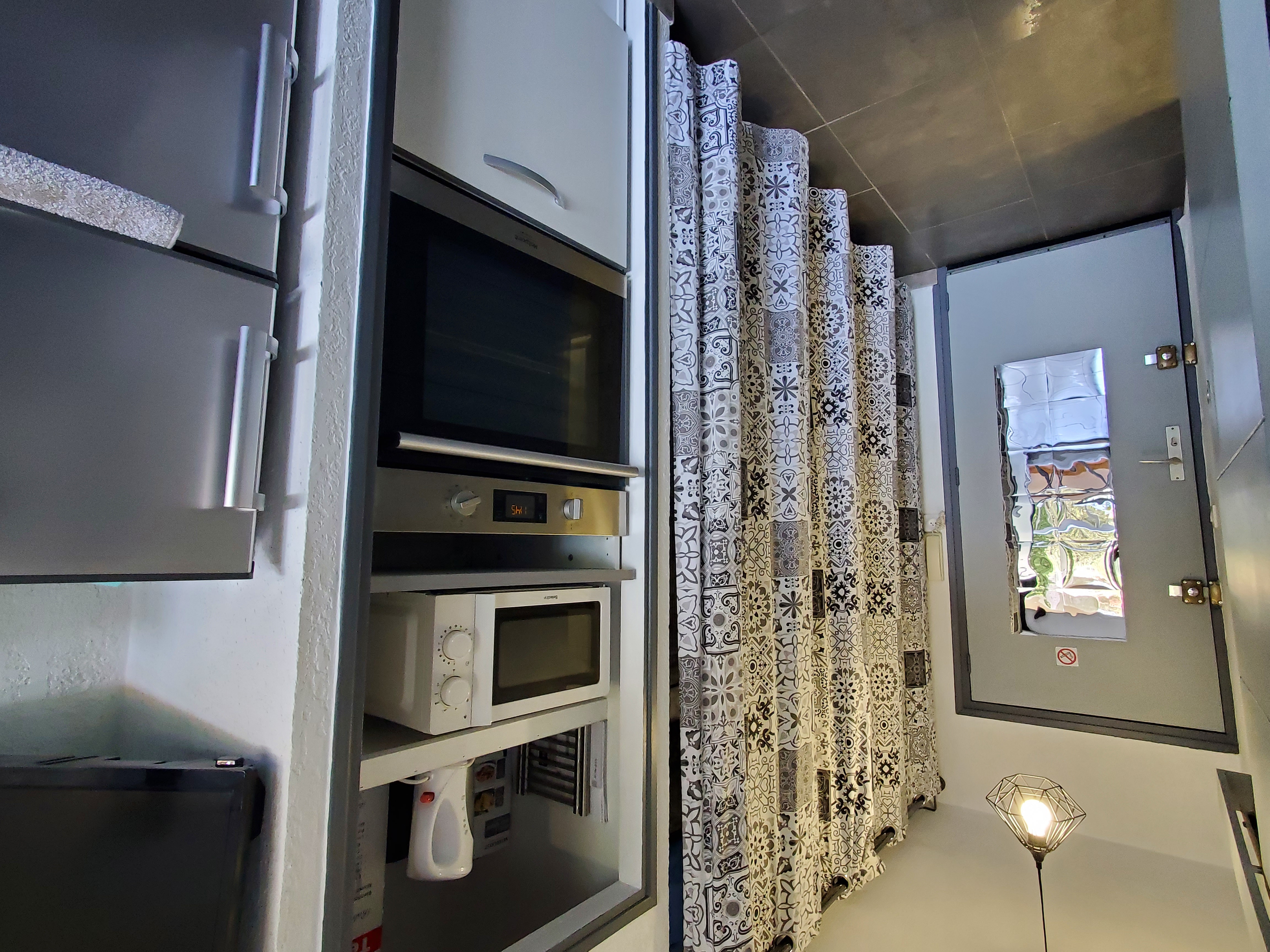 -Plaques de cuisson ( 2 feux à induction), hotte aspirante, micro-ondes, réfrigérateur avec compartiment congélation, cafetière Senseo (dosettes), bouilloire, grille-pain, appareil à croque-monsieur,