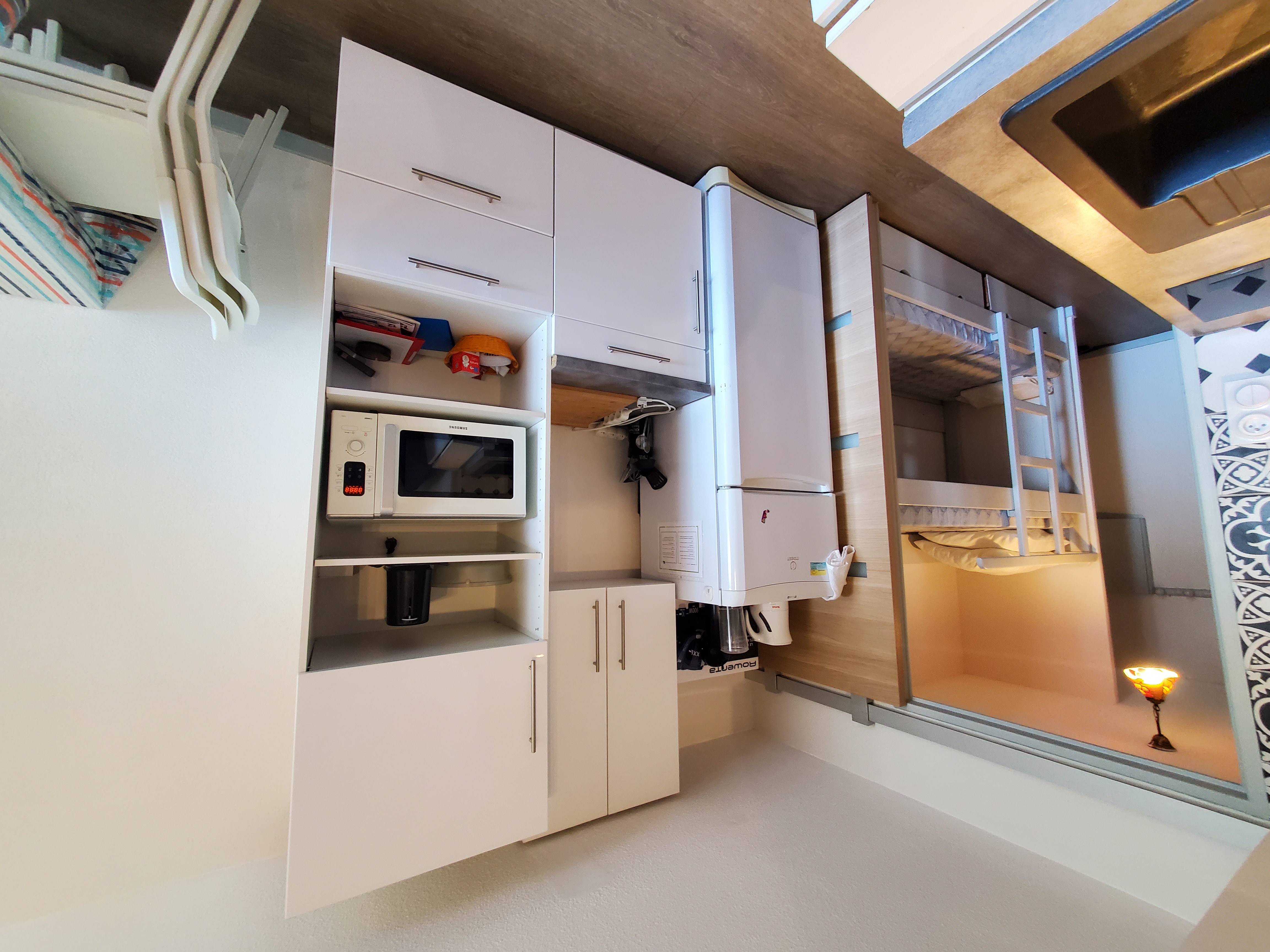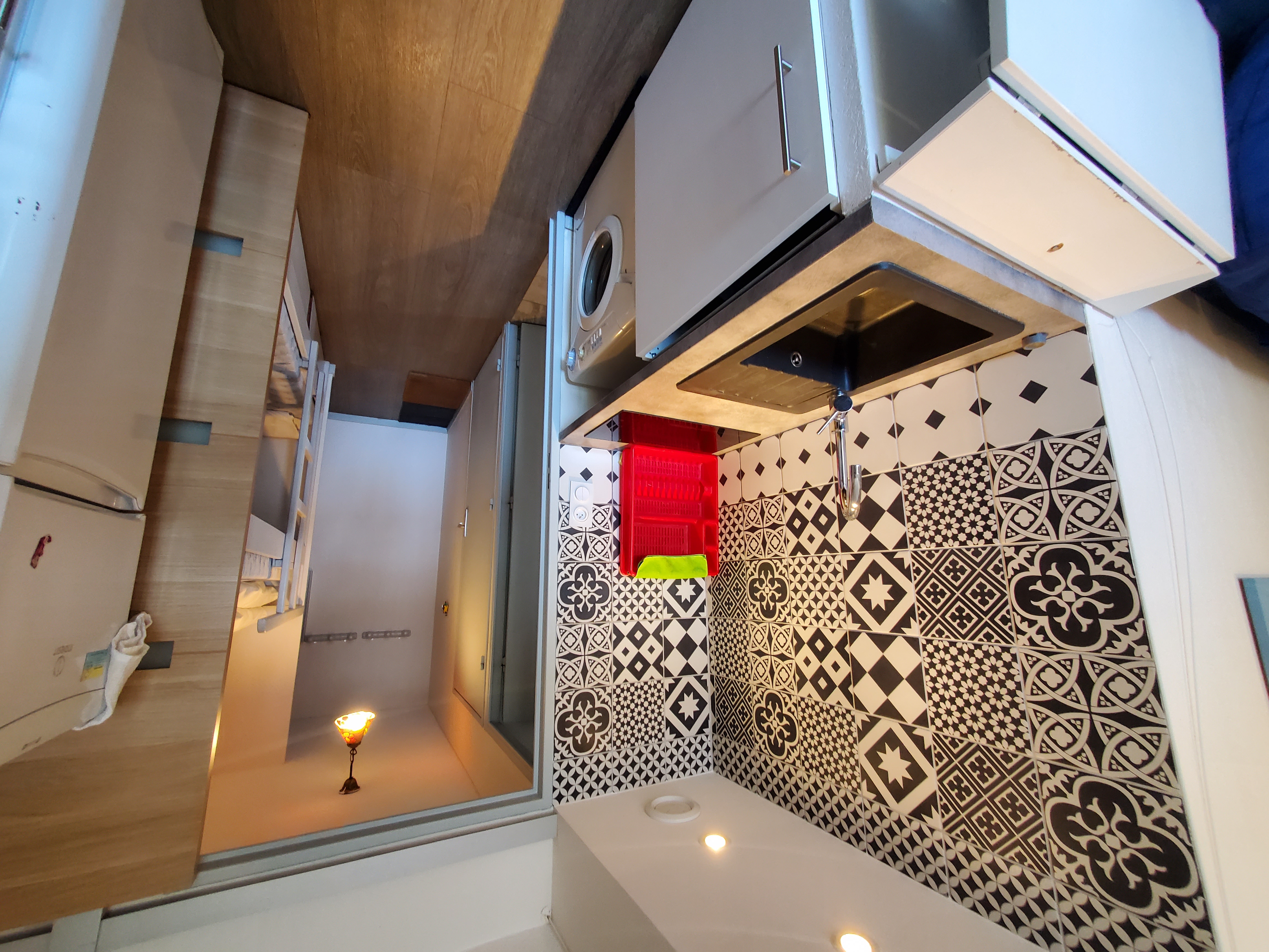 -Plaques de cuisson (2 feux à induction), microondes multifonction, minifour, réfrigérateur avec compartiment congélation, cafetière Dolce Gusto (capsules) et à filtre, bouilloire, grille-pain