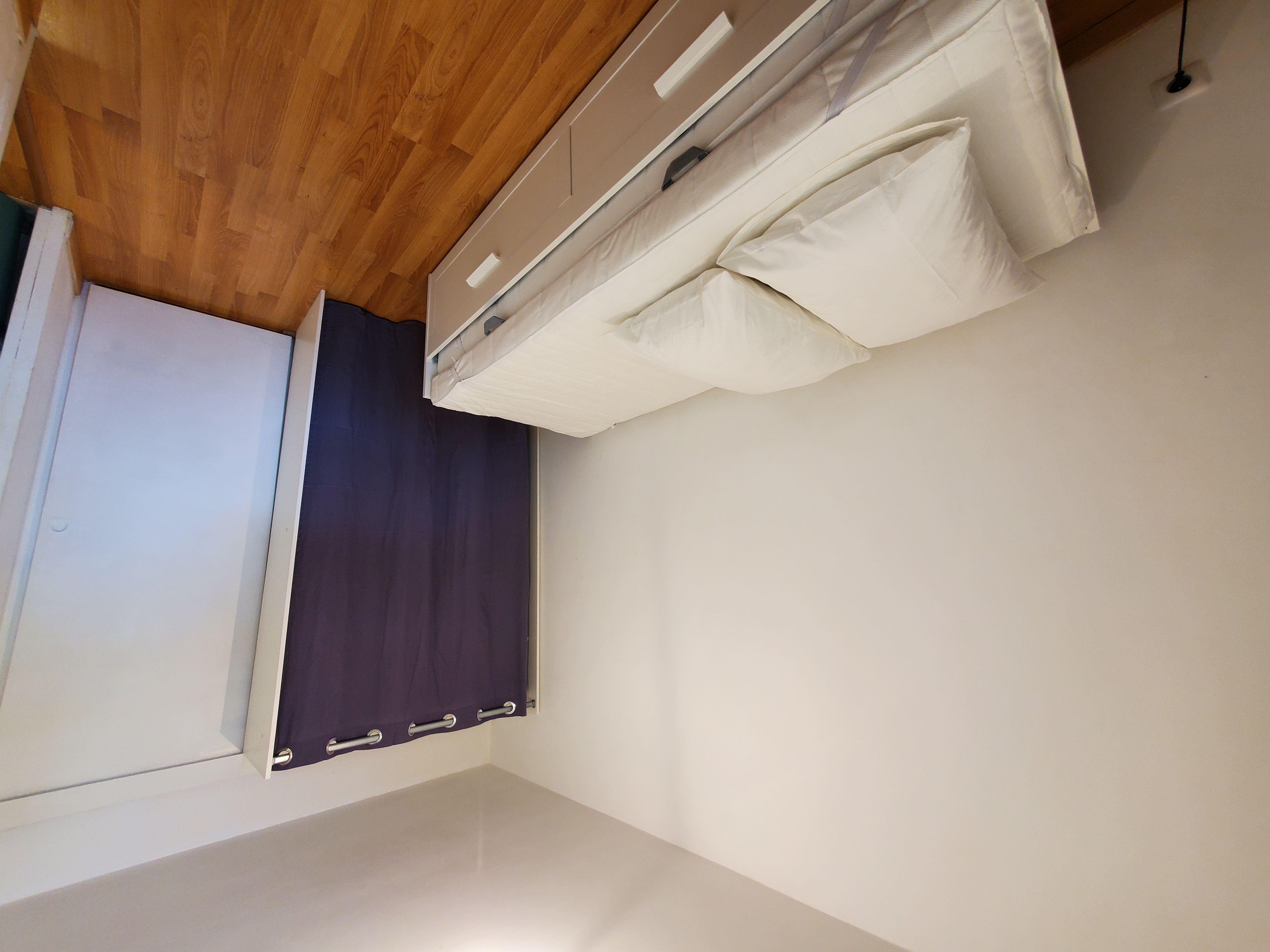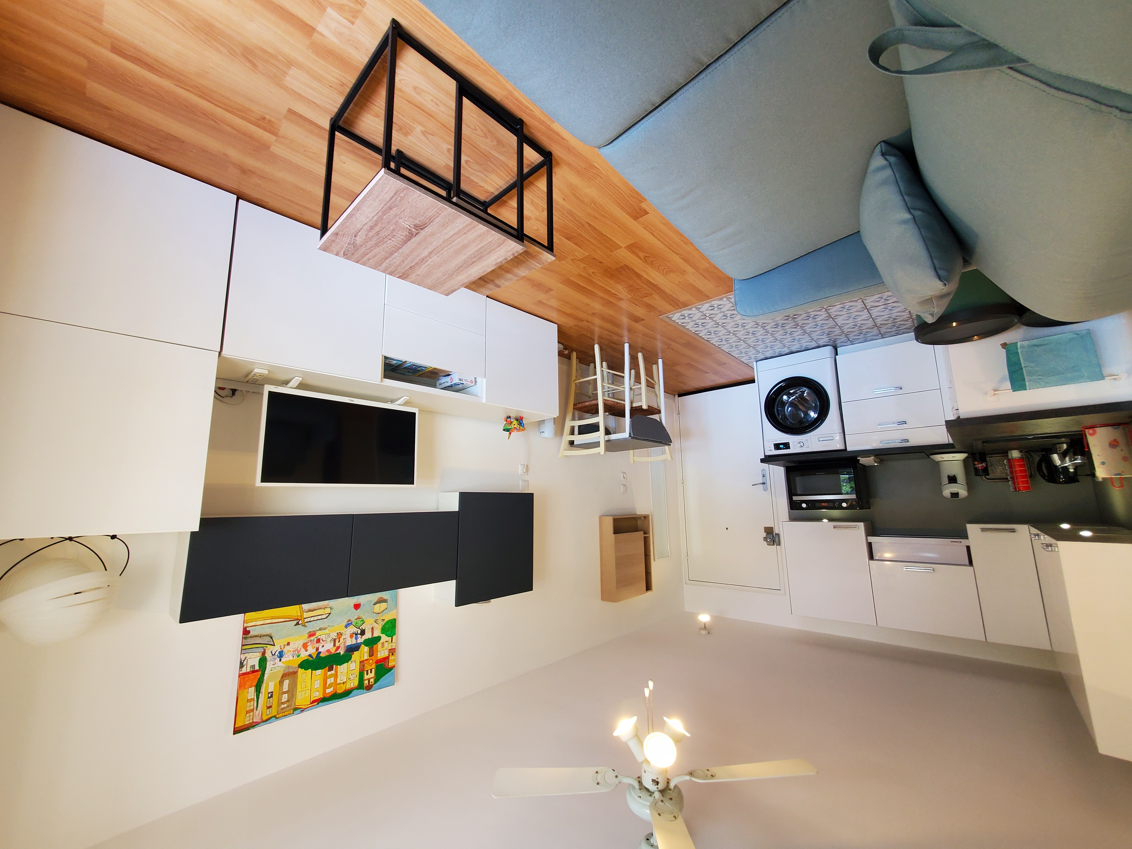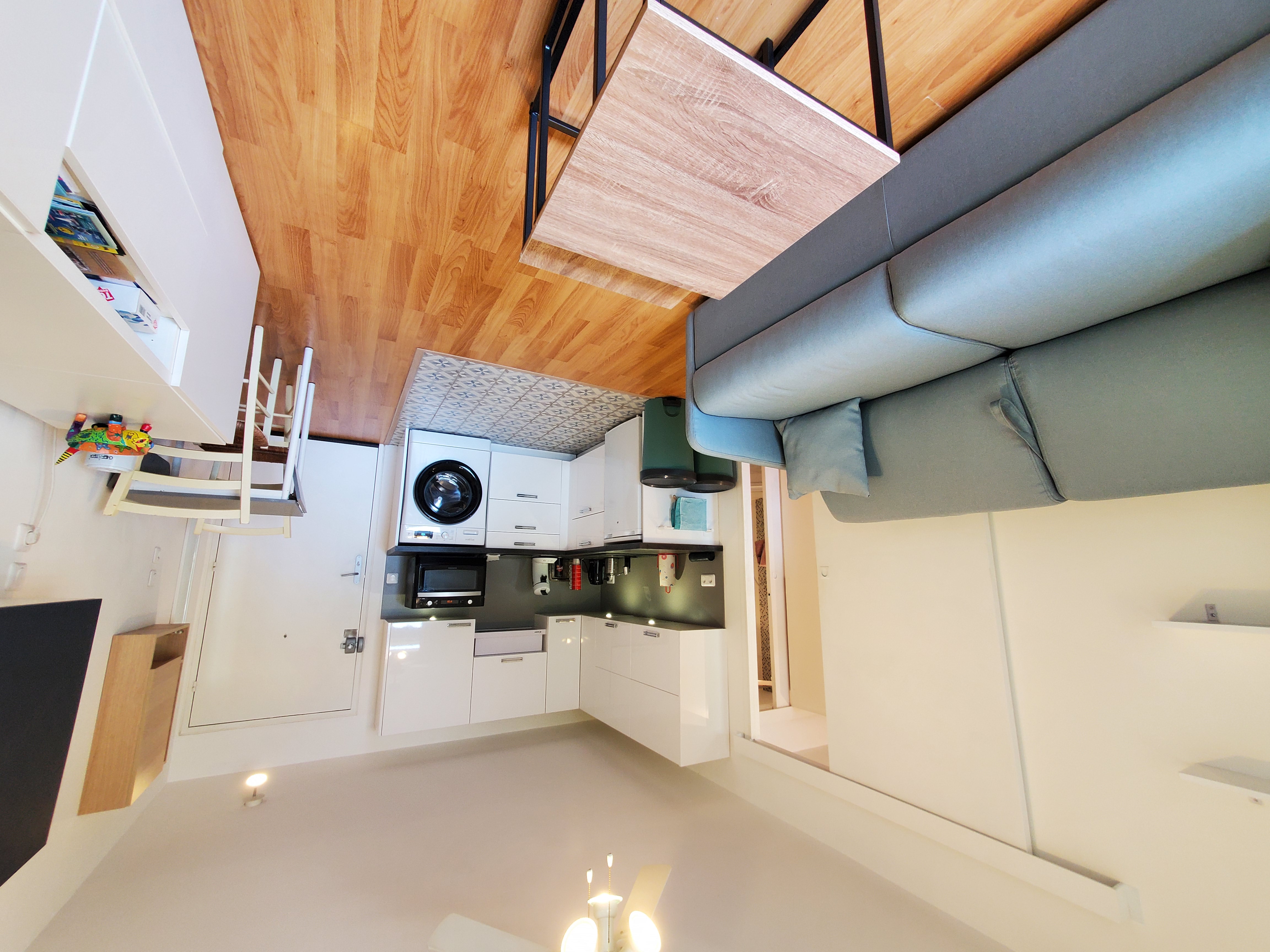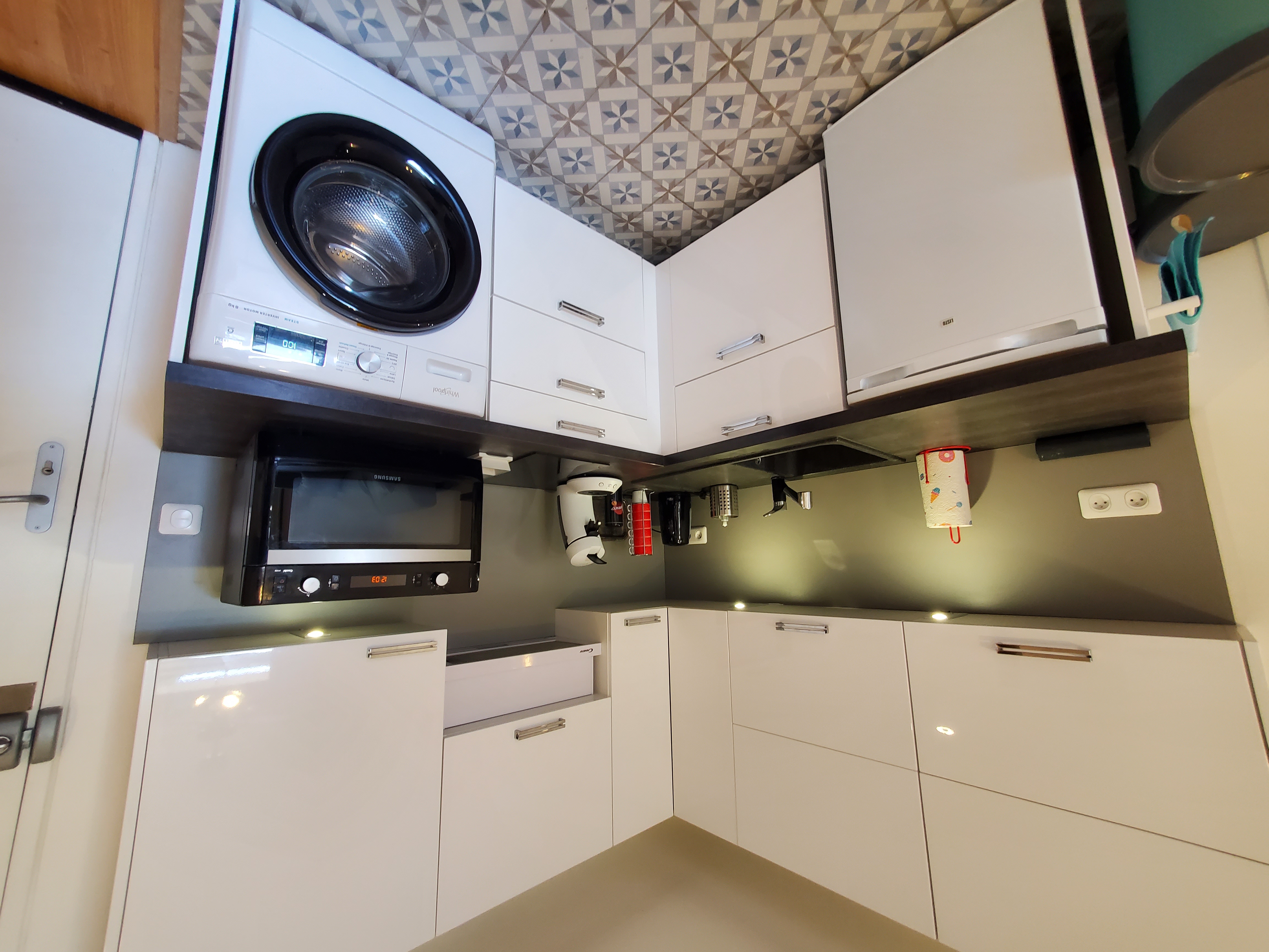 -Plaques de cuisson (2 feux), minifour multifonction, hotte aspirante, frigo top, cafetière Senseo (dosettes), grille-pain, bouilloire.