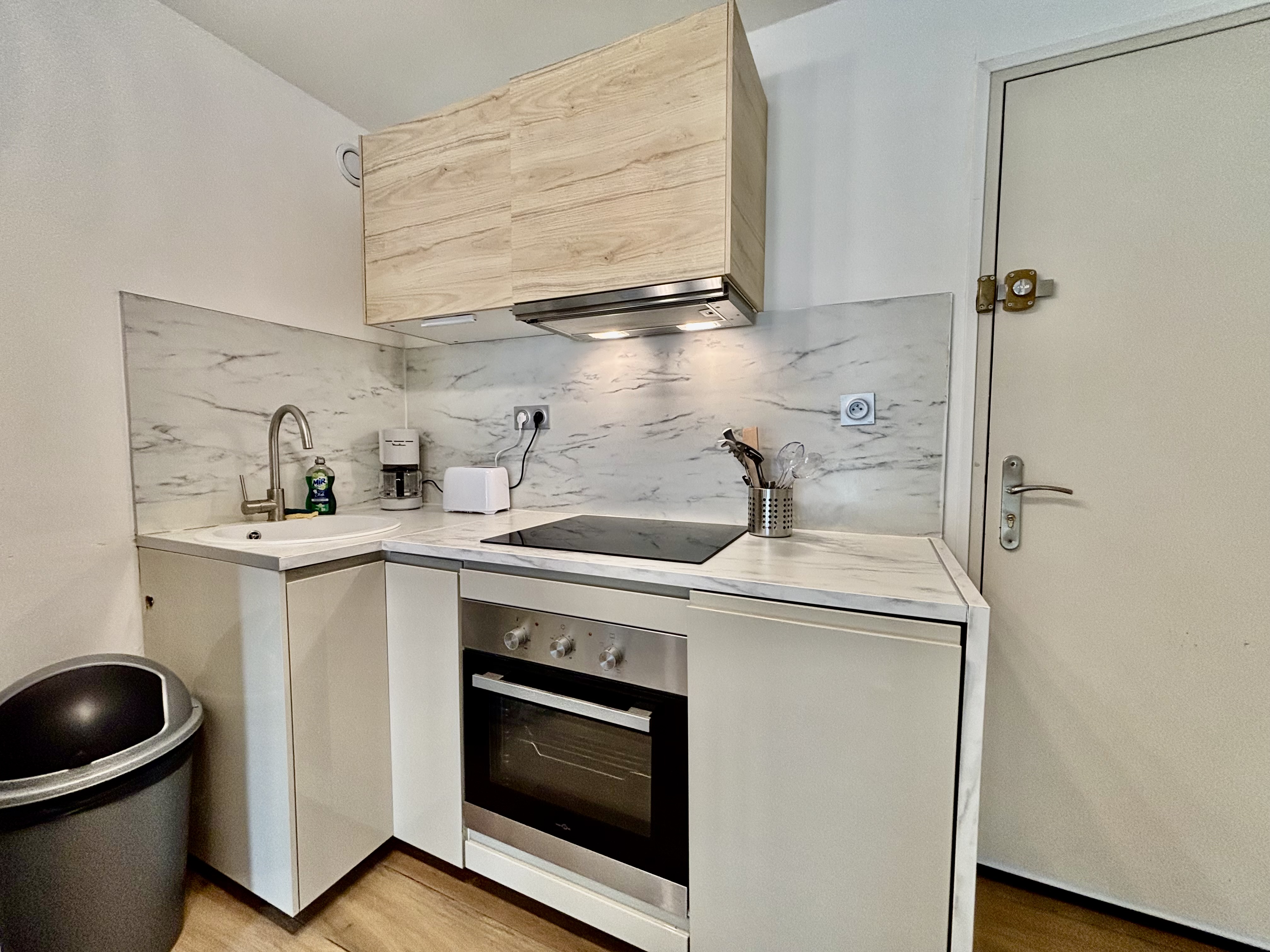 - Plaques de cuisson (3 feux), hotte aspirante, réfrigérateur, four, micro-ondes, cafetière à filtre, grille-pain, bouilloire, lave-vaisselle