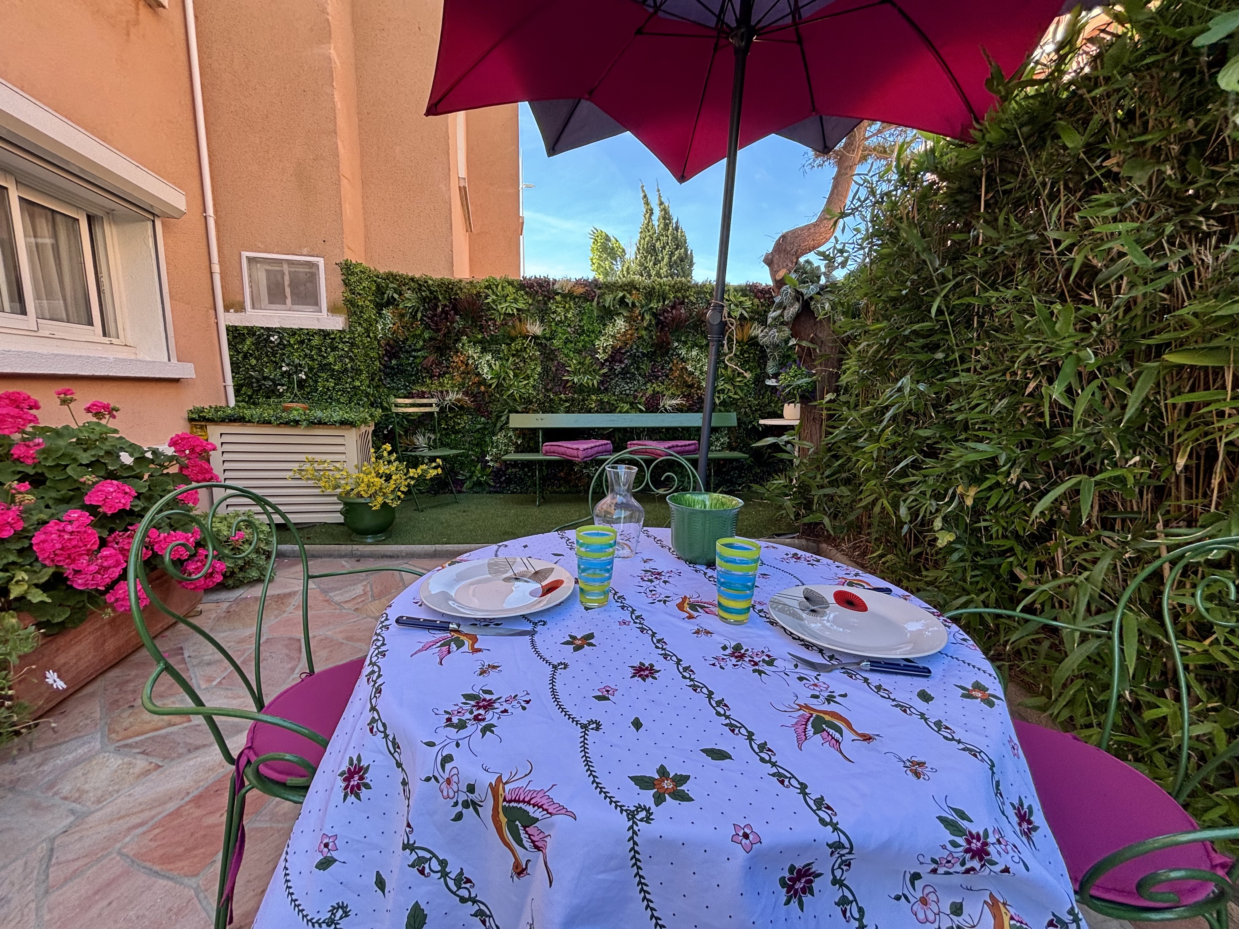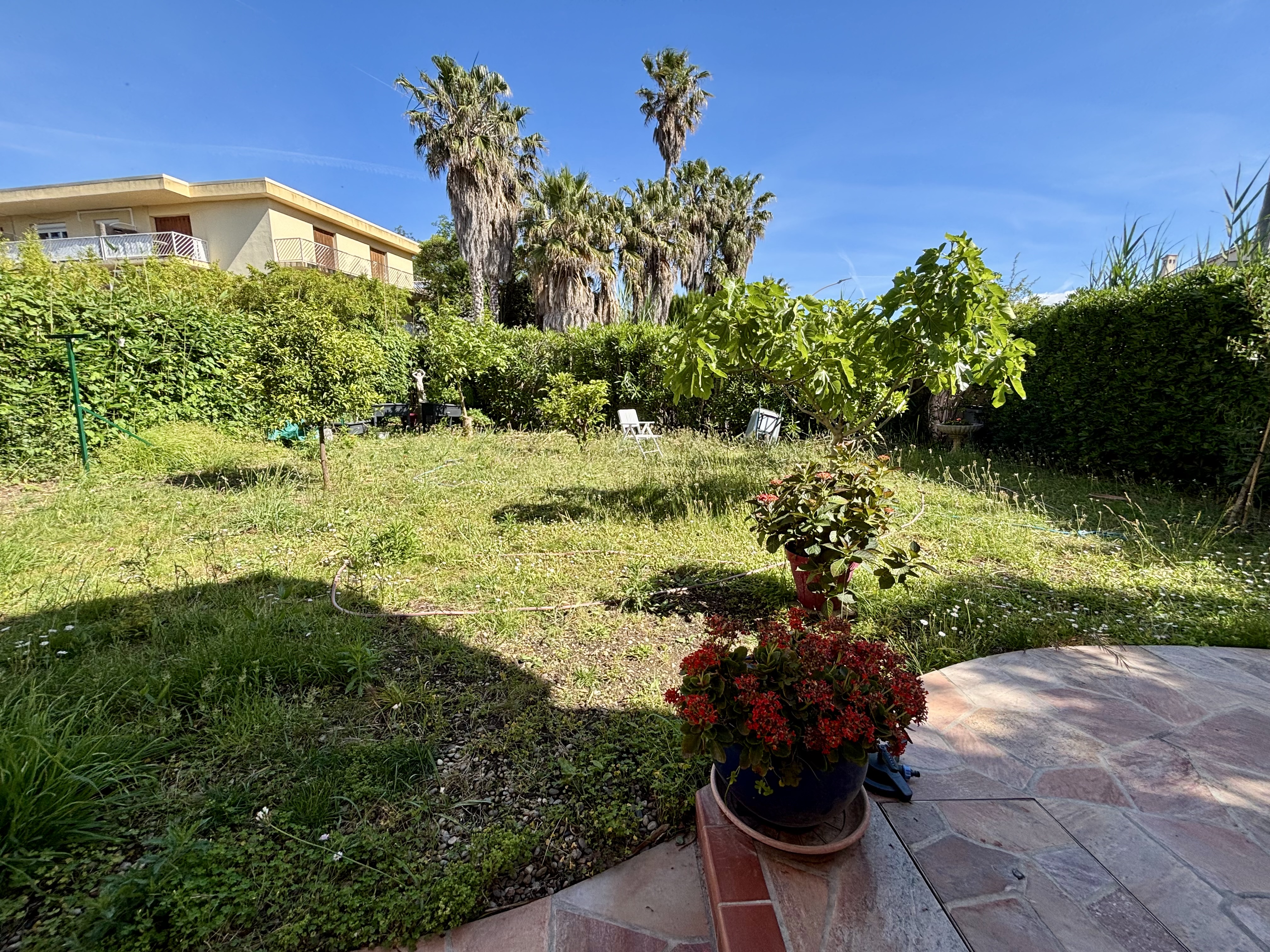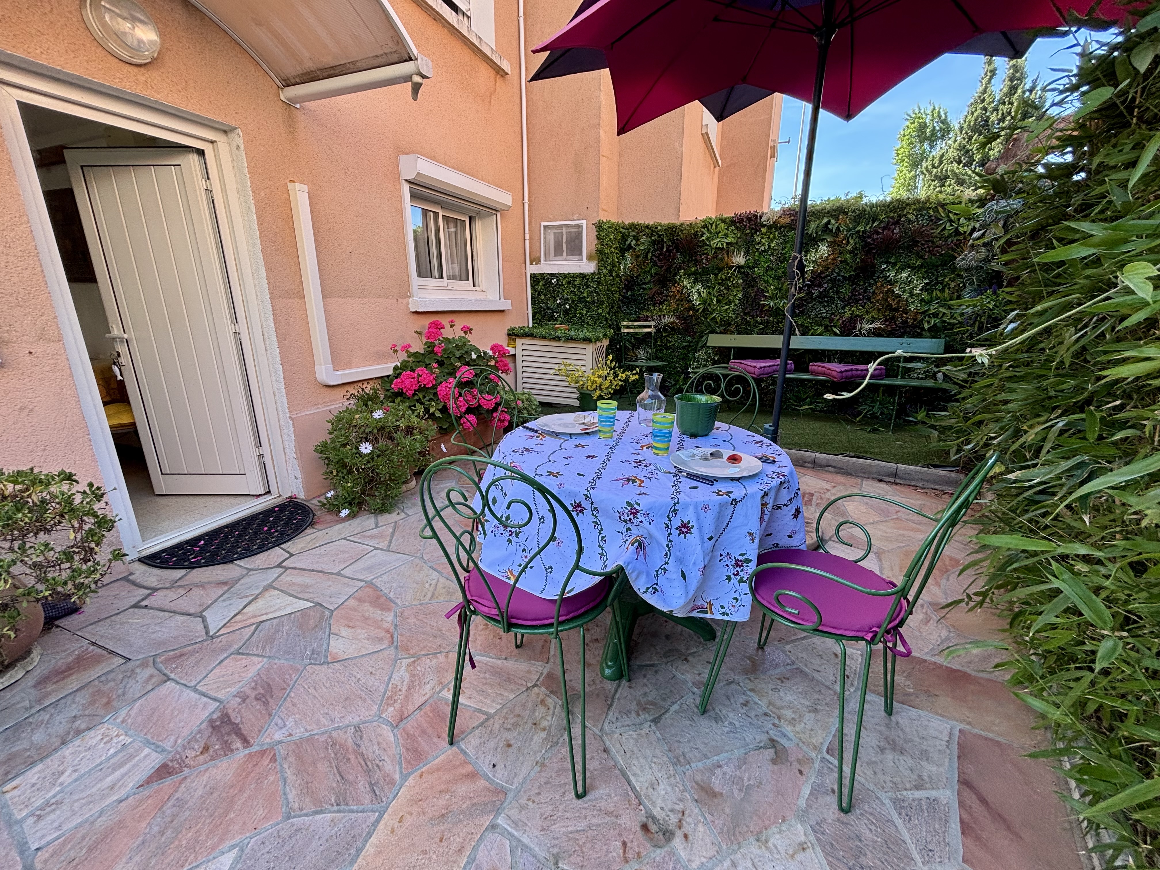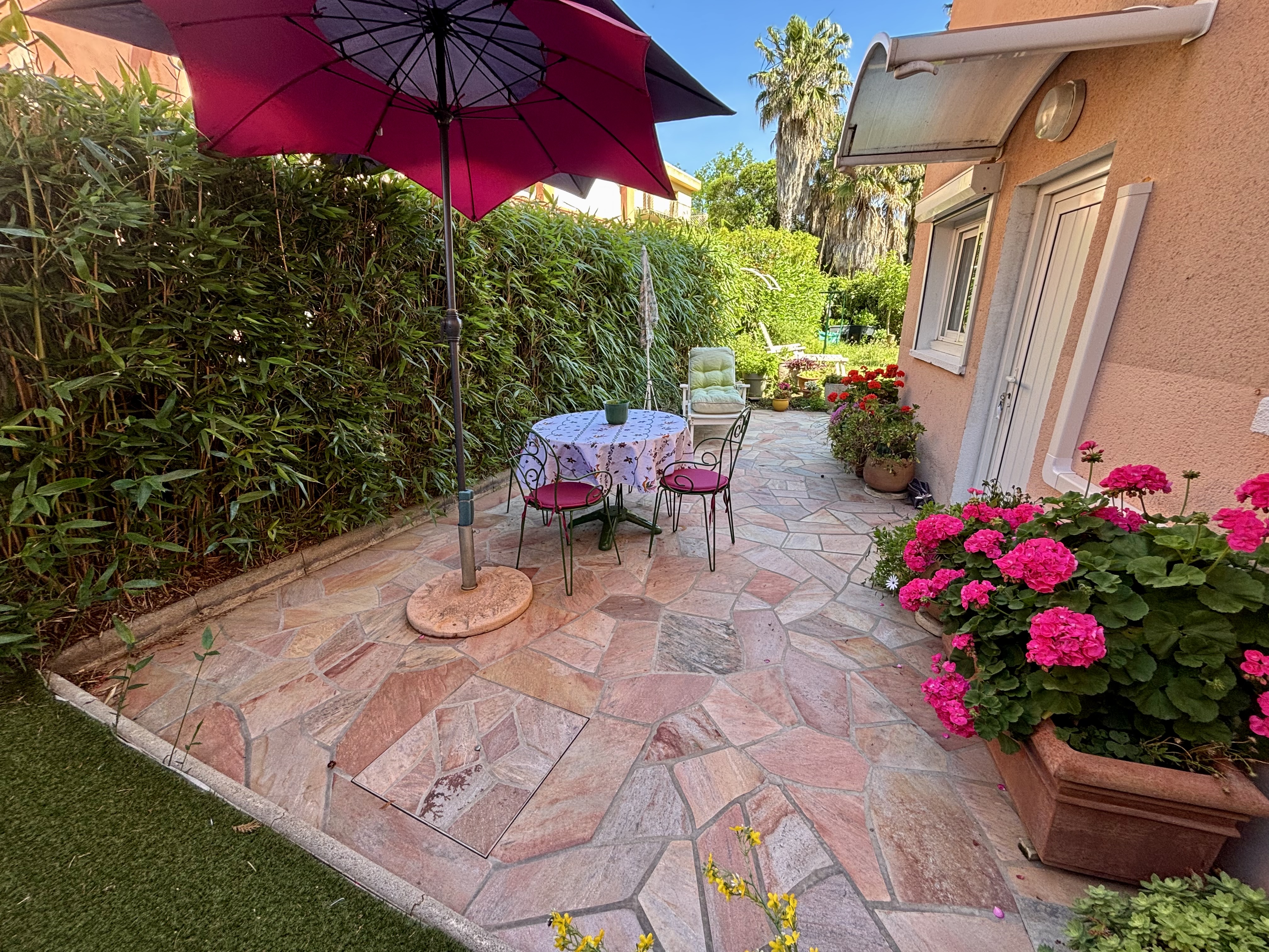 Terrasse et jardin au soleil, à proximité directe de La Plage des Sablettes