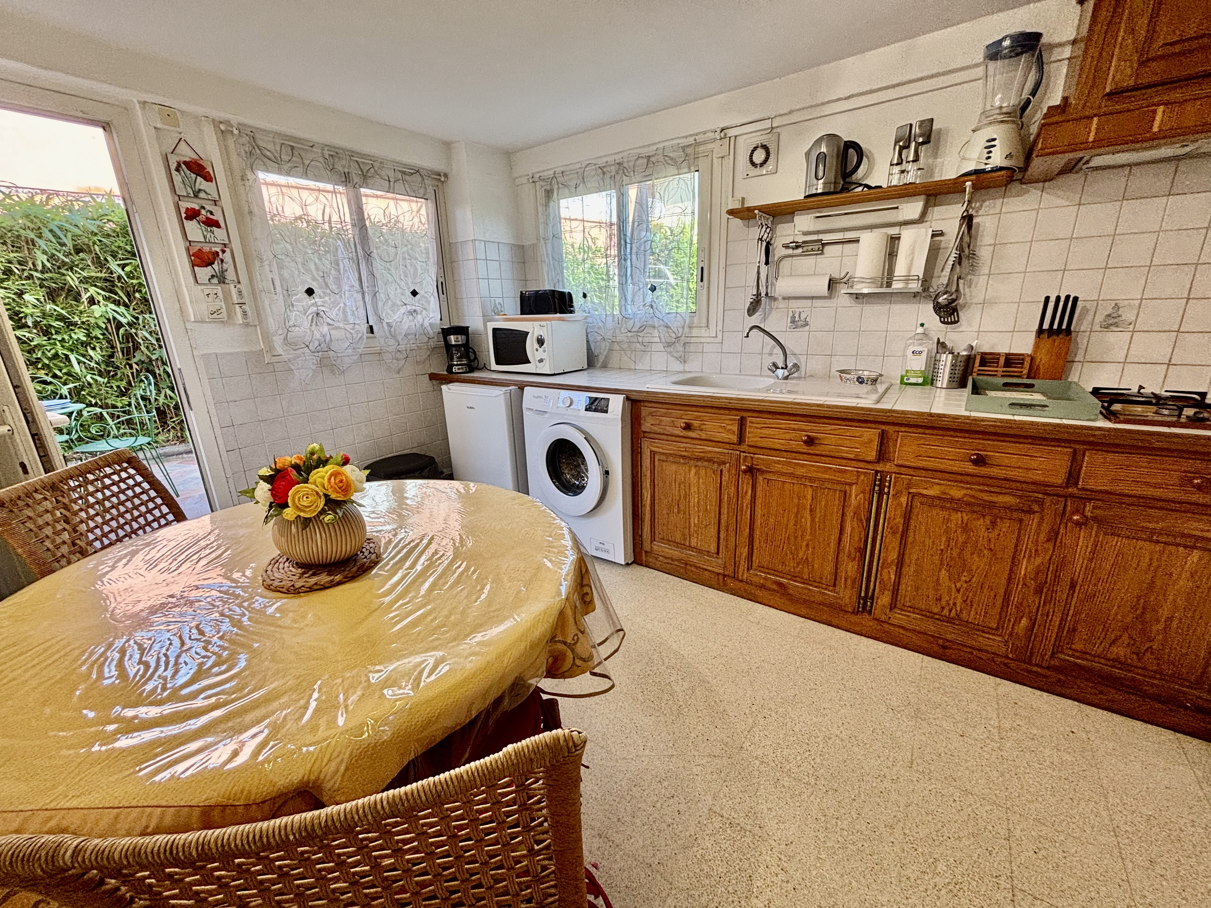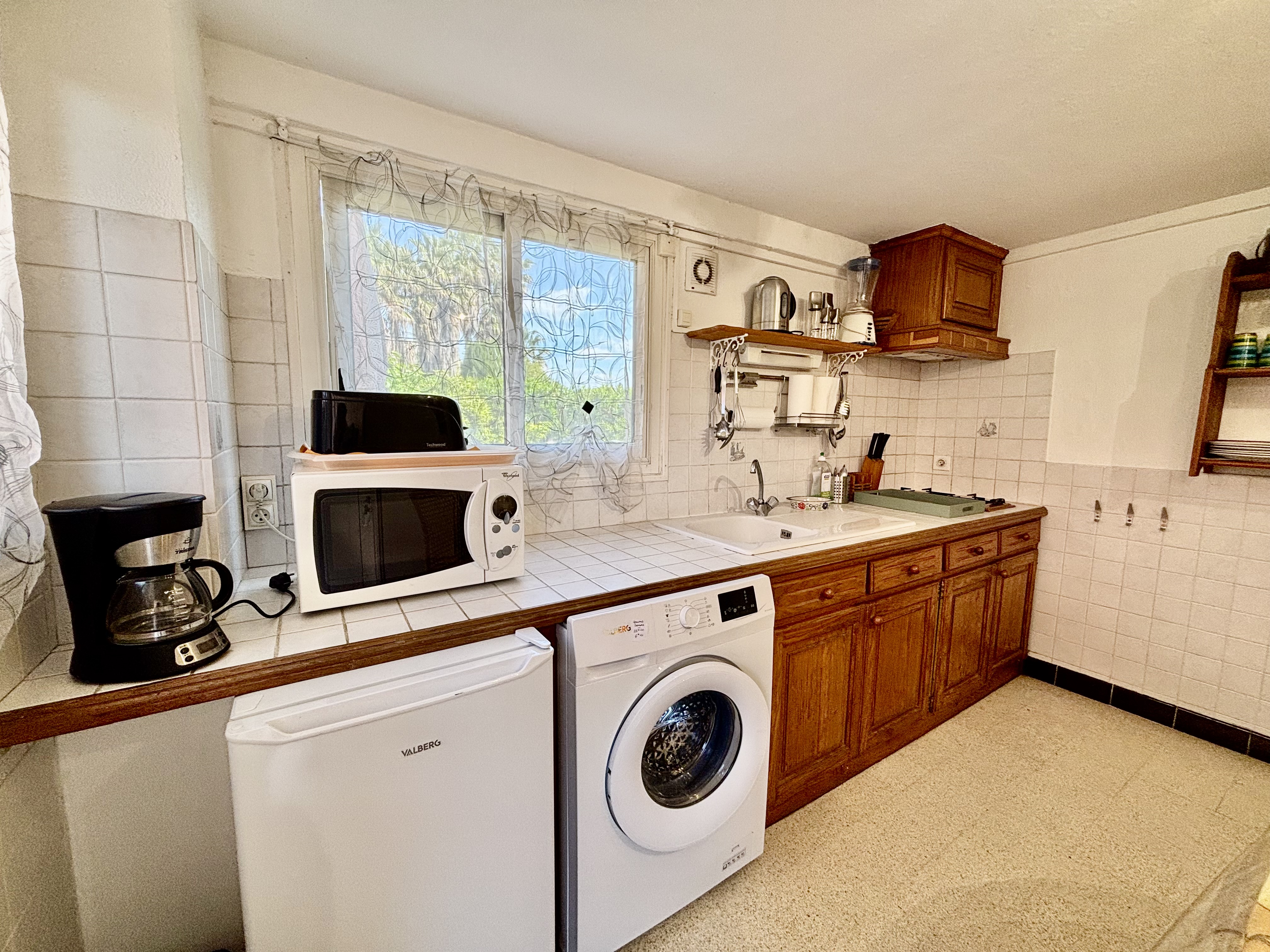 - Lave-vaisselle, plaques de cuisson (2 feux), hotte aspirante, réfrigérateur avec compartiment congélation, cafetière à filtres, bouilloire, grille-pain, mixeur