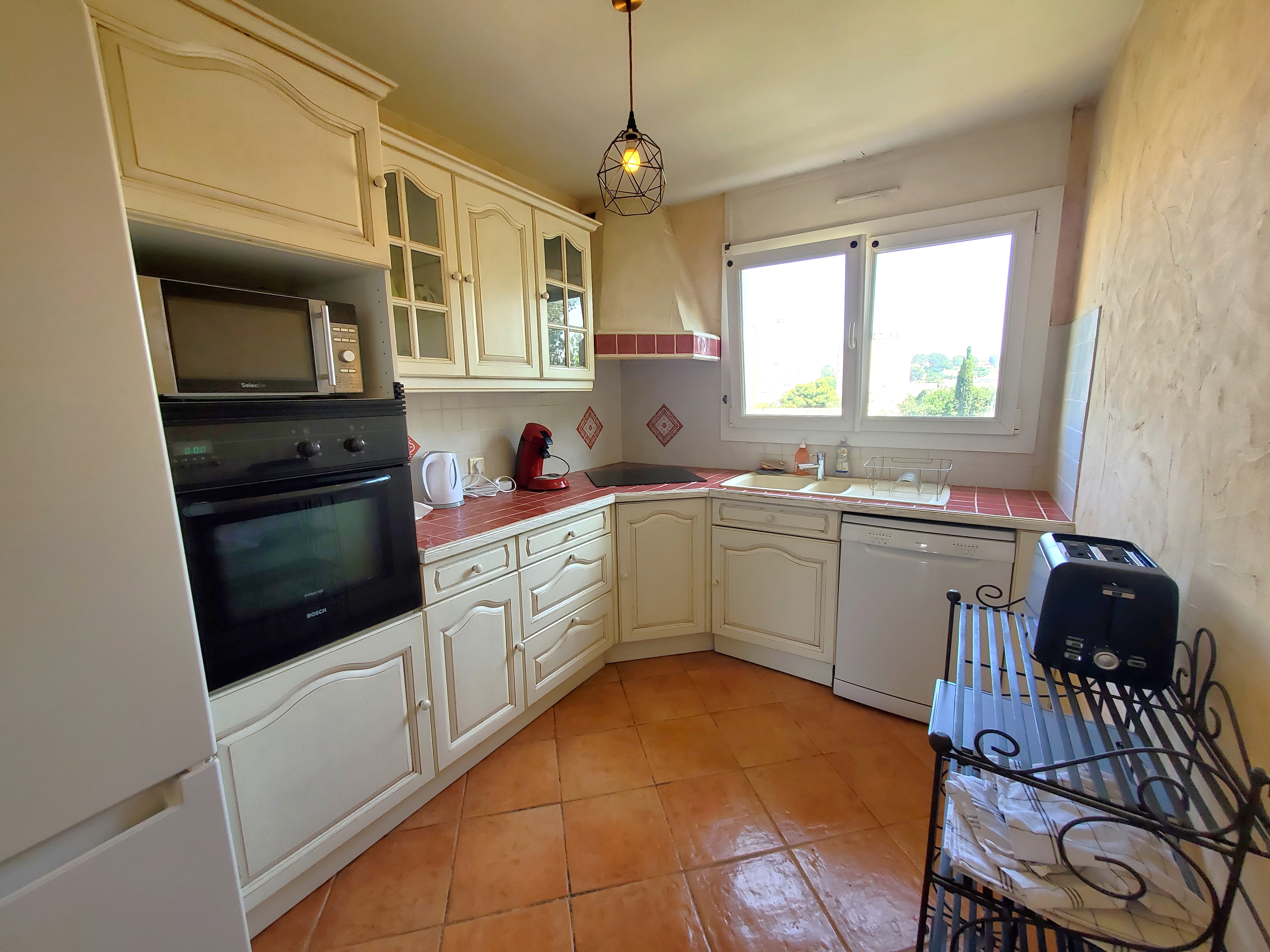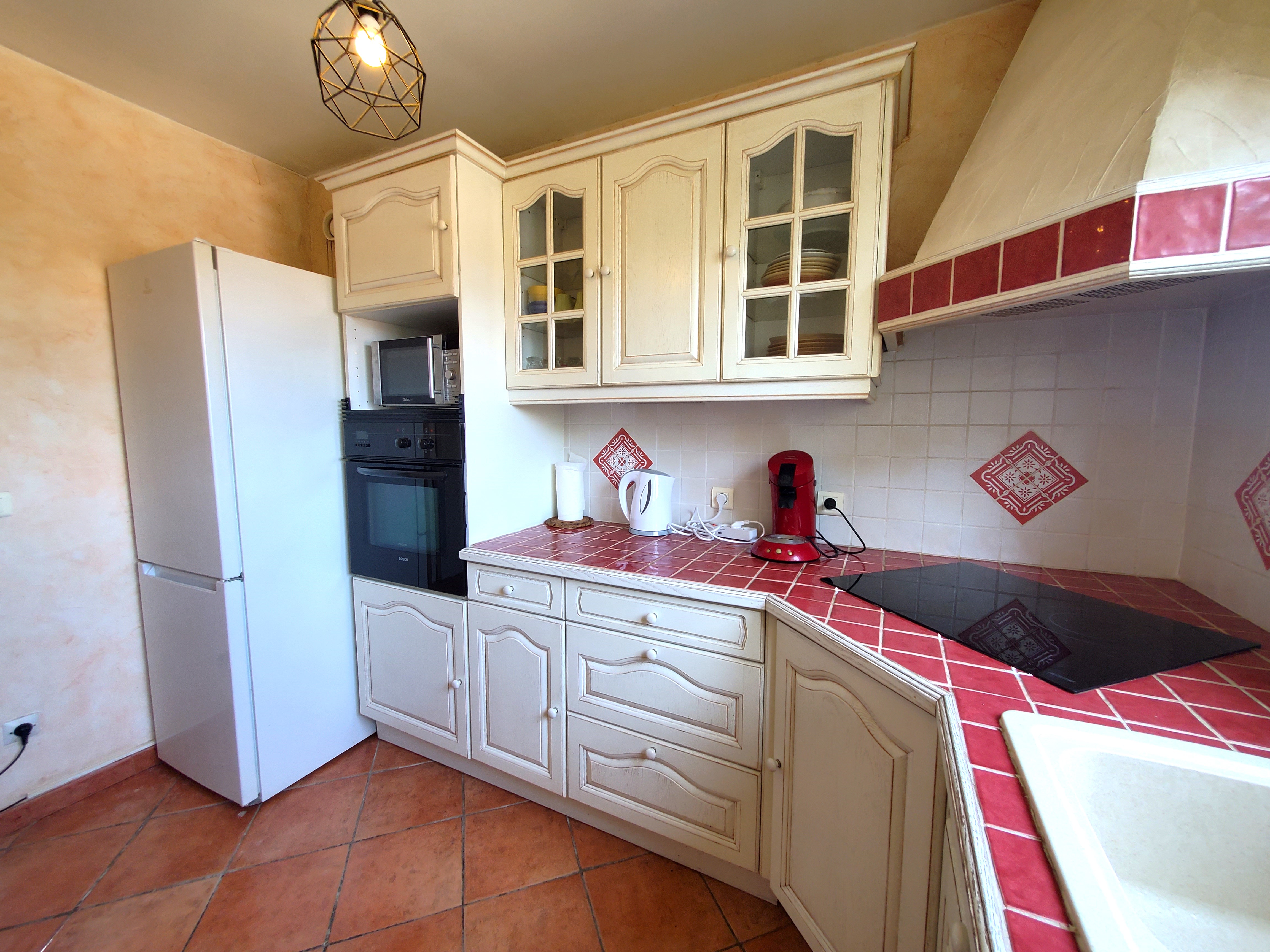 -Lave-vaisselle, plaques de cuisson (3 feux vitrocéramique), hotte aspirante, four, réfrigérateur avec compartiment congélation, cafetière Senseo (dosettes), bouilloire, grille-pain,