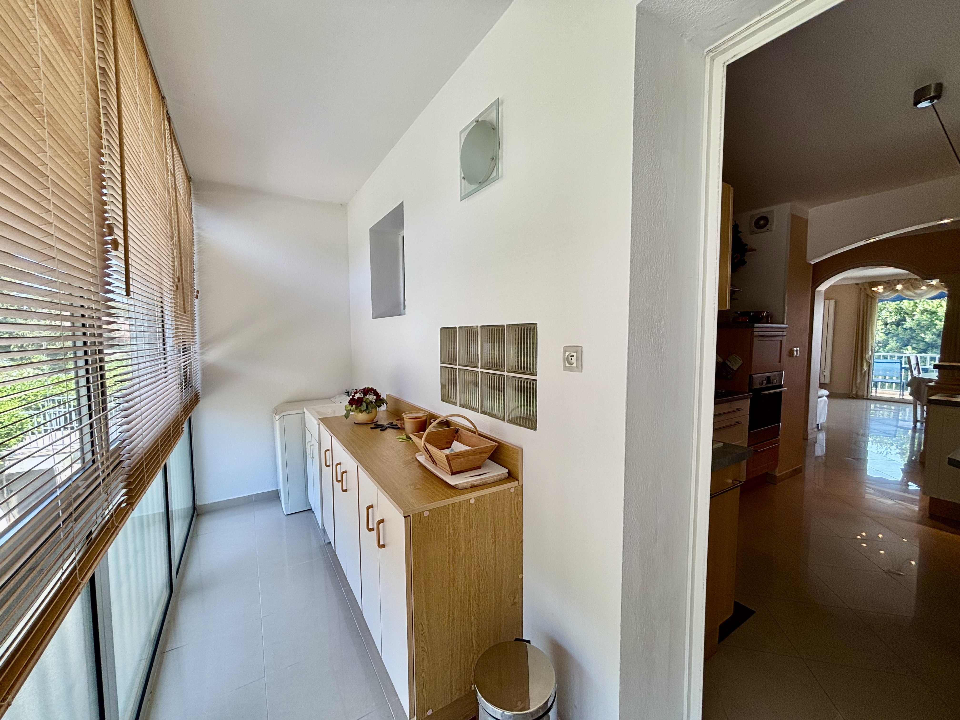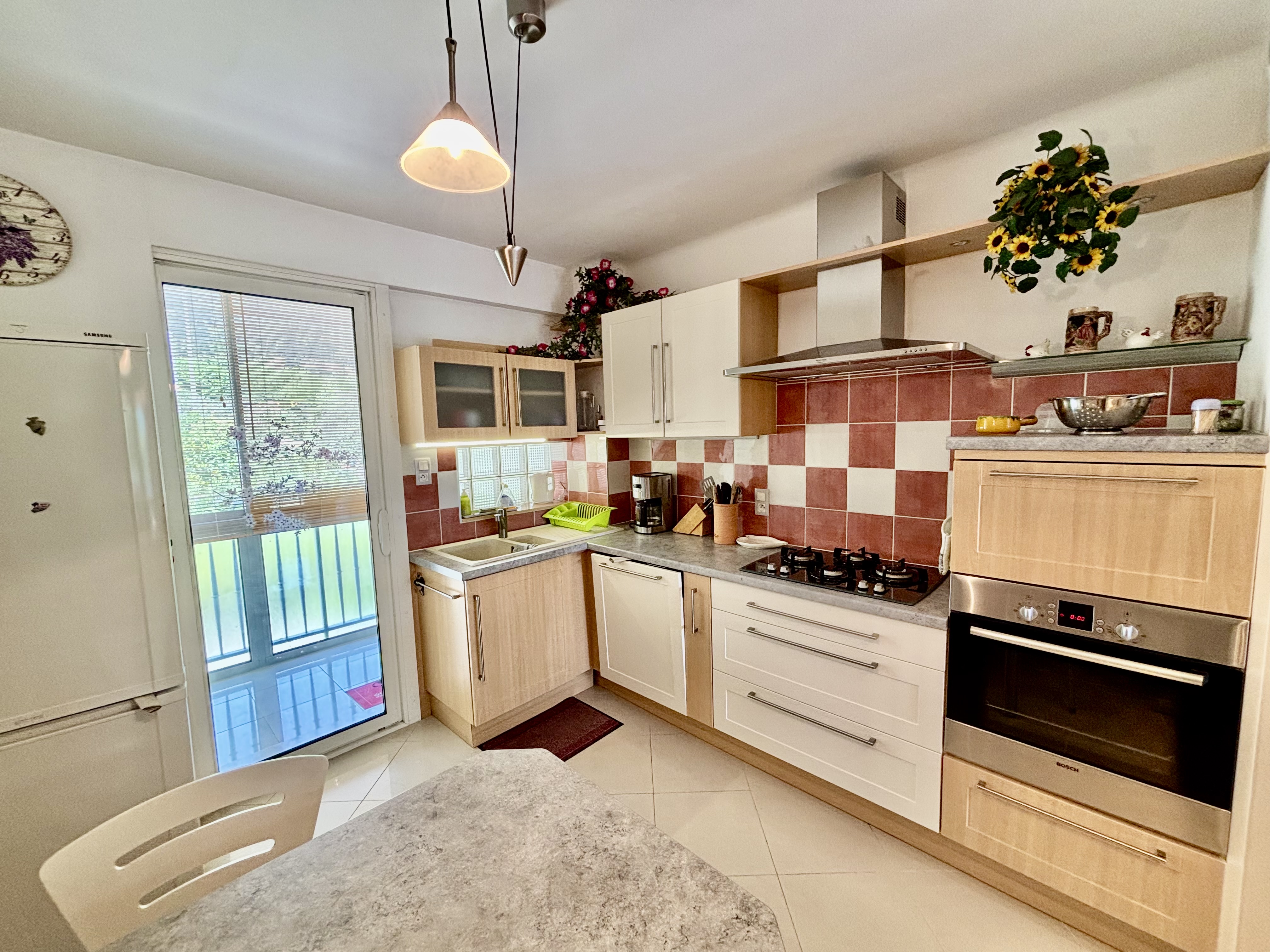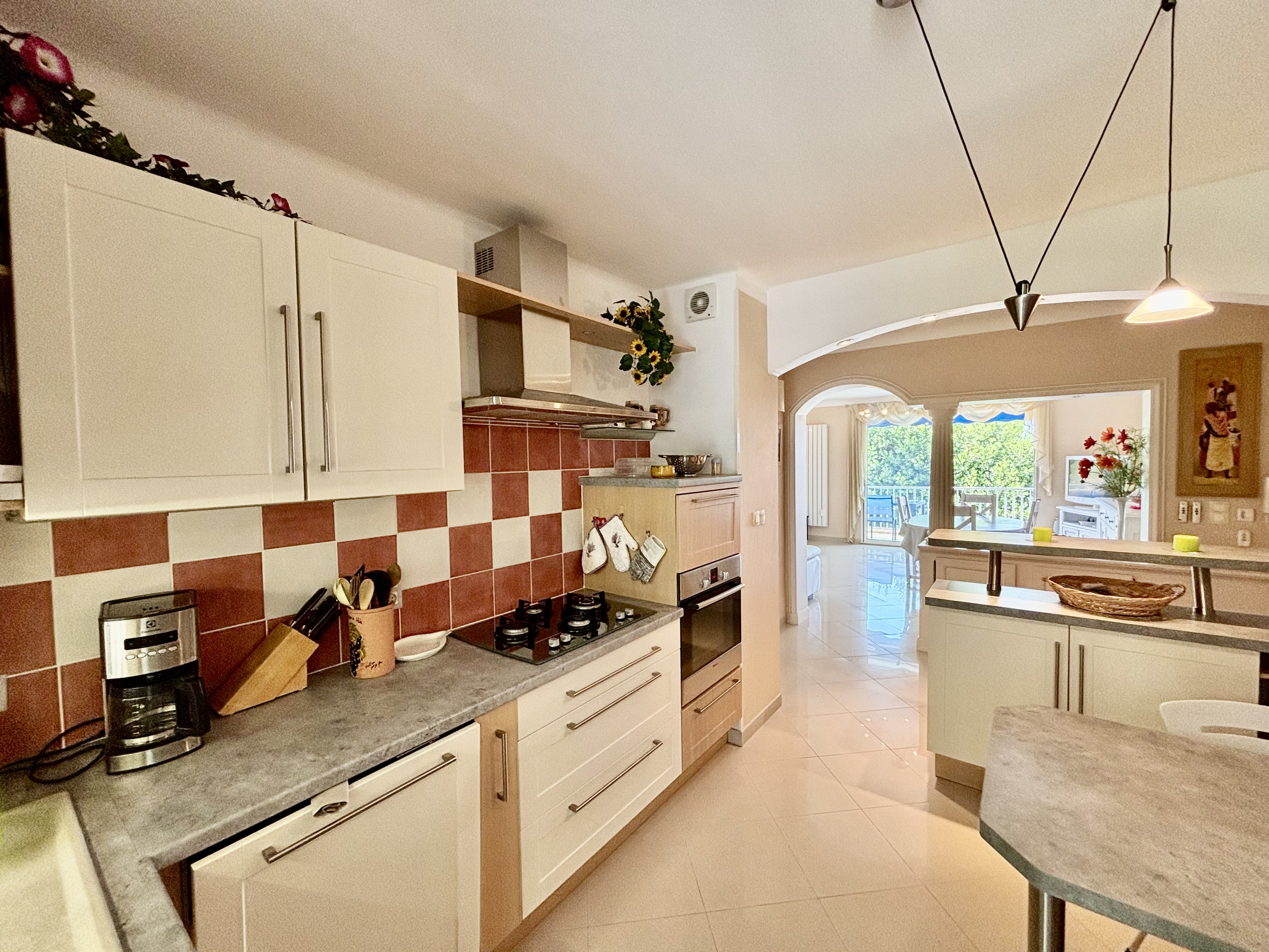 -Lave-vaisselle, plaques de cuisson (4 feux gaz), hotte aspirante, four, réfrigérateur avec compartiment congélation, cafetière, bouilloire, grille-pain