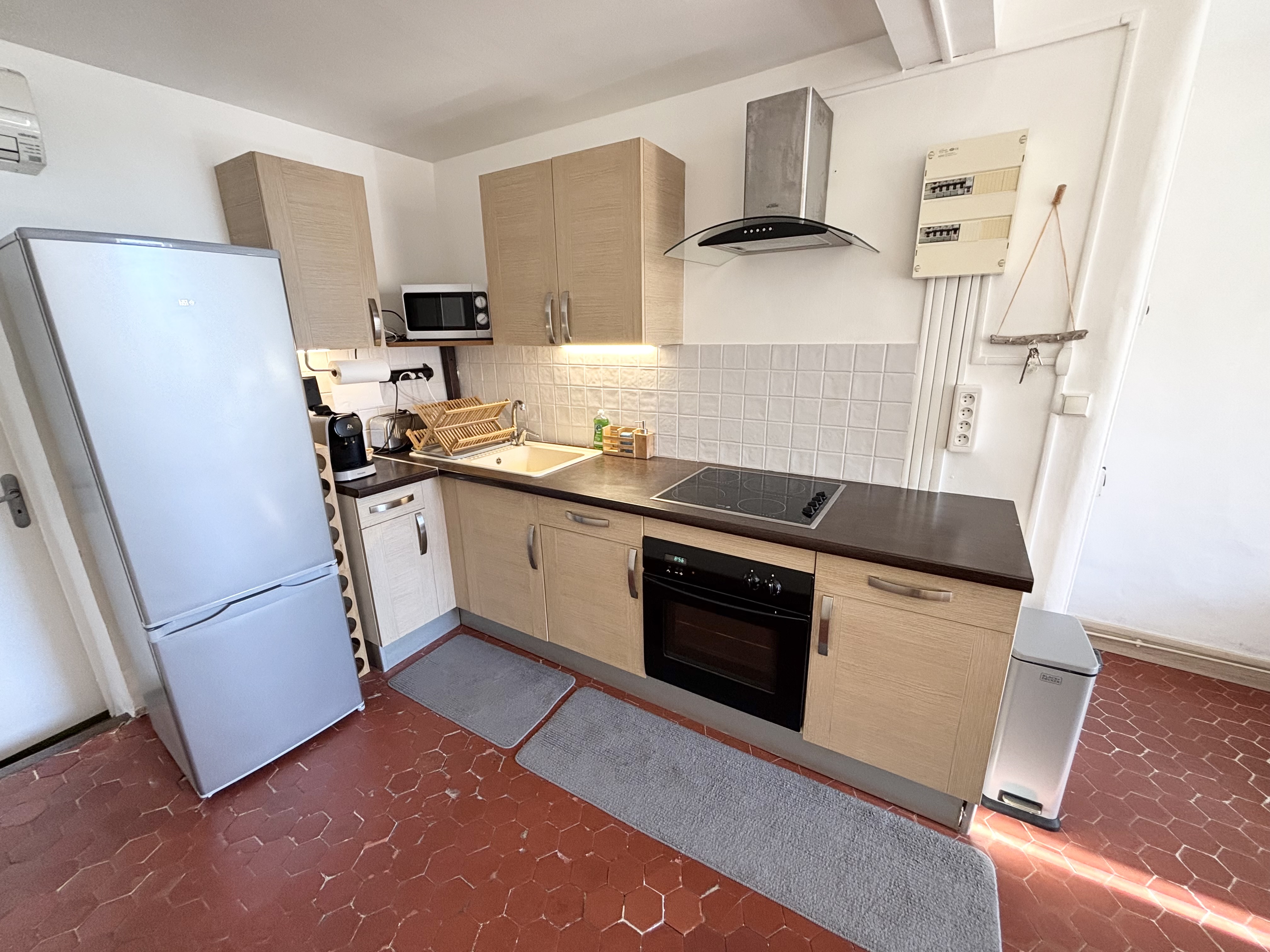 -Plaques de cuisson (4 feux), hotte aspirante, four, microondes, réfrigérateur avec compartiment congélation, cafetière à capsules, bouilloire, grille-pain,