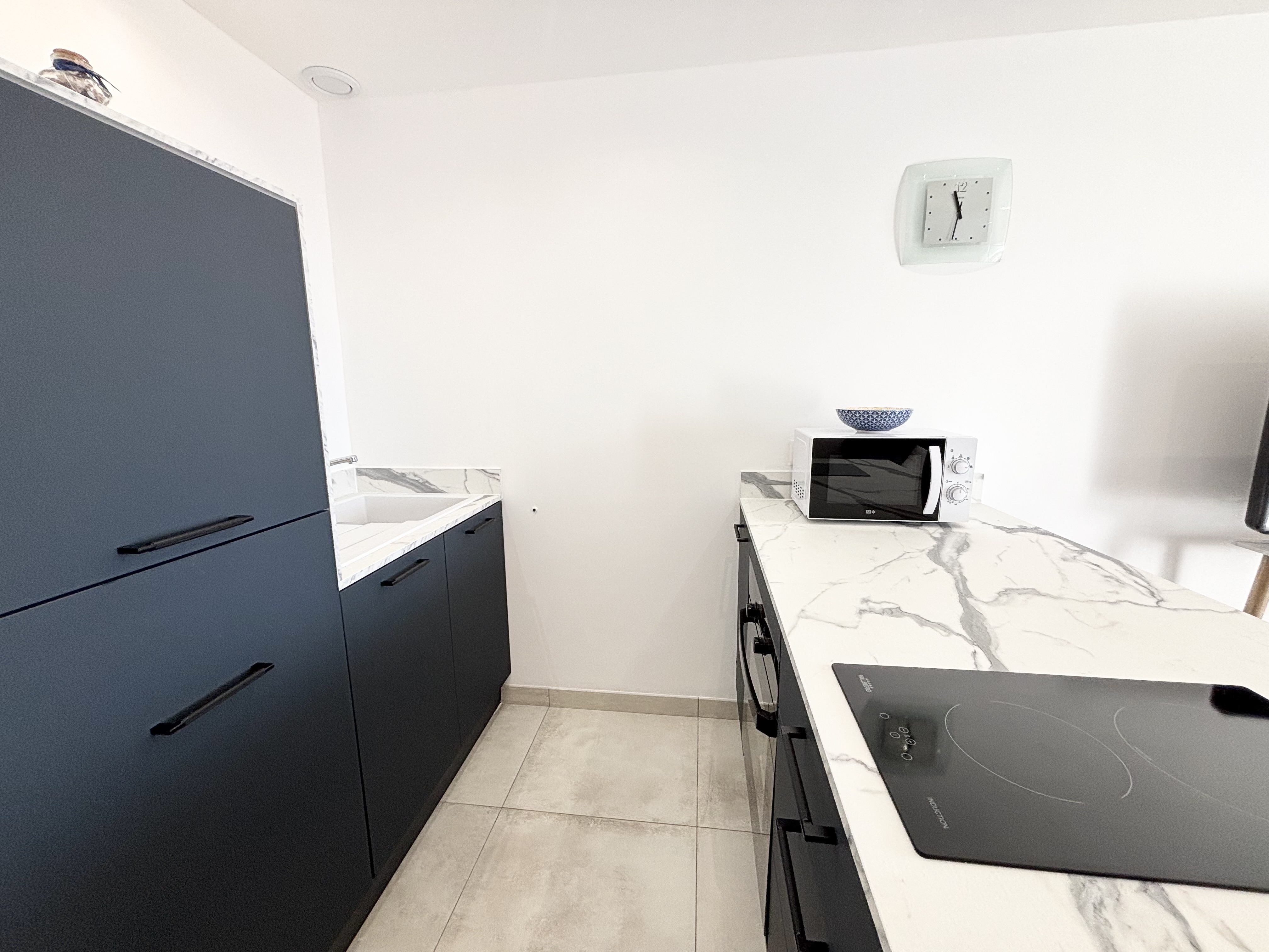 -Plaques de cuisson (2 feux à induction), hotte aspirante, four, microondes, réfrigérateur, cafetière, bouilloire, grille-pain,