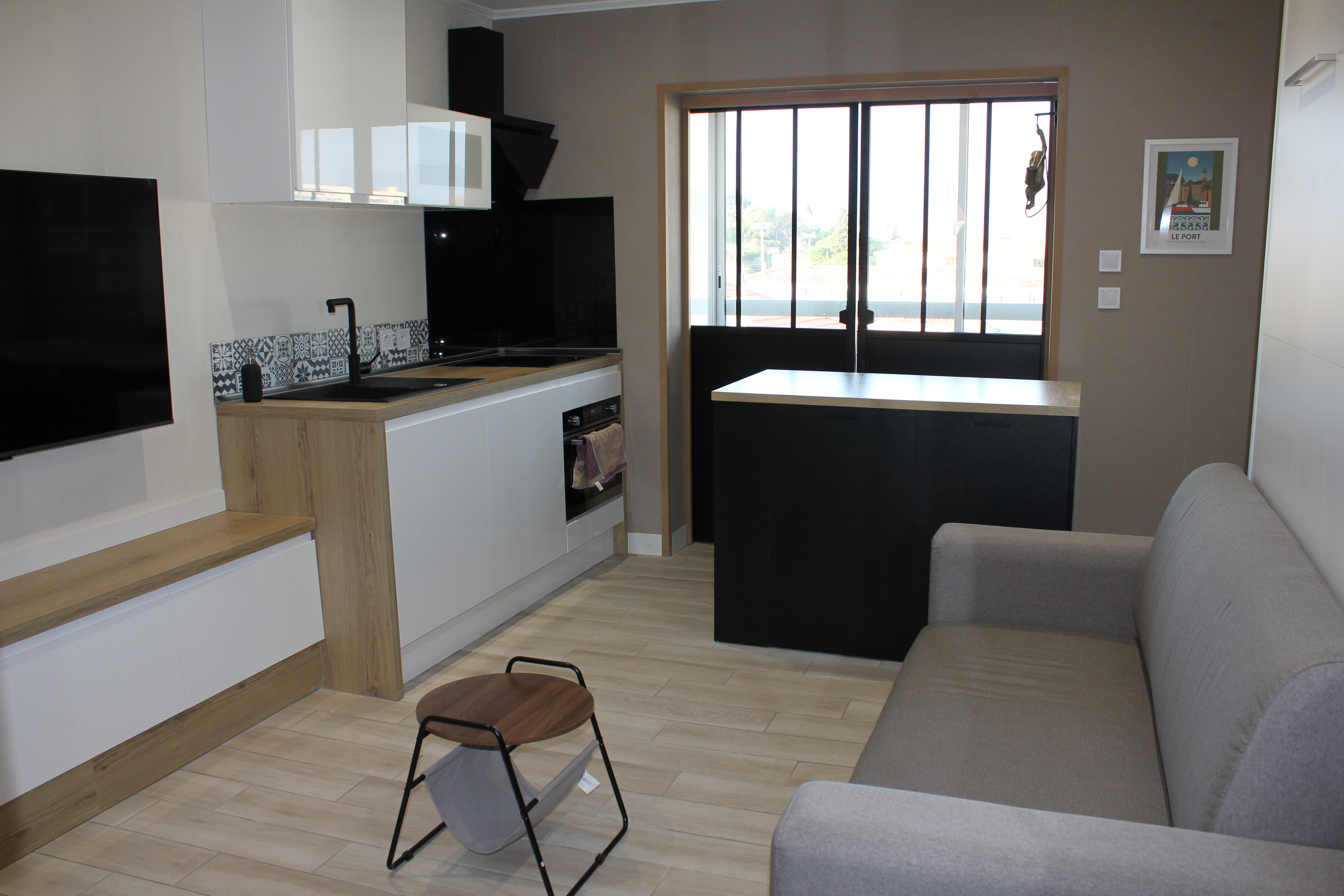 -Plaques de cuisson (induction), hotte aspirante, four, micro-ondes, réfrigérateur avec compartiment congélation, cafetière, bouilloire, grille-pain,